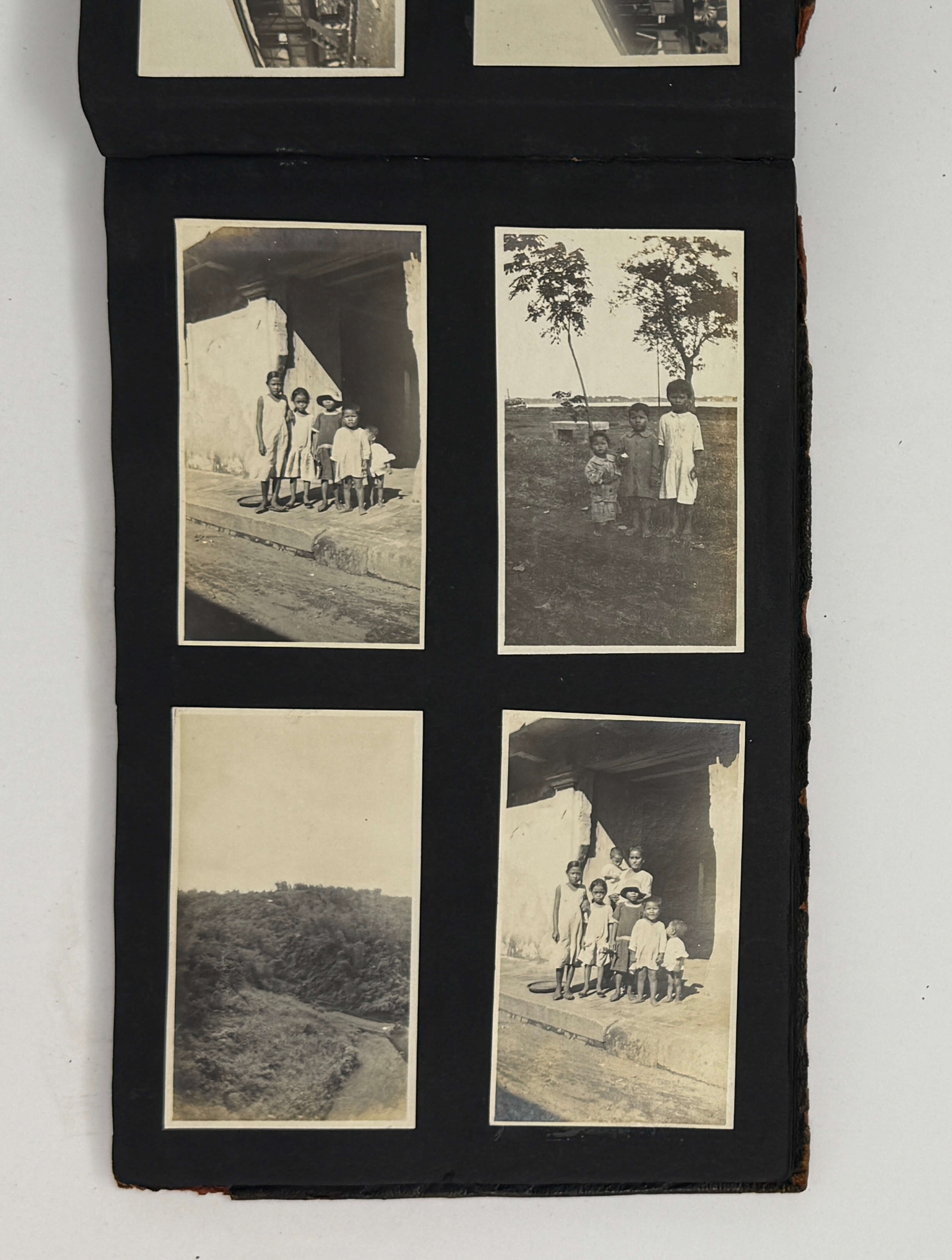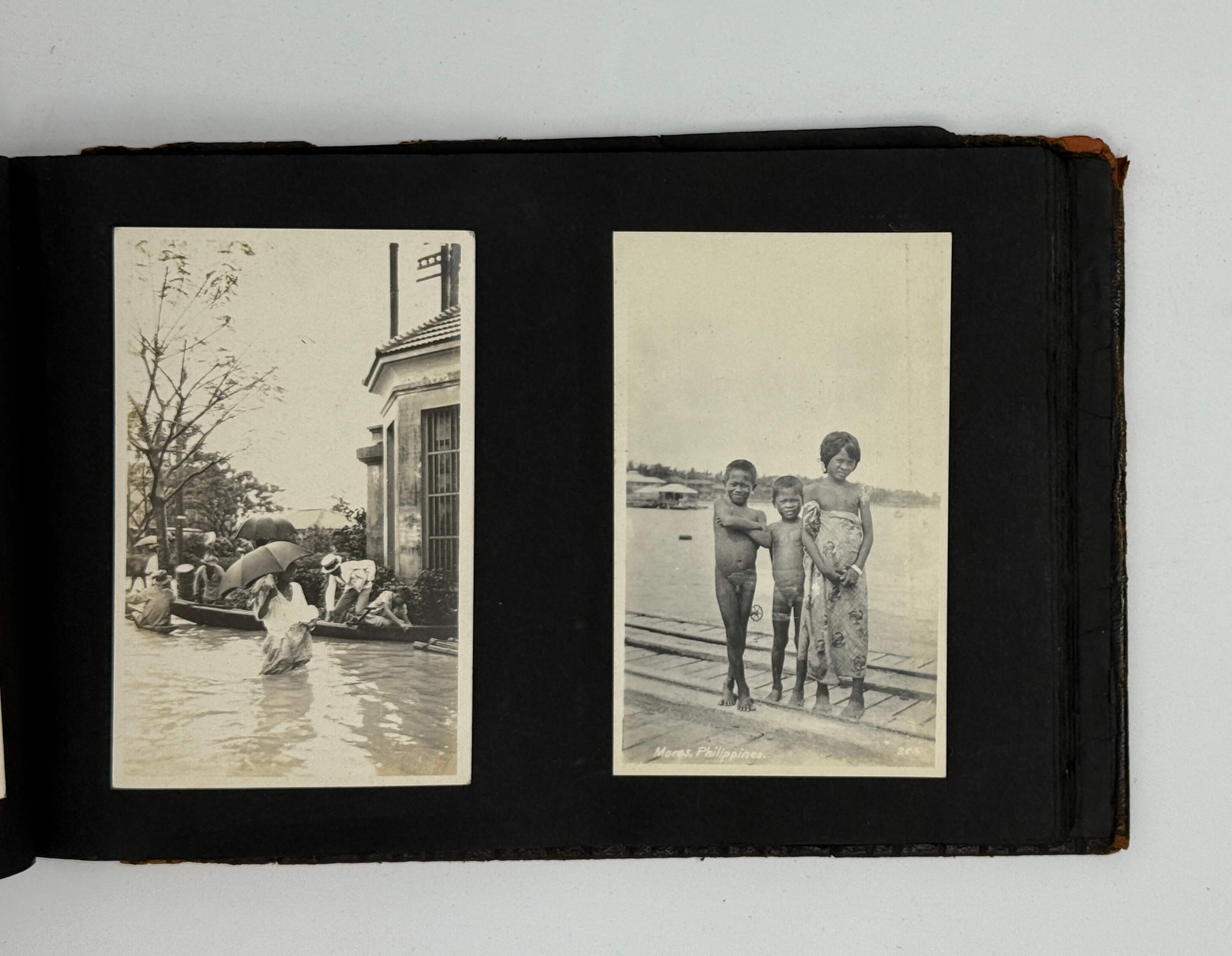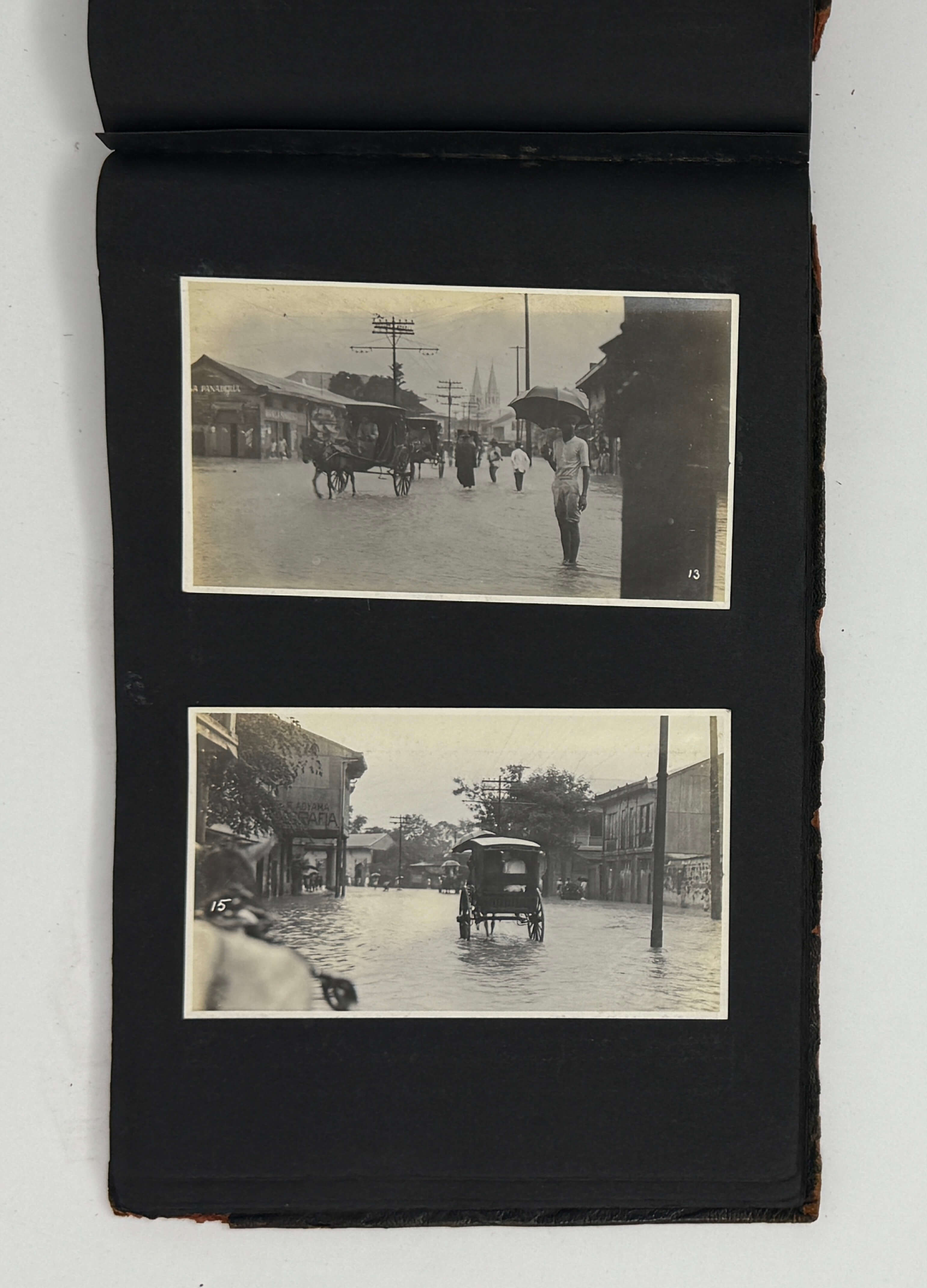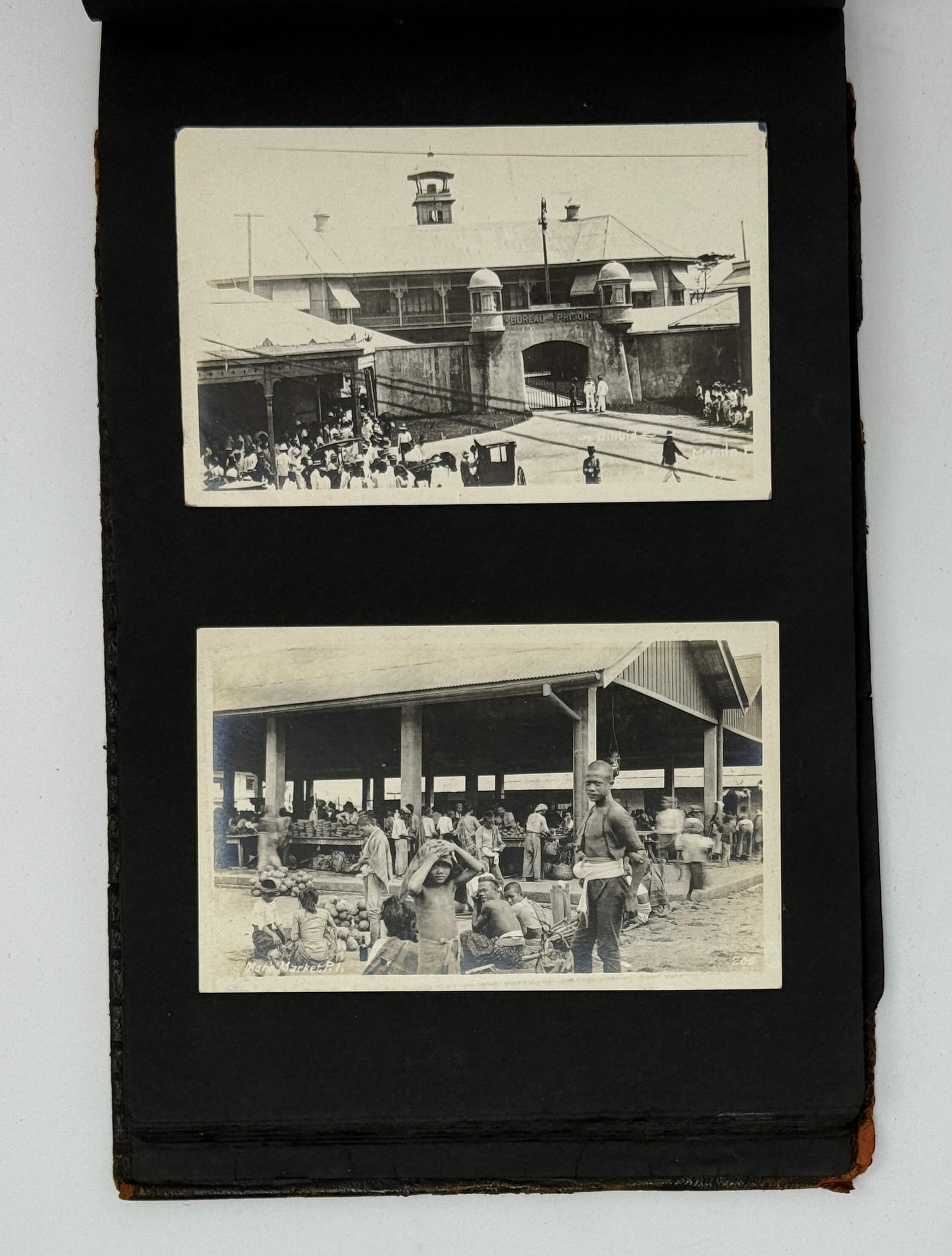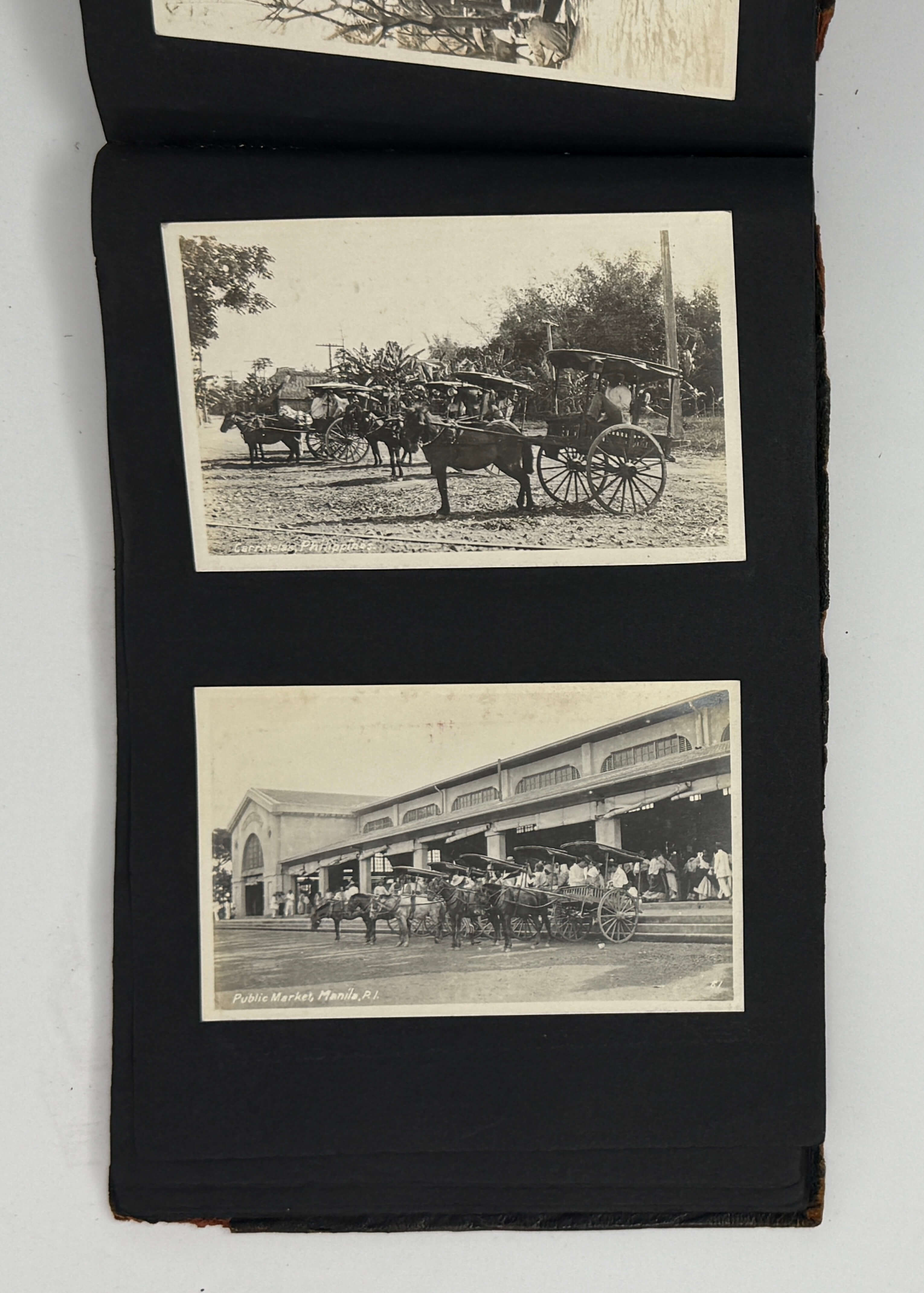 Oblong Quarto album (ca.18x29 cm). 38 paper album leaves (19 blank) . With ca. 90 mounted original gelatin silver photographs and 2 postcards from ca. 14x8,5 cm (5 ½x3¼ in) to ca. 10,9x6,5 cm (4 ¼ x 2½ in). Some photos with period caption in negative, citing ‘Banzon photos’, likely a local studio, the others without captions.