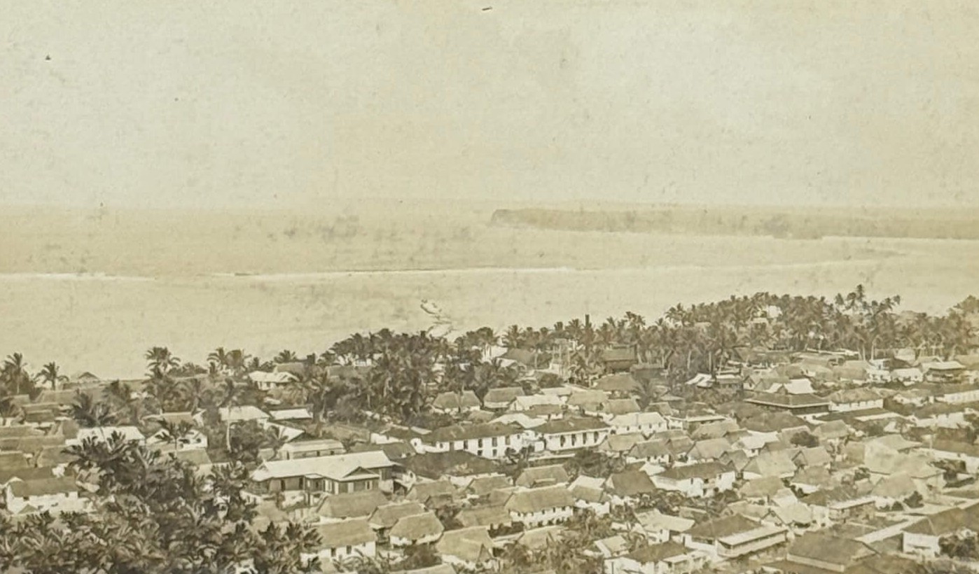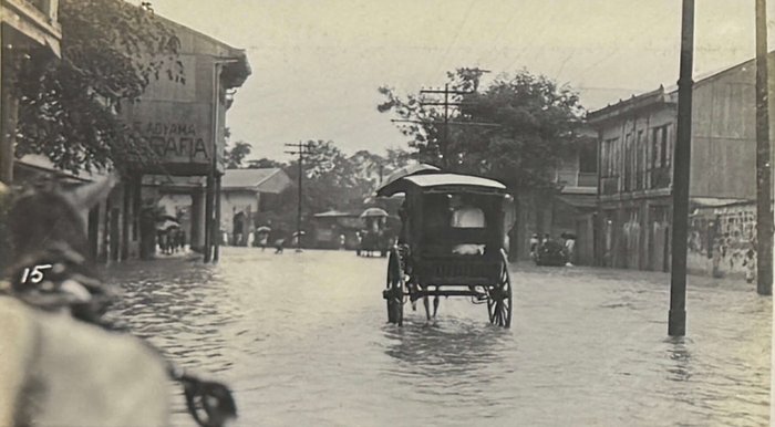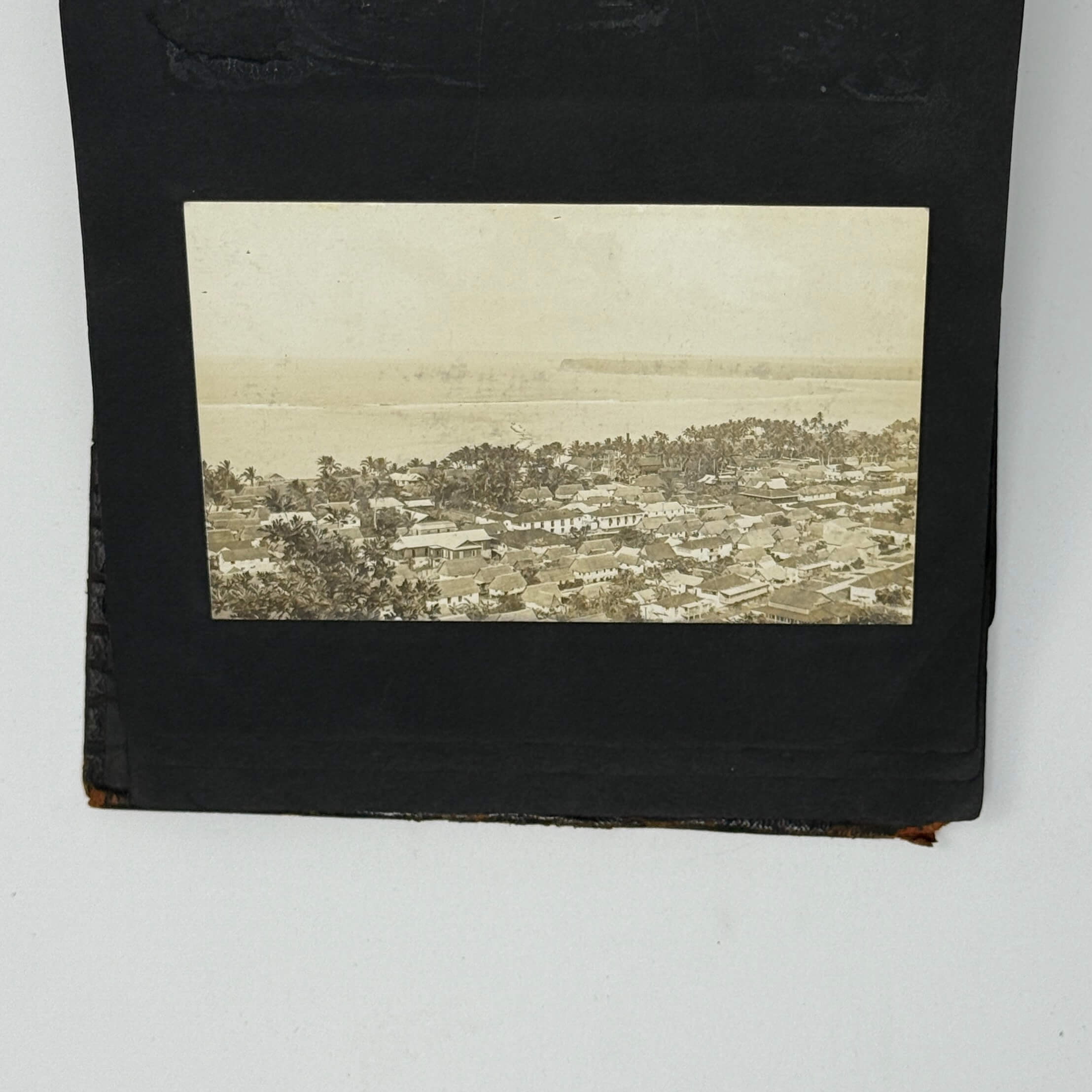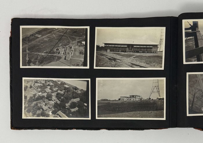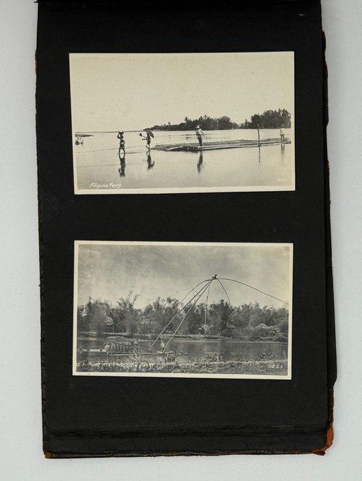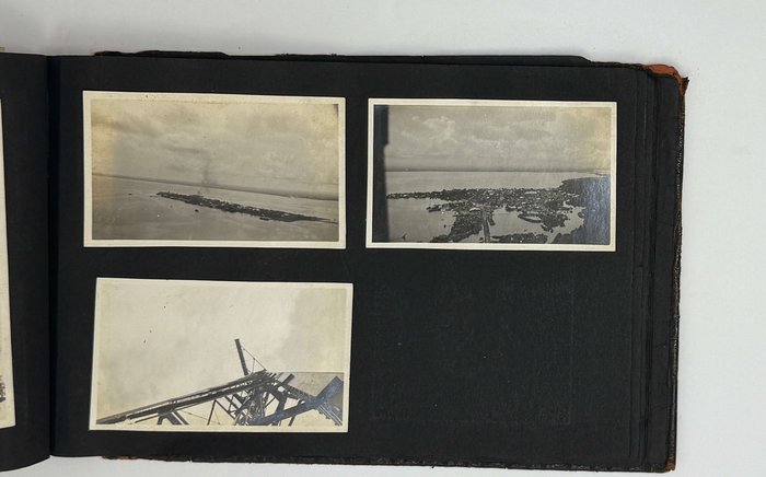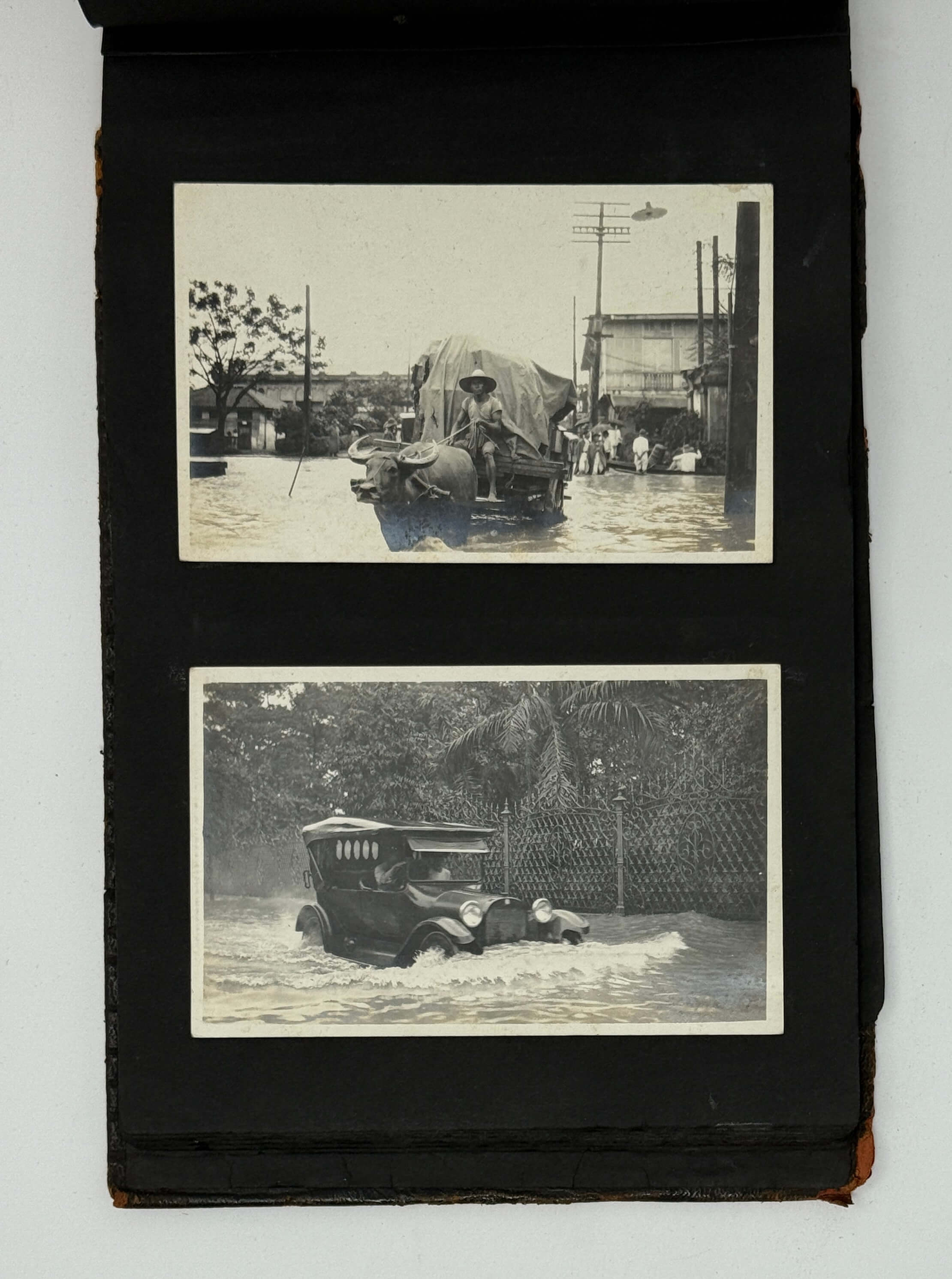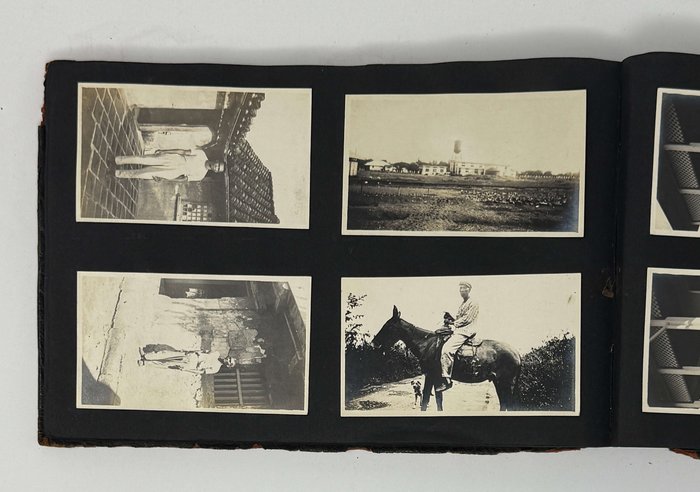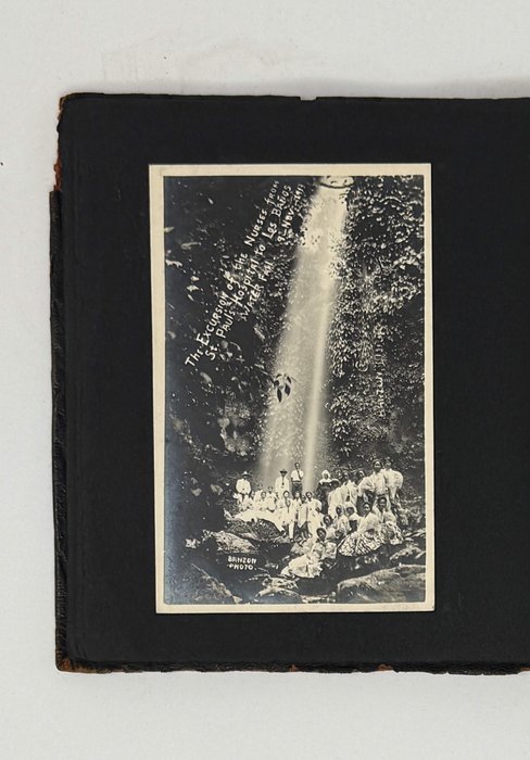 Oblong Quarto album (ca.18x29 cm). 38 paper album leaves (19 blank) . With ca. 90 mounted original gelatin silver photographs and 2 postcards from ca. 14x8,5 cm (5 ½x3¼ in) to ca. 10,9x6,5 cm (4 ¼ x 2½ in). Some photos with period caption in negative, citing ‘Banzon photos’, likely a local studio, the others without captions.