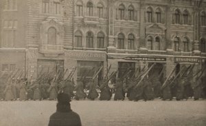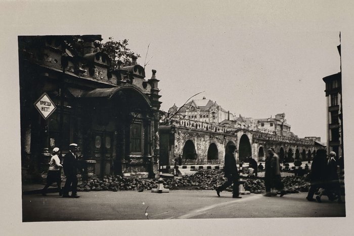 Moscow photos include two photos of the Red Square, photo of the dismantling of the Kitay-gorod wall in Moscow, street view with Sukharev tower in Moscow, demolished in 1934, the photo of the curious wooden sculpture in Alexandrovskiy garden in Moscow, showing the hanged Nicolas II carved into a tree.