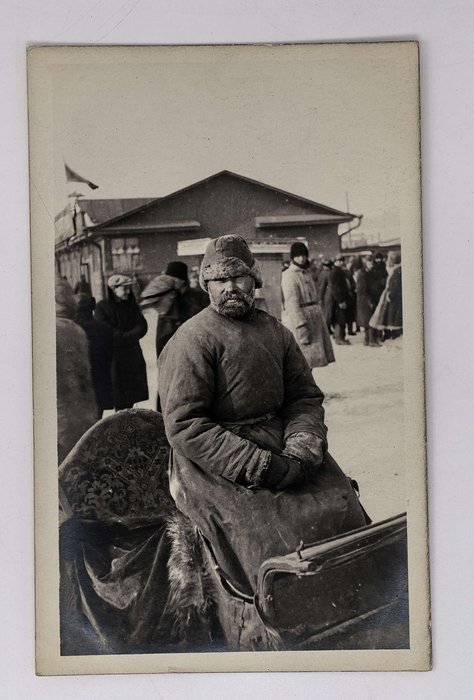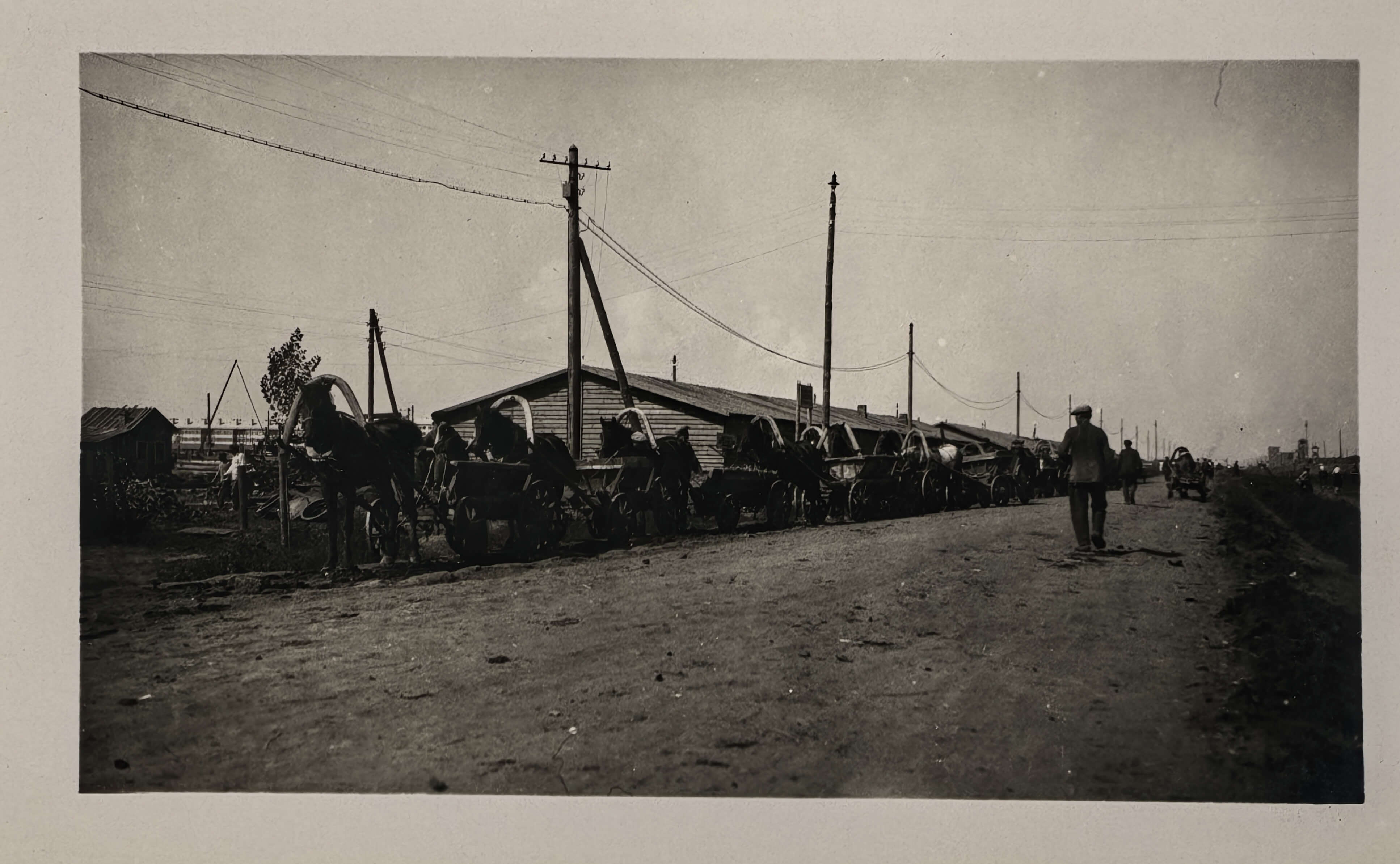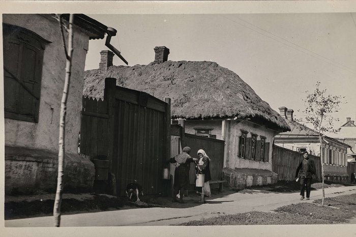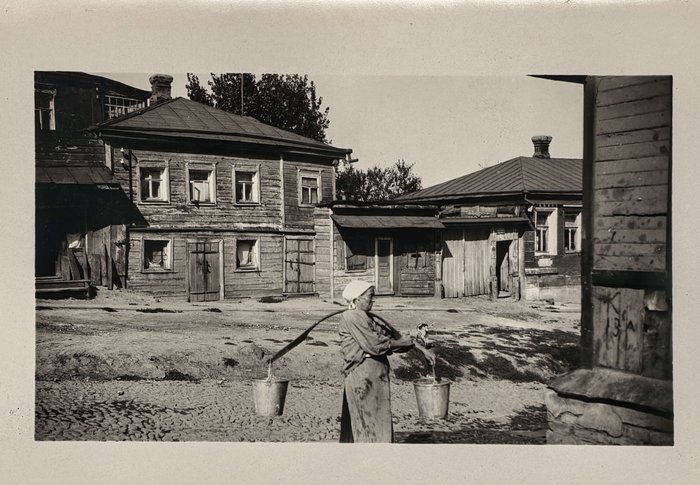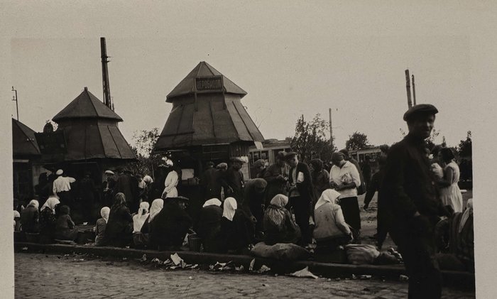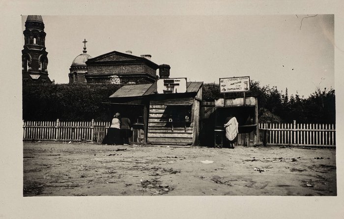 Albums show street scenes like Tserobkoop (Central Workers’ Cooperative) stalls with people lining up to obtain supplies, marked by puddles of water, four peasant women facing the camera with a water pump and a pile of bricks for masonry in the background, twelve horse-drawn carts delivering building materials, a poster advertising the cooperative “Tsymbalist” with a church in the background, against the backdrop of the constructivist windows of one of the buildings, a woman is depicted carrying two buckets on a yoke, and a man is leading two oxen in a harness.