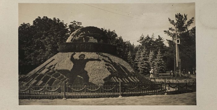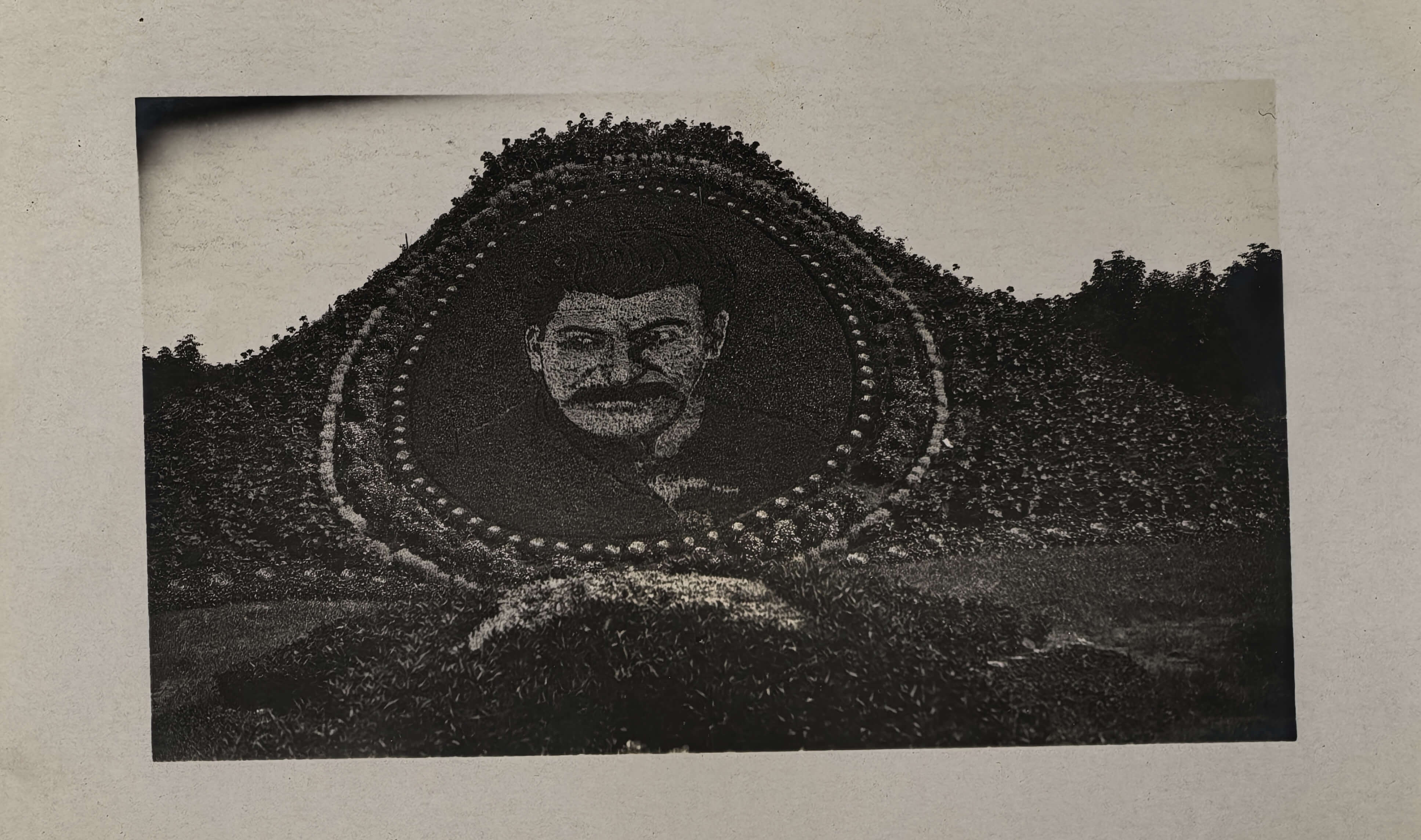Kharkiv city scenes and architecture: the Chapel of Saint Panteleimon the Healer at the Vladimir Gates, dismantled in 1934, two photographs of Kharkiv University, four photographs of a floral sculptural composition depicting a revolutionary soldier and portraits of Stalin, Lenin, and Stanislav Kosior (head of the Communist Party in Ukraine), all trimmed into a flowerbed, views of the Uspensky Cathedral and an overlook of Universitetskaya Street in Kharkiv, two photographs of the racetrack near the Kharkiv Aviation Plant, three photographs showing the Kharkiv city center during rush hour with people boarding trams and a horse-drawn carriage overtaking one of them, including one image showing St. Nicholas Cathedral shortly before its bombing and demolition in 1930 and another image at the end of the album showing the street view with St. Nicholas Cathedral in the distance, eleven images of newly built apartment blocks in the constructivist village constructed to house workers of the Kharkiv Tractor Plant, one captioned “our front yard in Kharkiv” and showing a construction pit with laundry hung out to dry across it as one of the first Sotsgorod quarters in the USSR; a Red Army parade on a central Kharkiv street with shop signs in Ukrainian visible, a photograph of tram no. 18 heading to the Kharkiv Tractor Plant, Robkoop KHTZ no. 11 (the cooperative grocery store for Tractor Plant workers), three photographs showing Derzhprom in snow, one of the first constructivist skyscrapers in the USSR completed in 1928, four photographs of windmills in open fields, and five images showing an abandoned monastery together with two images of a church interior, likely from the same complex, with remnants of frescoes and barrels stored inside, reflecting the common fate of religious buildings repurposed for storage prior to demolition in Ukraine and Russia during the 1930s.