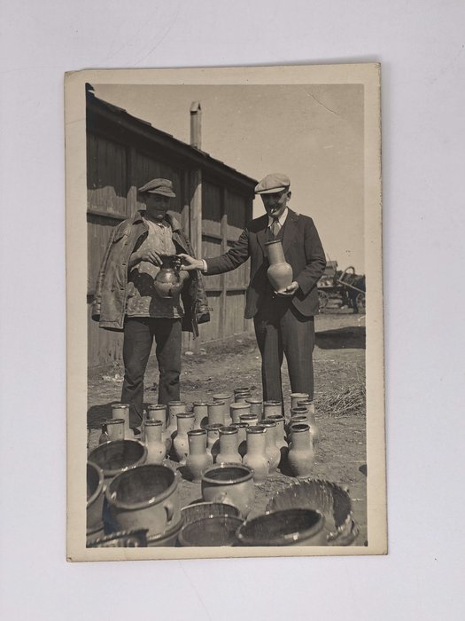 Nine photos of the local market with the signage for the shops and textual agitation posters showing, with Khatorg union kiosk on other photo, the beer sign (both in Ukrainian). The alleged complier of the album buying some clay pots of a local merchant at a street market.