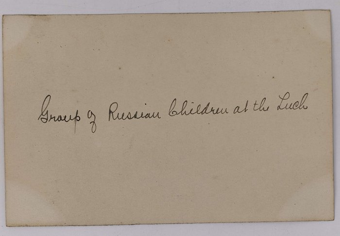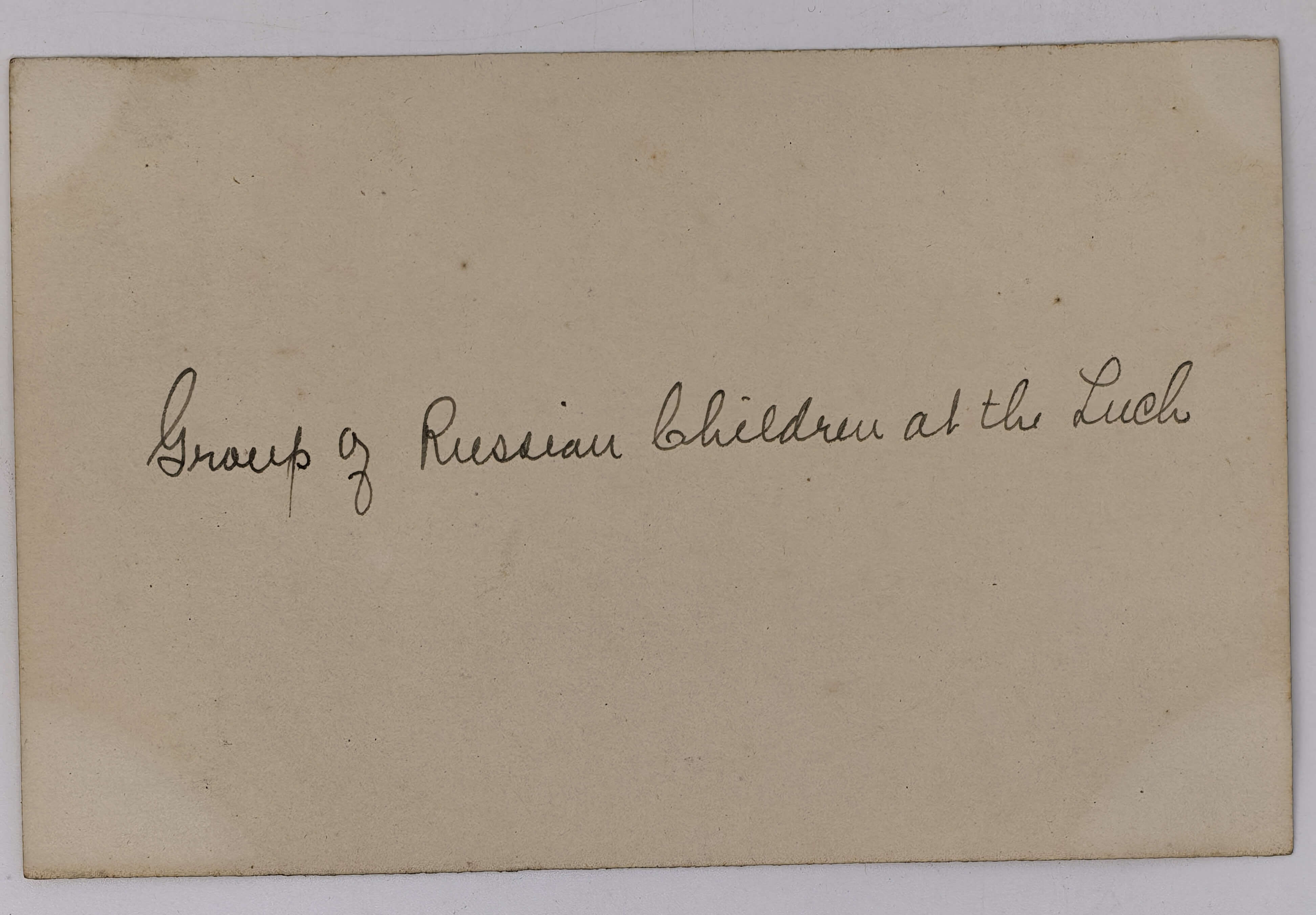 Photos of local residents, including three women washing clothes in a stream, a group portrait of four women and two men seated around a festive dinner table, women posing in a kitchen beside a stove, two photographs captioned “Group of Russian Children at the Luch,” three photographs of children bathing in a local stream, a young woman reading a newspaper, a portrait of an izvozchik, a bearded cab driver riding a horse-drawn carriage, nine photographs showing American specialists socializing, drinking, and dancing with local women, including one image of an older woman standing beside a loaf of bread she presumably baked, and five group photographs of local children on the streets.