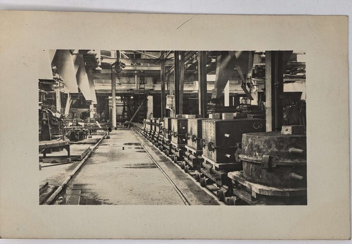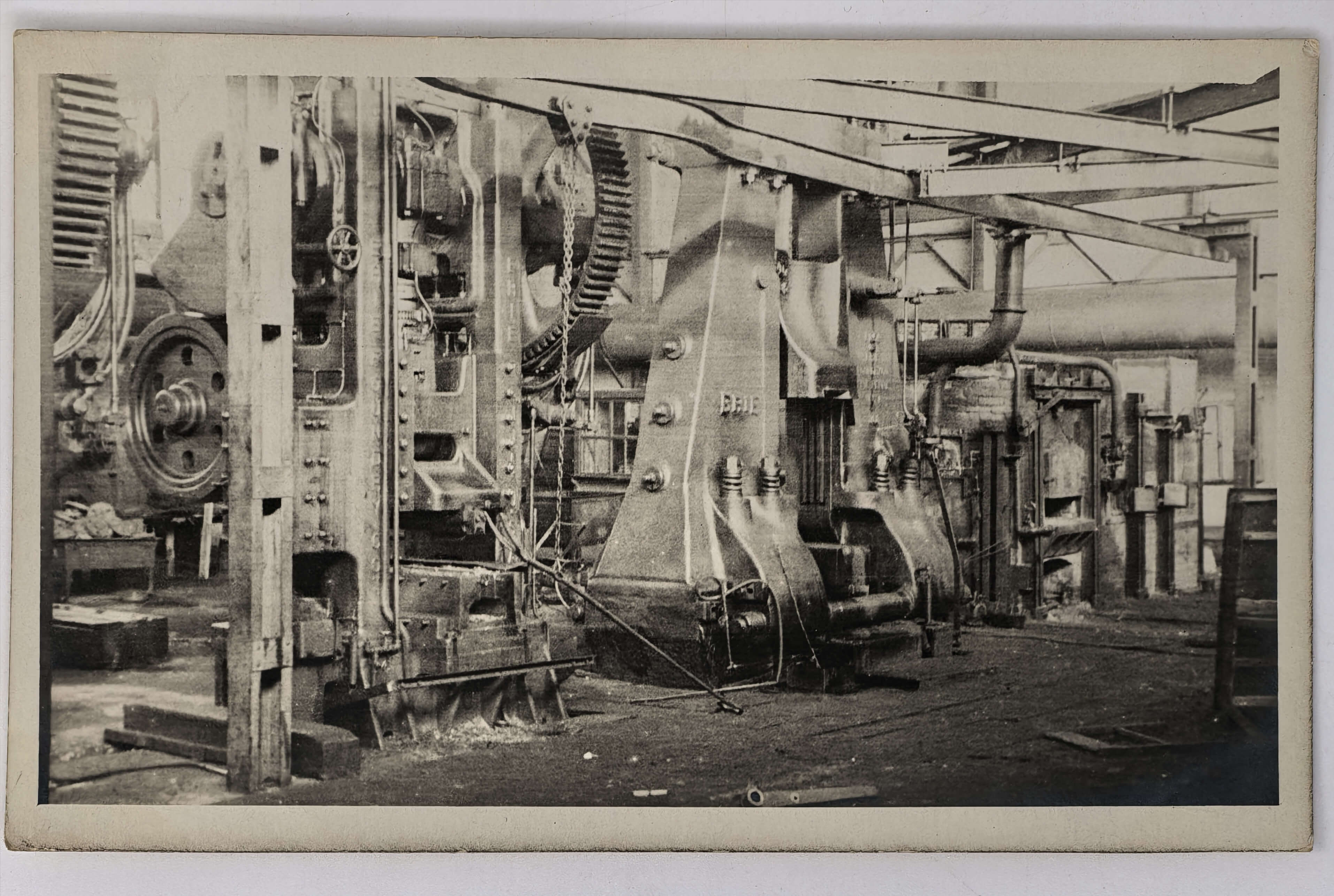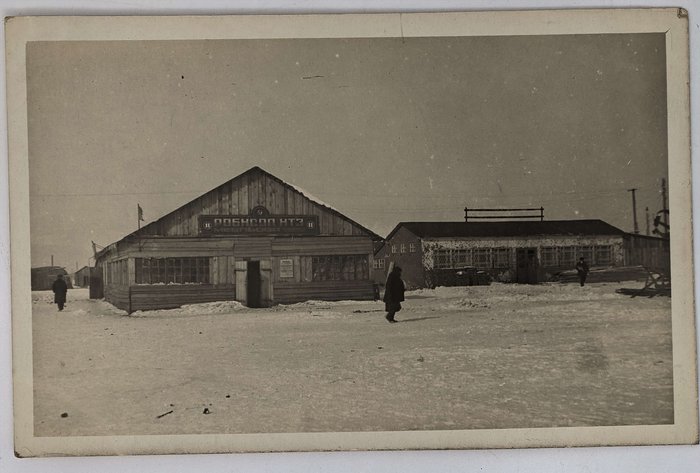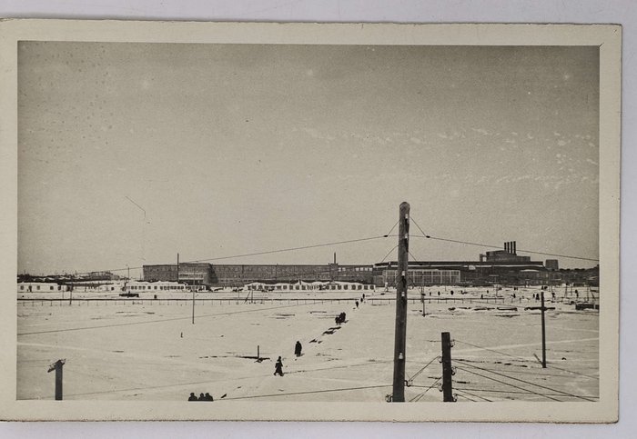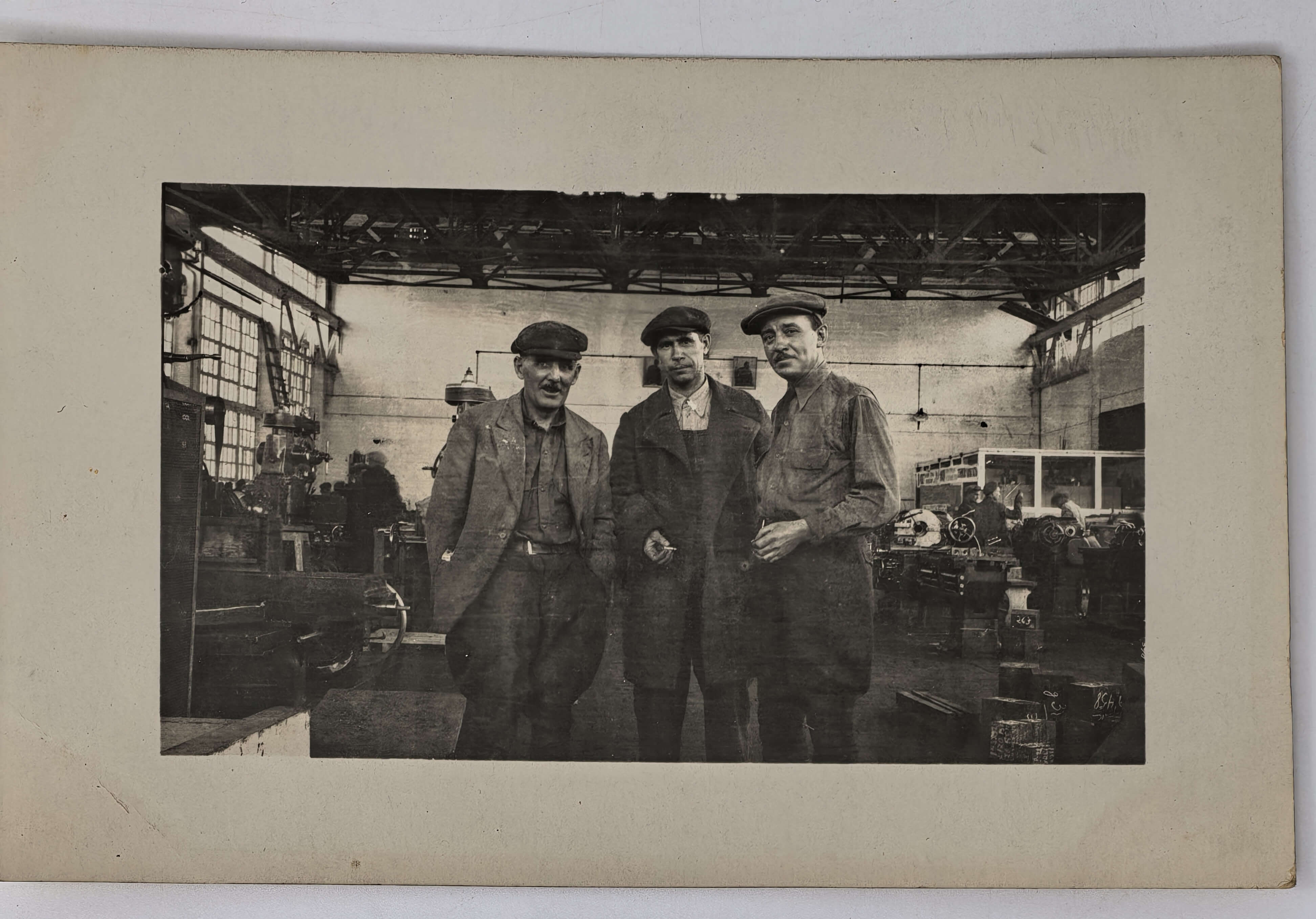 Industrial photos in the album : Two photos of the 10 men, in jackets and flat hats, posting together next to a plant; electromechanical plant in Kharkiv, with signage and the advertisement board telling about the achievements of the plant; seven photos of industrial interior of the plant; four photos showing the Americans outside of ‘Korpus number 7’ presumably of Tractor Plant, their main place of work, the canteen of the plant, hospital ward with beds being made and a portrait of Stalin overlooking the ward