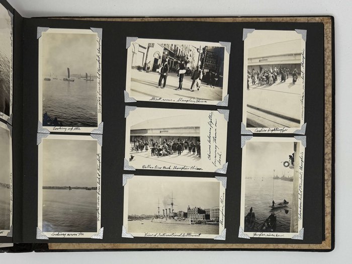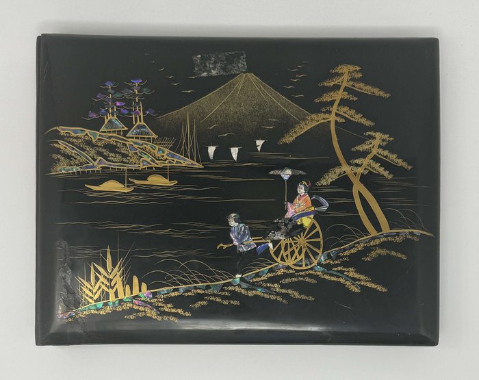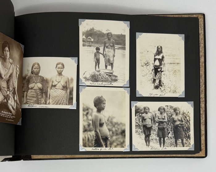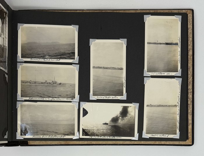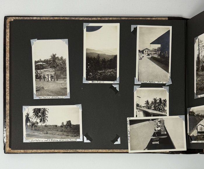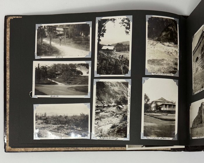 Oblong Folio album (ca. 27,5x36,5 cm or 11x14 in). 25 card stock leaves (11 blank). With 128 mounted original gelatin silver photographs, from ca. 10x12,5 cm (4x5 in) to ca. 6,5x11 cm (2 ½ x 4 ¼ in). All but two photos with period ink manuscript captions on the margins. With two mounted postcards (one real photo and one printed), both ca. 8,5x13,5 cm (3 ¼ x 5 ¼ in), both with studio captions on the margins. The printed postcard with a period manuscript text and address on verso. Period Japanese lacquered album with a brown gilt-tooled spine. The front board with a gilt-painted scene showing a rickshaw driver carrying a geisha and a typical Japanese landscape in the background (Mount Fuji, sea coast with boars and a temple, a Japanese pine, &c.); the scene is decorated with pieces of mother-of-pearl. Binding slightly rubbed on extremities, several images with creases on the margins, one with a minor tear, two photos possibly previously removed from the album, a few photos mildly faded, but overall a very good album of interesting photos.