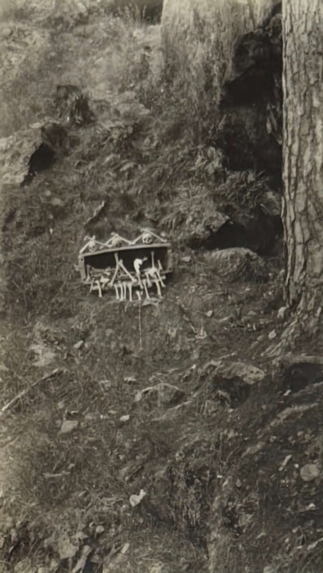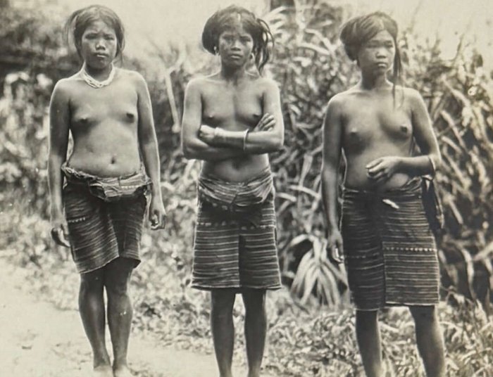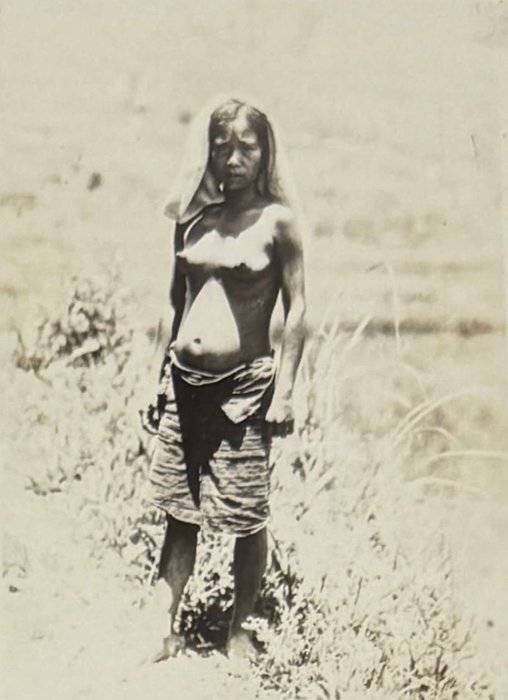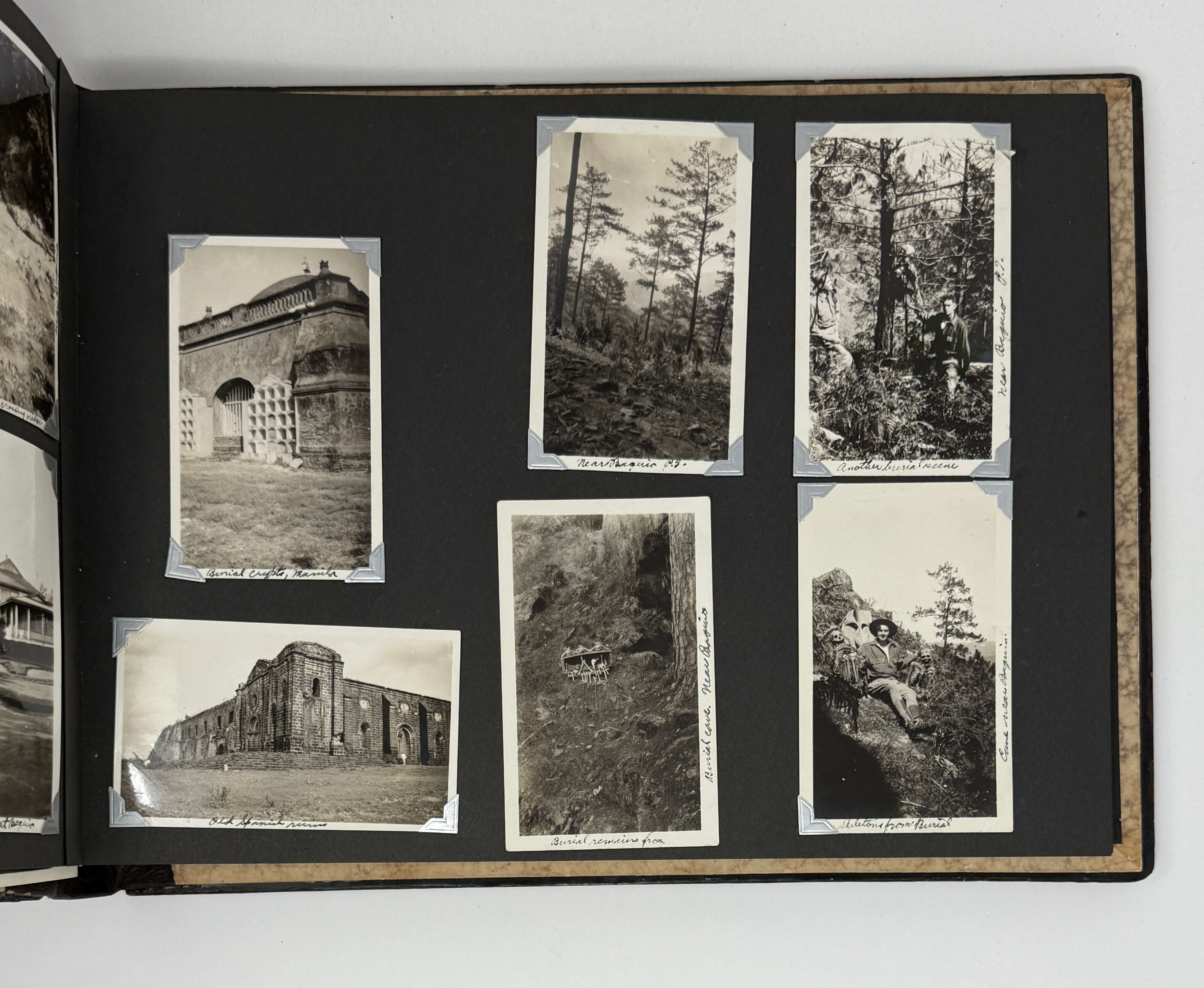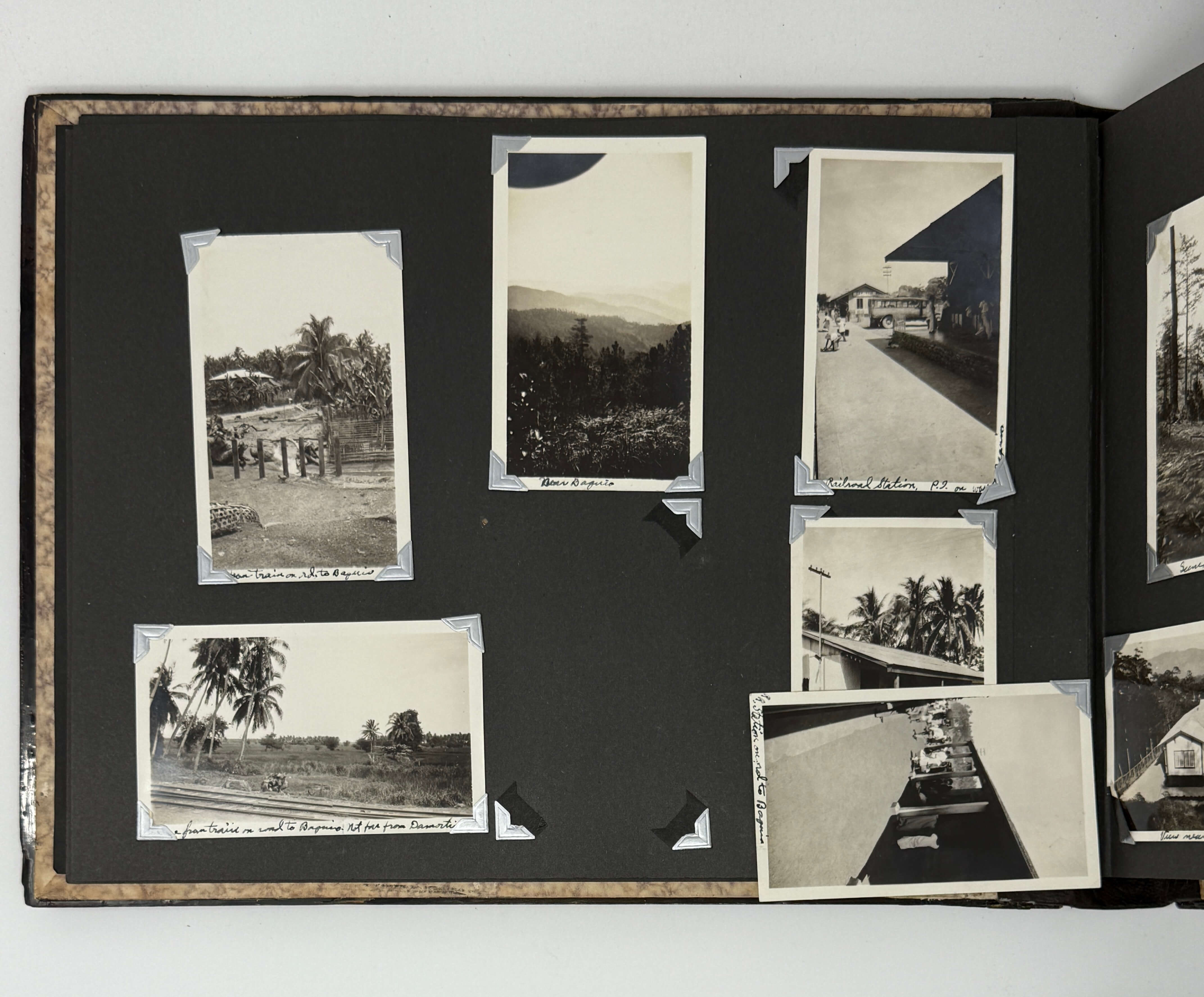 The album also contains about twenty-five photos of the U.S. hill station of Baguio in central Luzon Island, including several views taken from the train on the way to town (railway station in Damortis and others), images of “Army Hospital at Baguio,” bungalows, rooftops and famous local pines, “scene from road to Antamoc mine near Baguio” (Antamok gold mine, near Itogon town southwest of Baguio), “Filipino dwellings, Antamoc gold mine near Baguio,” three photos of traditional Filipino burial sites with the remains laid in between tree branches or special structures on the mountain side, mountainous scenery, &c. Five images portray native Filipino women and girls in traditional outfits (“Ifugao girl,” “native washing clothes,” “Filipino girls,” &c).