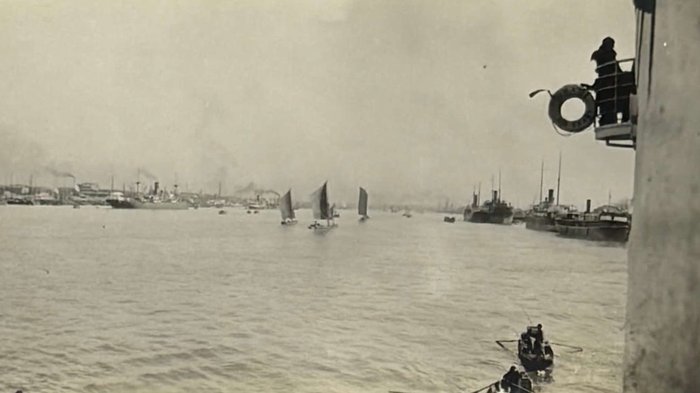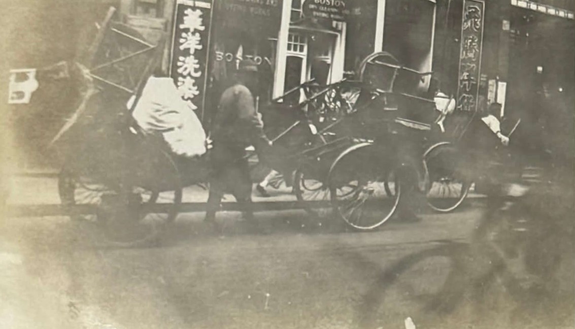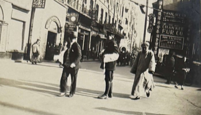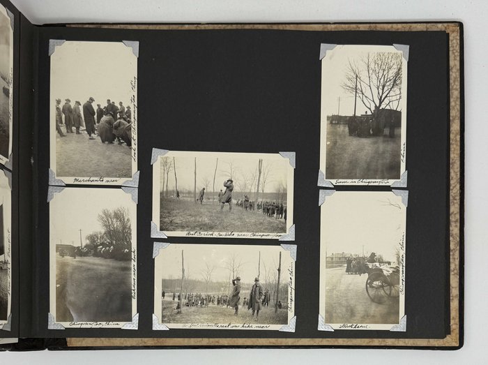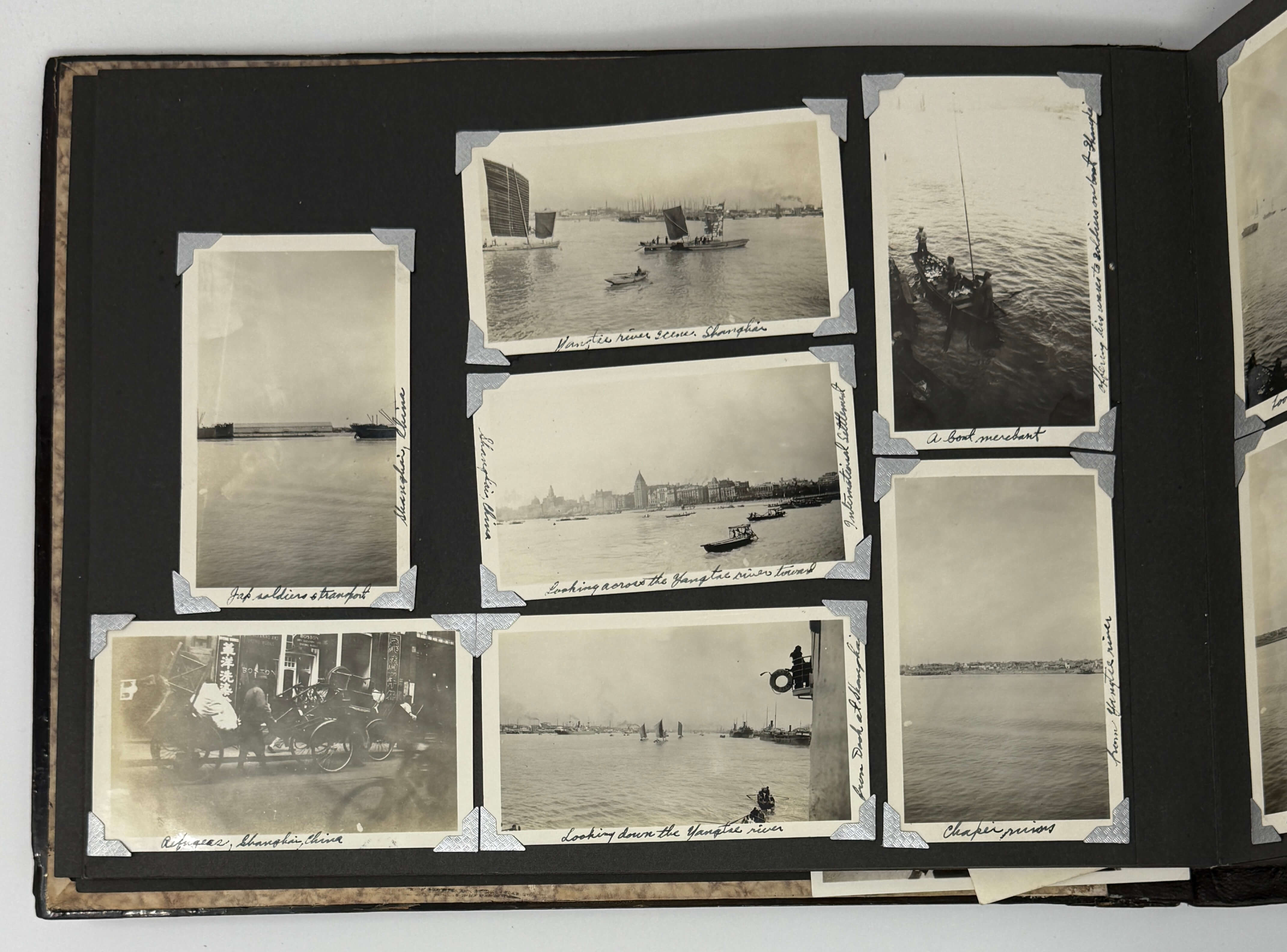 The album closes with thirty-six photos of Chinese port cities of Shanghai and Chingwangtao (Qinhuangdao, Bohai Sea), taken during the compiler’s voyage on board the USAT “U.S. Grant” after the beginning of the Second Sino-Japanese War (1937-45) and Japanese capture of Shanghai (November 1937). A series of views of the Yangtze River, taken from the deck of the “U.S. Grant” in Shanghai, shows Japanese war and transport ships, “Jap soldiers on river bank, Shanghai,” ruins of Zhabei district, destroyed during the Battle of Shanghai (“ruins of Chapei district, Shanghai,” “Chapei section of Shanghai showing shell craters & ruined blds.,” &c.), Chinese sail and merchant boats, International Settlement seen from the river, &c. At least two images feature “U.S. Grant’s” lifebuoy with the name of the ship on it. There are also views of the “Dollar Lines dock, Shanghai, Chinese laborers fighting for money thrown on dock,” a closer view of the International Settlement with a docked naval cruiser, a city street, &. Very interesting are seven snapshot photos taken during the ship’s stop in Chingwangtao, showing “merchants near dock,” four street scenes and two scenes with U.S. soldiers during “a few minutes rest on hike near Chingwangtao, China.”