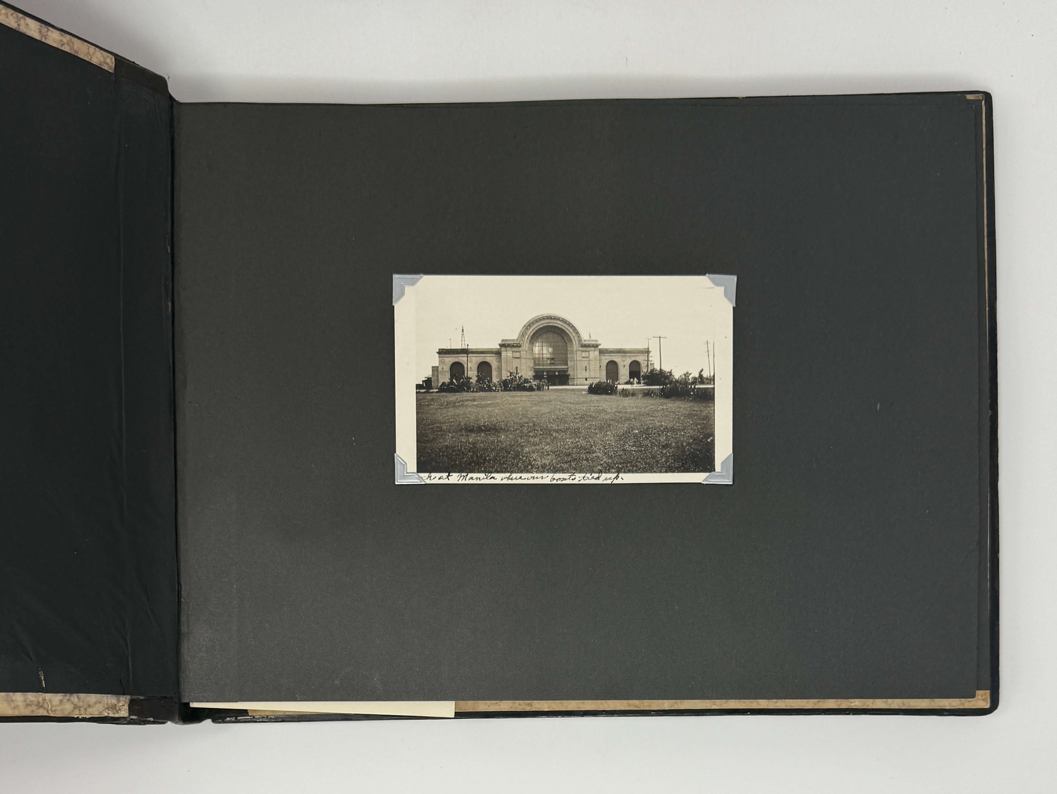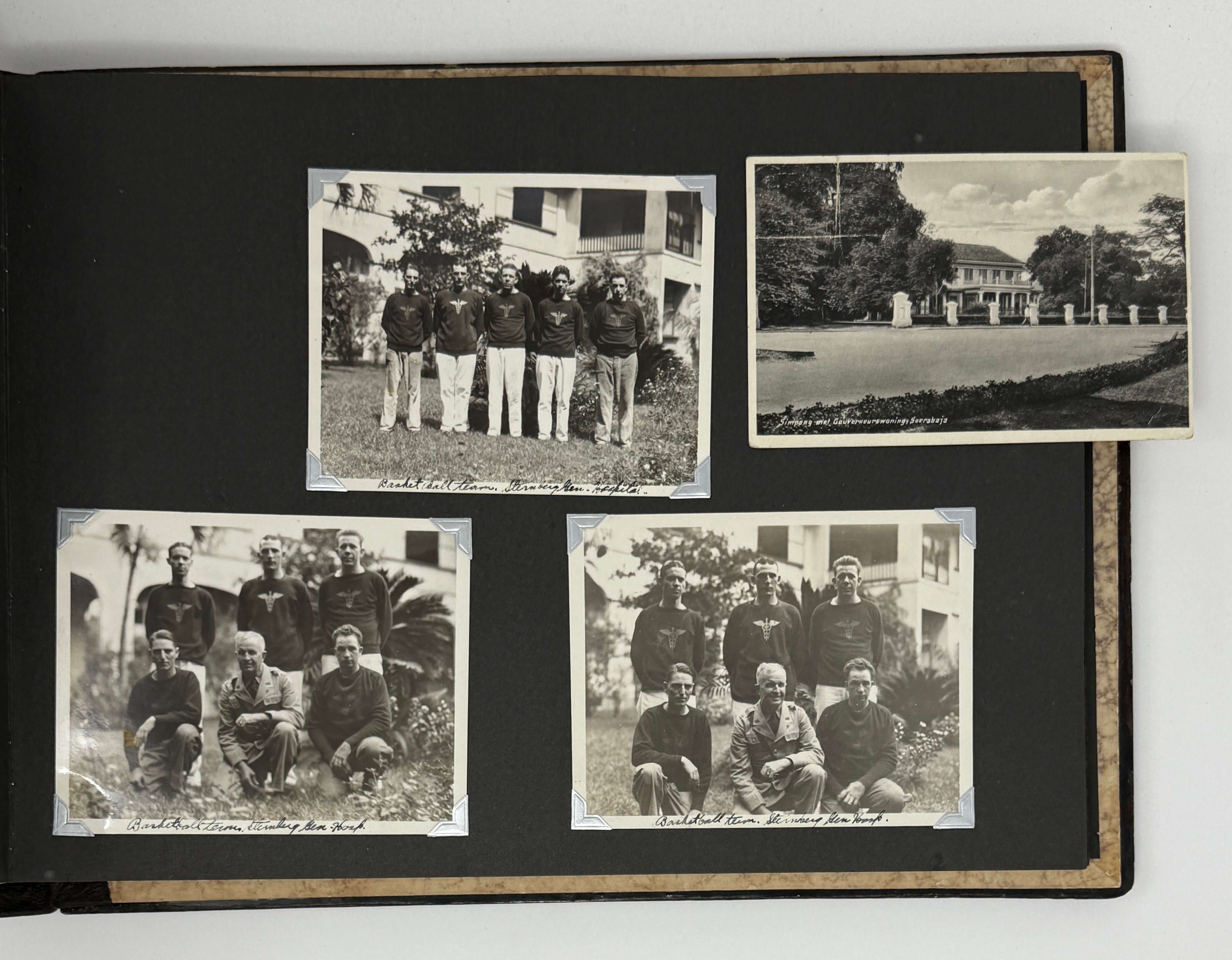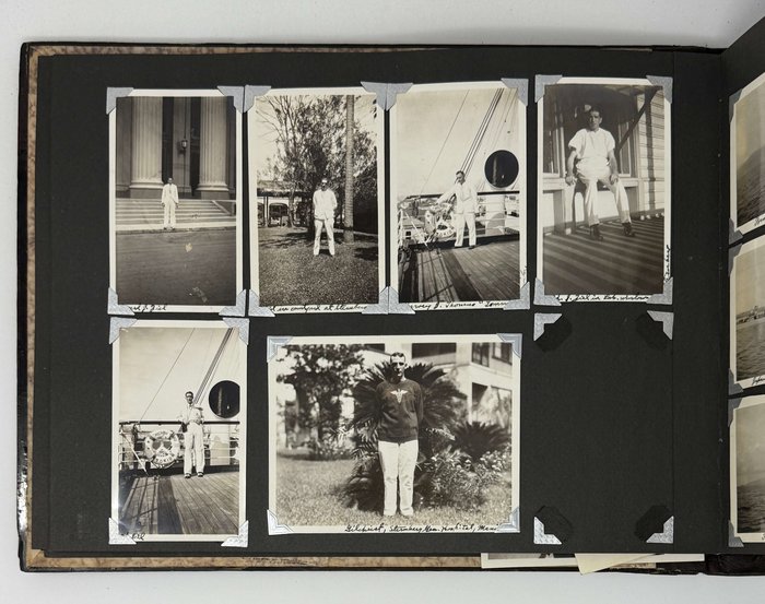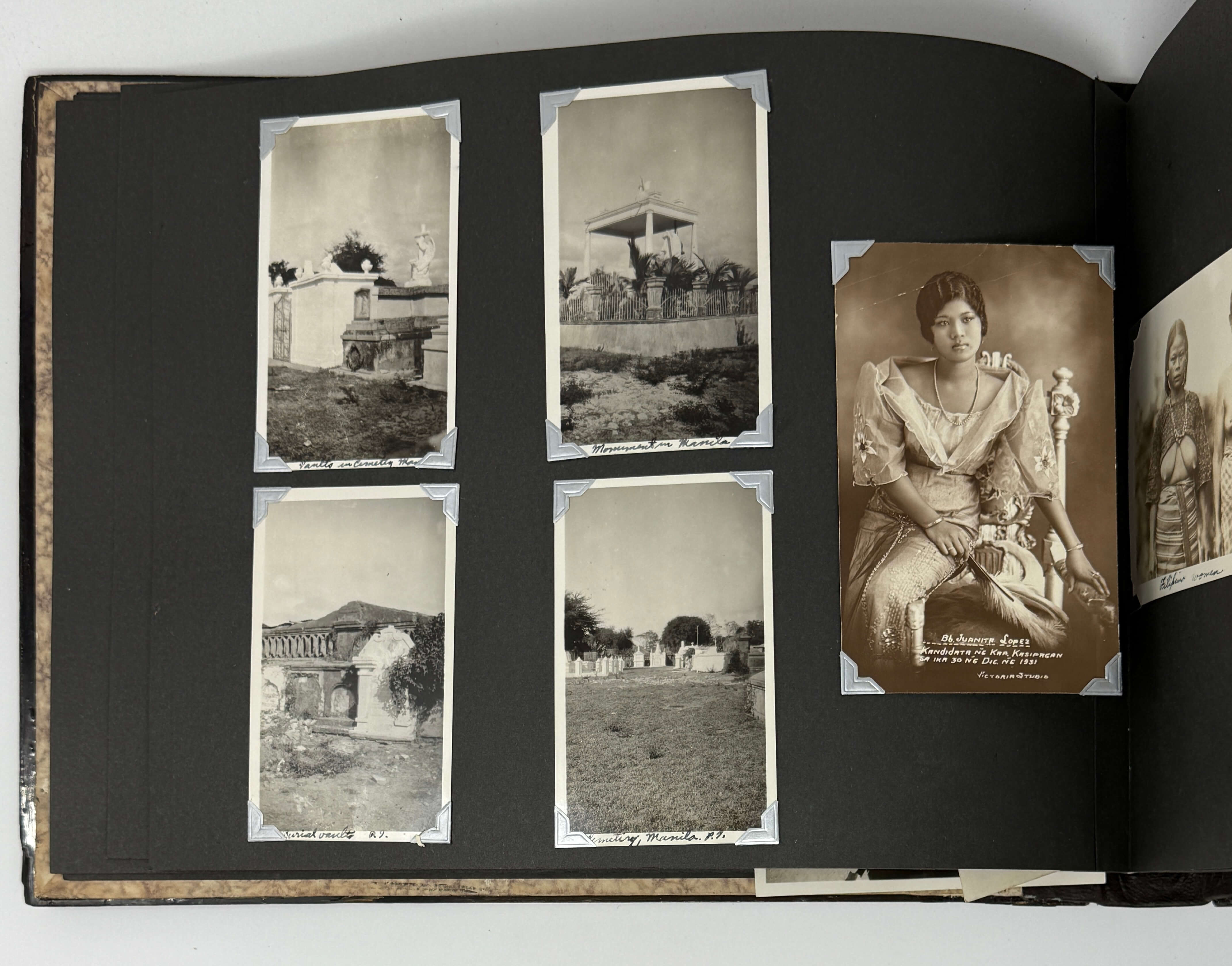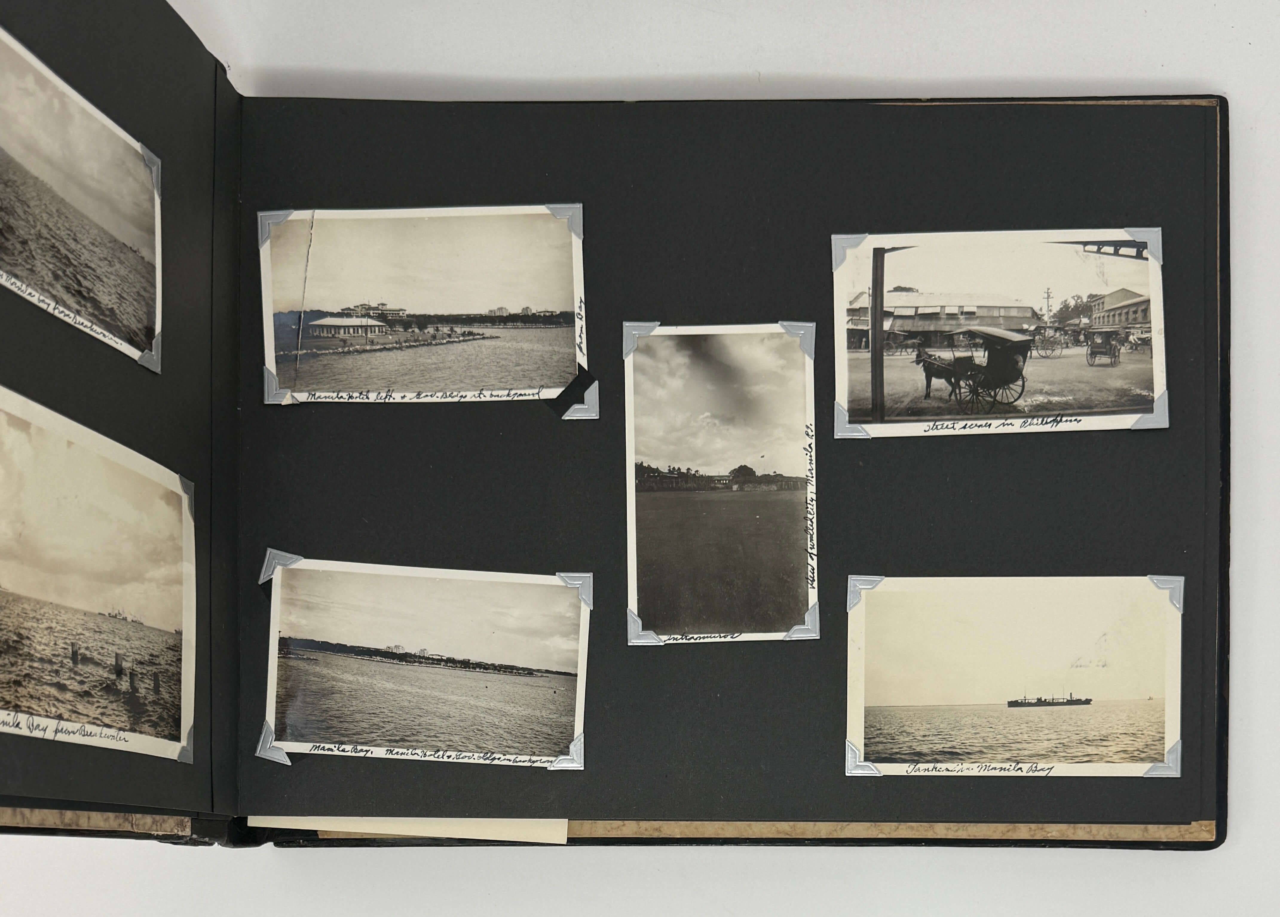 Compiled in the years leading to WW2 (apparently, between 1937 and 1939), the album contains about ninety photos of the Philippines – mostly, Manila and its environs. A series of images related to Sternberg General Hospital includes views of its grounds and facilities, two photos of a Christmas tree inside the hospital lab (where the compiler most likely worked), three group portraits of the members of “basketball team, Sternberg Gen. Hospital,” and an individual portrait of the team member, captioned “Gilchrist, Sternberg Gen. Hospital.” Several photos portray the compiler’s friends and colleagues in Manila: “Harvey G. Thomas,” “Yeager,” and “Edward G. Ziel” (“in courtyard at Sternberg,” “in Lab window, Sternberg,” on board the Japanese steamer “M.S. Chichibu Maru” – renamed “Kamakura Maru” in 1939, &c.).