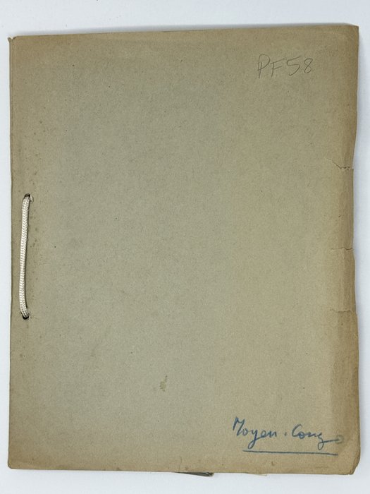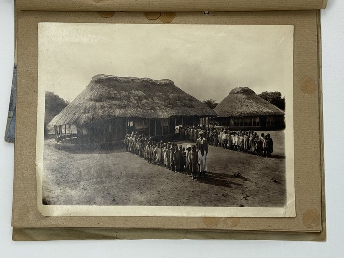 Folio album (ca. 29x23 cm or 11 ¼ x 9 in). With 48 original mounted and loosely inserted gelatin silver photos, including two large images ca. 18x24 cm (7 x 9 ¼ in) and ca. 13x26 cm (5 x 10 ¼ in); the rest of the photos are from ca. 12,5x18 cm (5x7 in) to ca. 6x9 cm (2 ¼ x 3 ½ in). Three images are printed as real photo postcards. Most images with detailed pen and/or pencil (black or blue) captions in French on verso or additional ink captions on the mounts. At least three images are dated June or December 1932 on verso. Two photos with ink stamps “Afrique Équatoriale Francais, Agence Économique…” on verso. Period album with blue paper covers, blue pencil title “Moyen Congo” in the right lower corner. Covers with minor creases and tears on extremities, one large photo slightly heightened in white, but overall a very good collection of strong interesting photos.