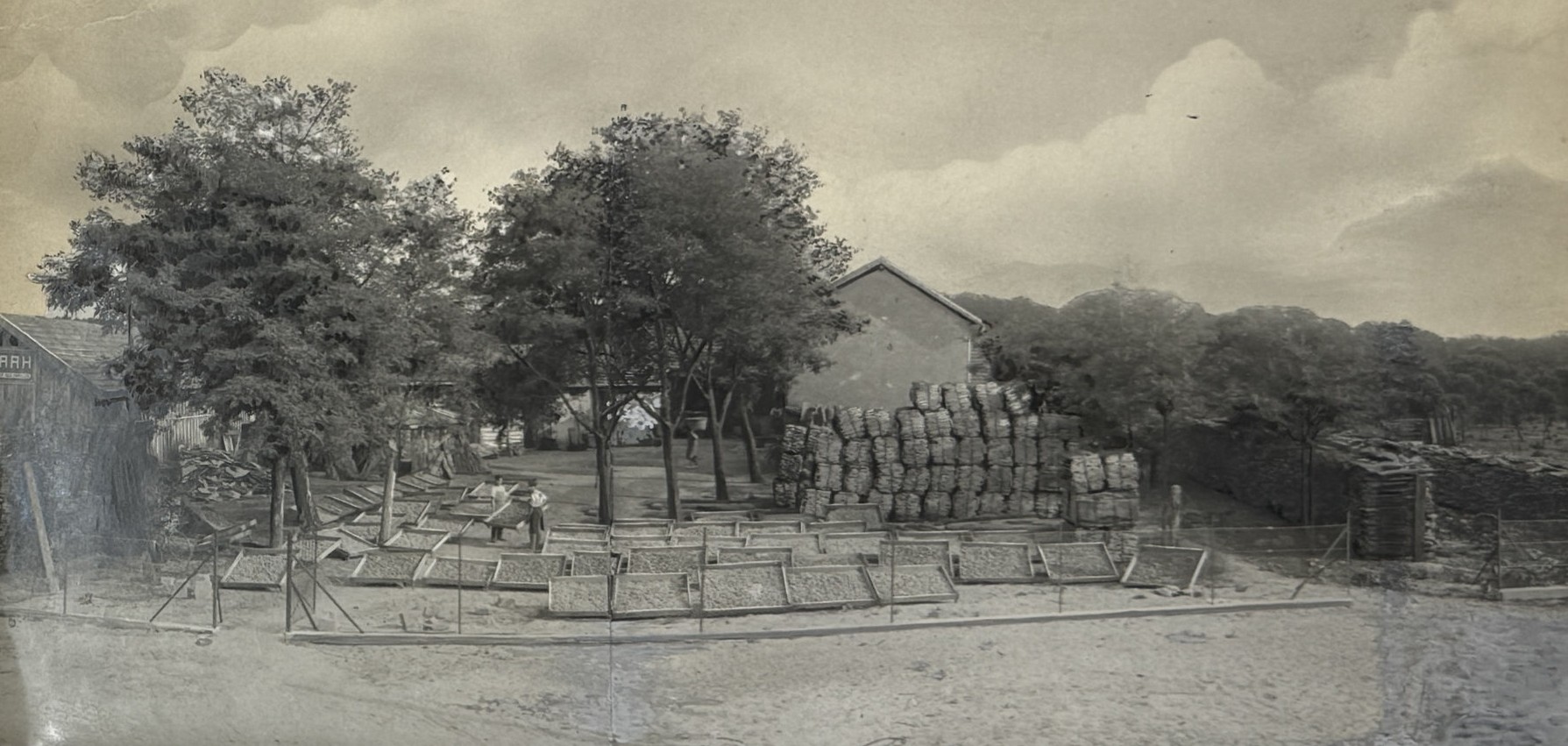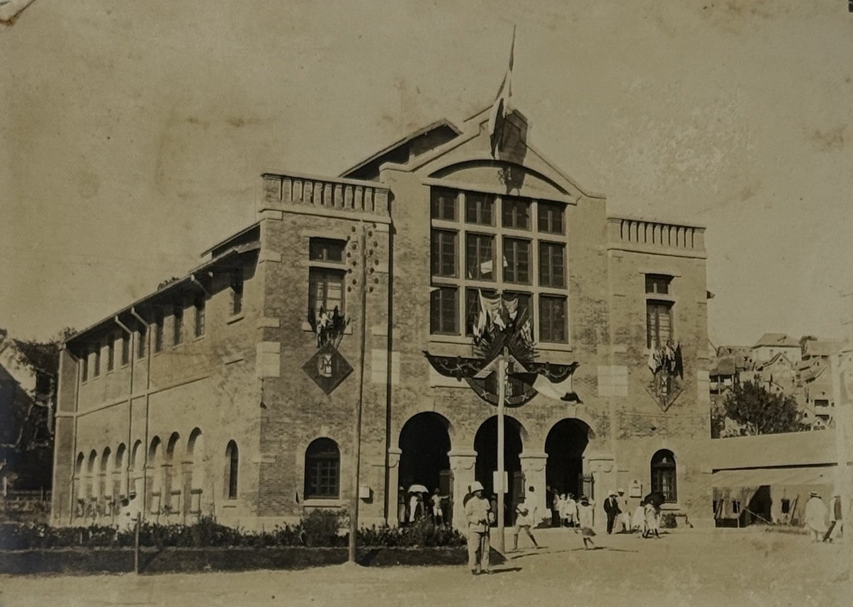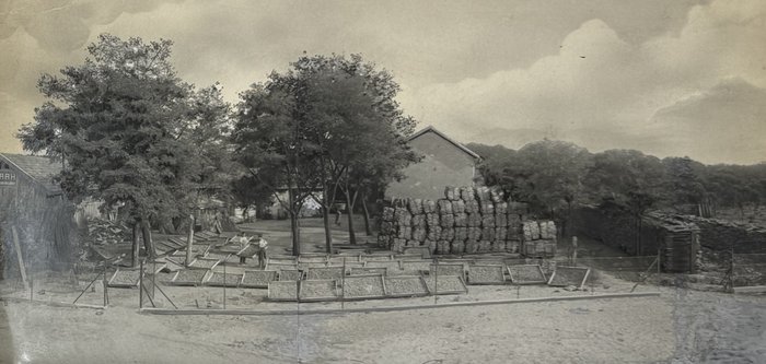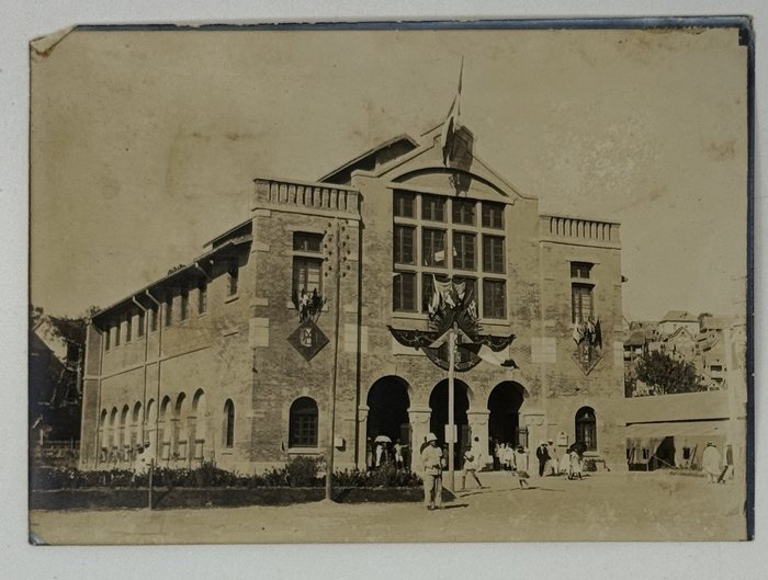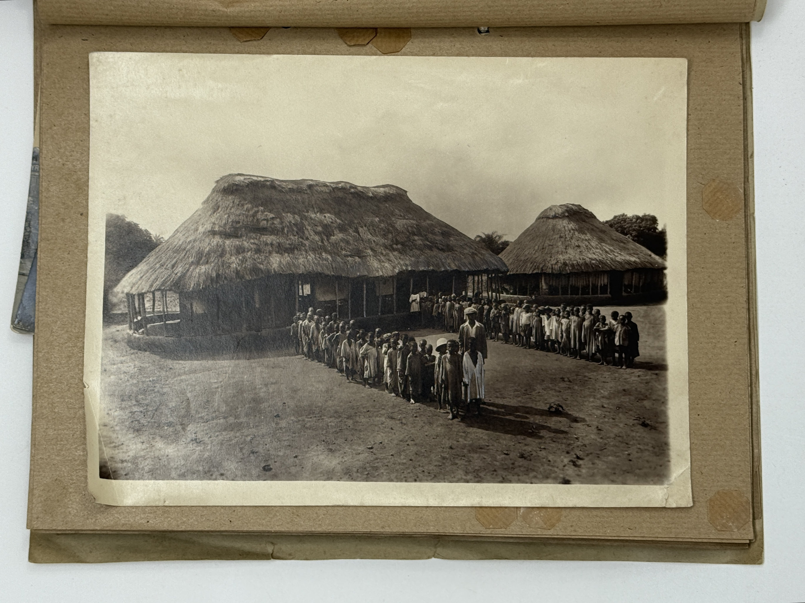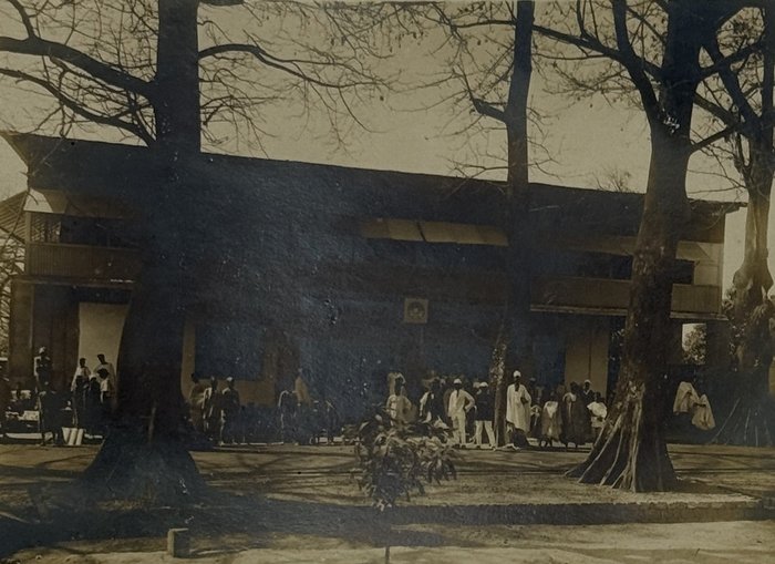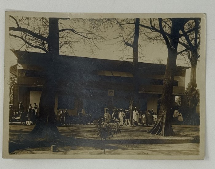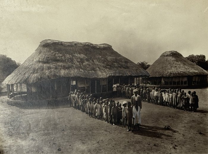 Three images apparently taken on the way to the railway construction areas show the Foulakary River, Bouenza River waterfalls and a small steamer (visible sign “Courbet”) on the Alima River (one of Congo’s tributaries). The large photos depict a village school and children, as well as a farm warehouse with drying produce. The collection also includes five views and scenes taken in French West Africa (French administrative building decorated with flags, locals at a building with the sign “F.A.O.,” a public fest, workers at a farm field – one image with ink stamps “Photo L. Méteyer, Grand-Bassam, Cote d’Ivoire” on recto and verso, one photo with a blind stamp “Photo Ouest-Africain A. James, Conakry, Guinée Francais” on recto).