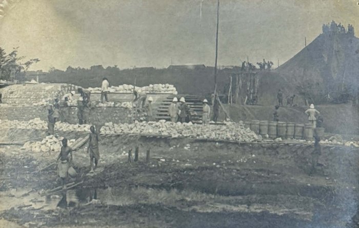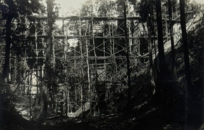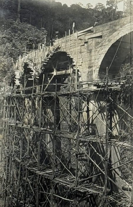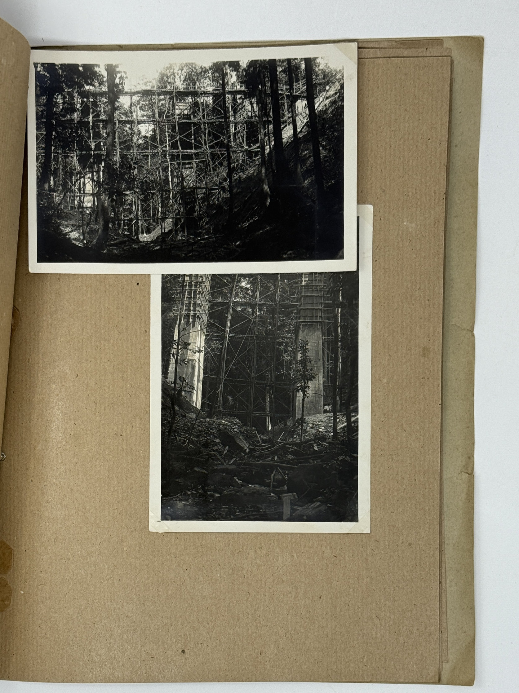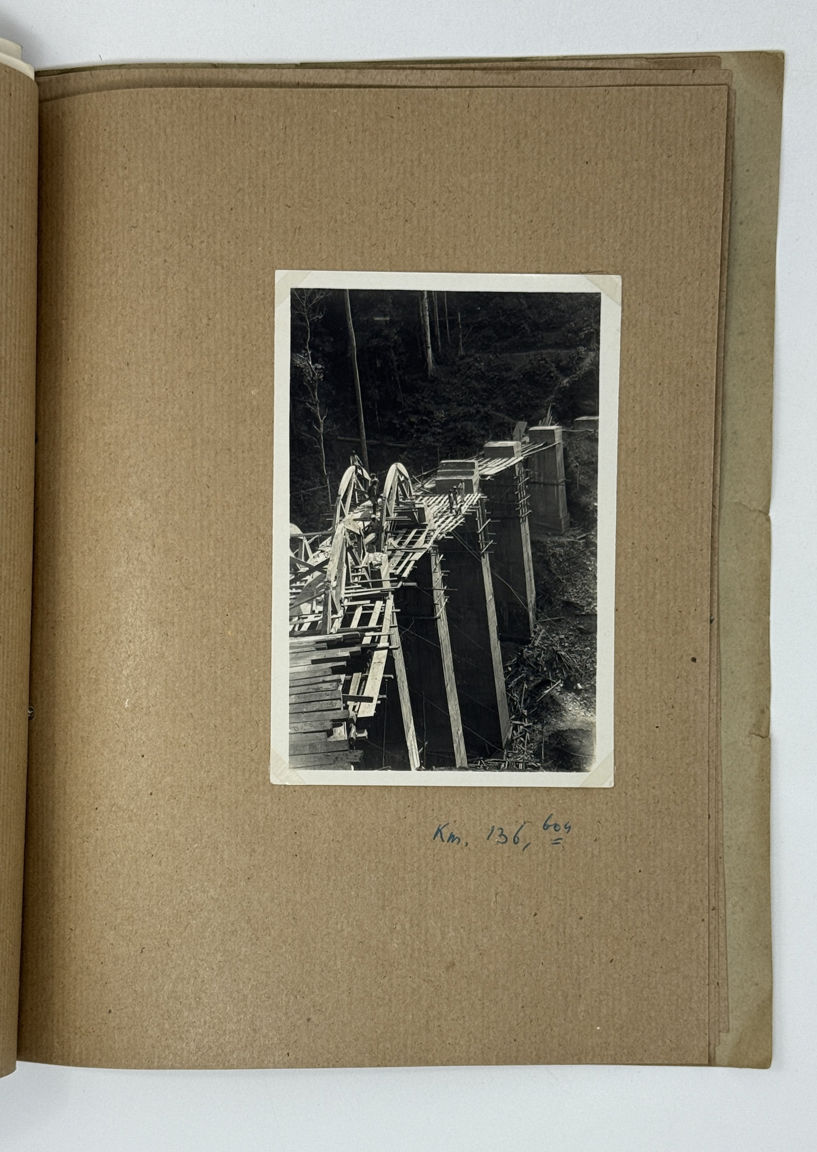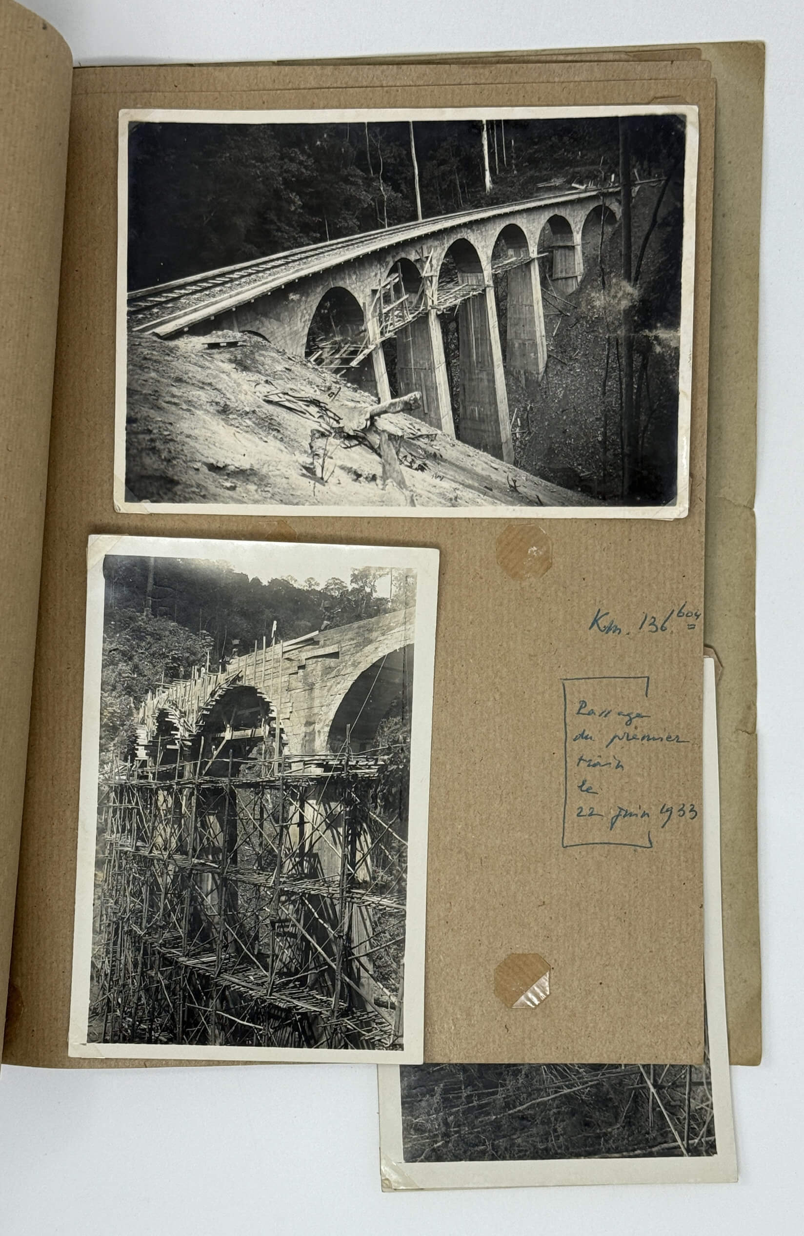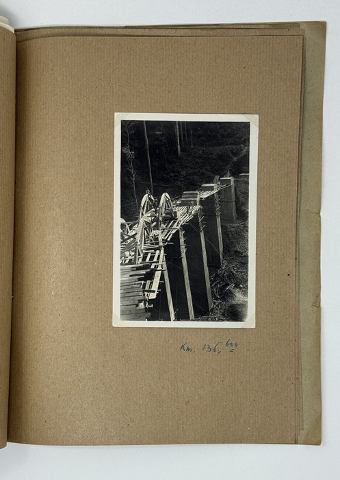 More than half of the photos in this collection show the railway construction in the Mayombe Hills: various stages of viaduct construction on the 106th, 117th, 136th and 137th km (earthworks, erection of girders and scaffolds, construction of the road surface) and digging through the hills for the railway line on the 119th and 120th km. The photos feature native workers and French supervisors, possibly including the compiler of the collection. A manuscript caption to the picture of a viaduct on km 136 adds that the first train passed there on June 22, 1933.