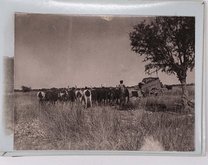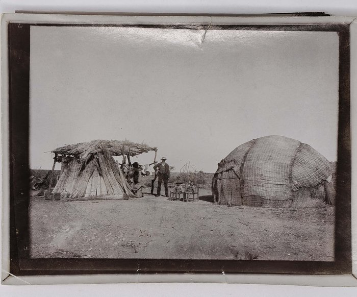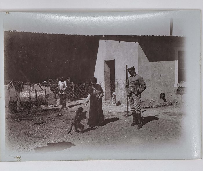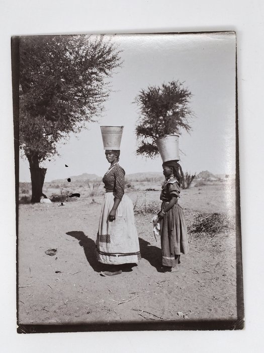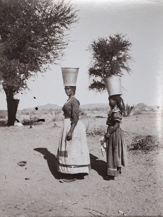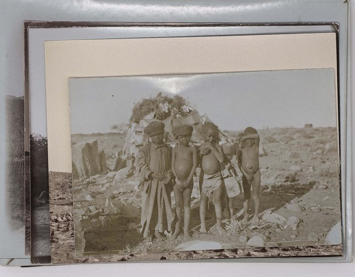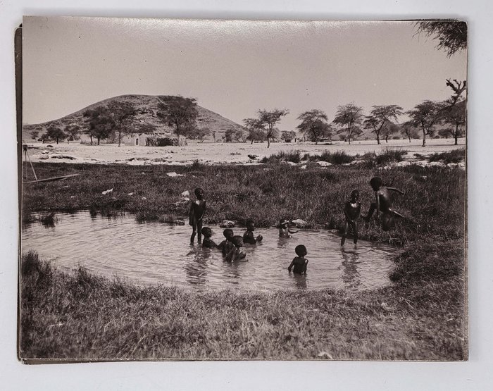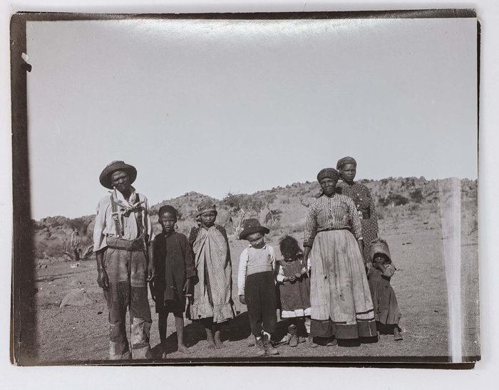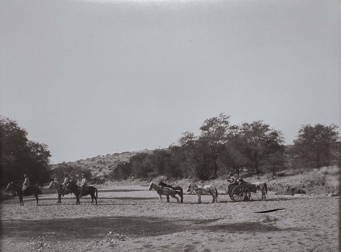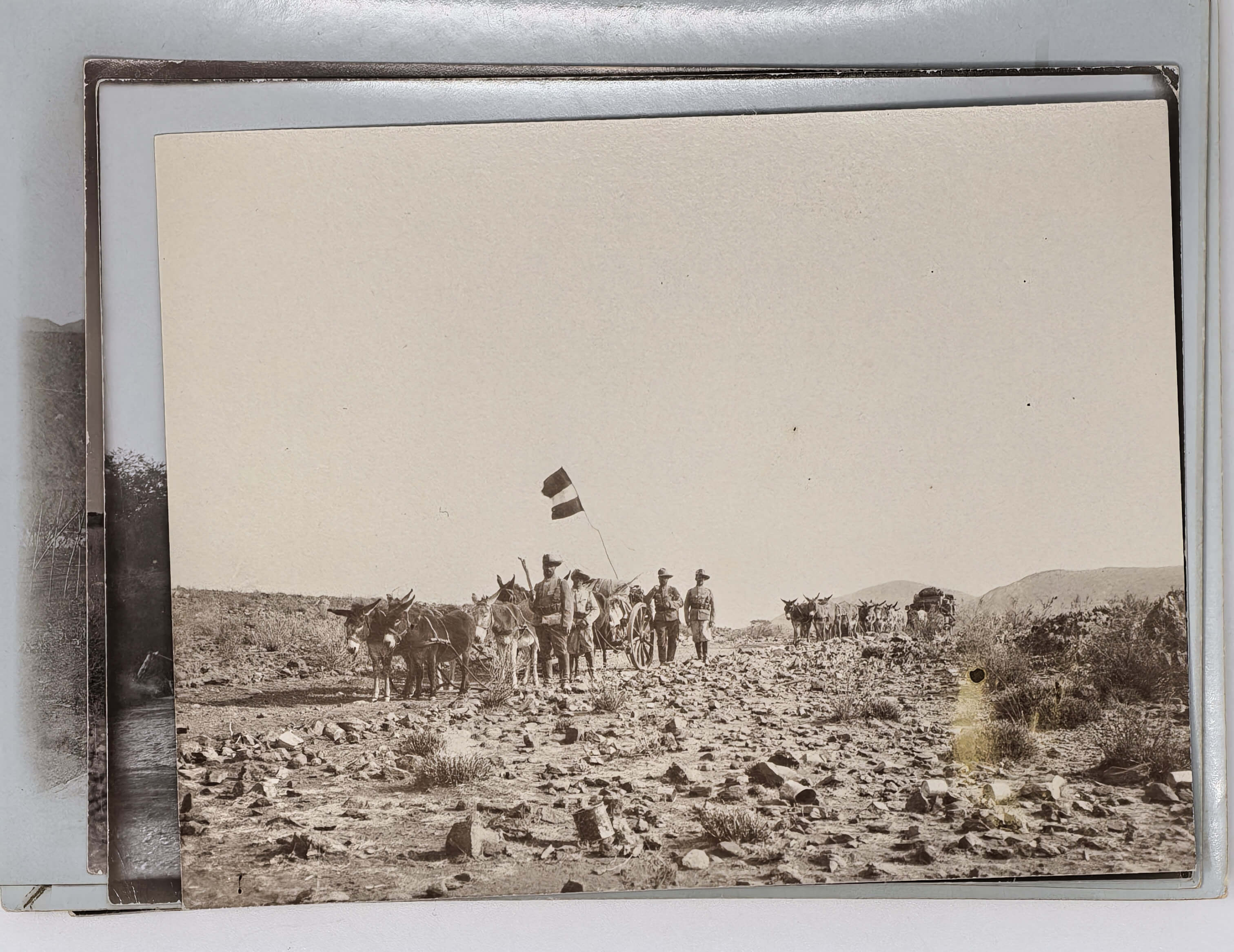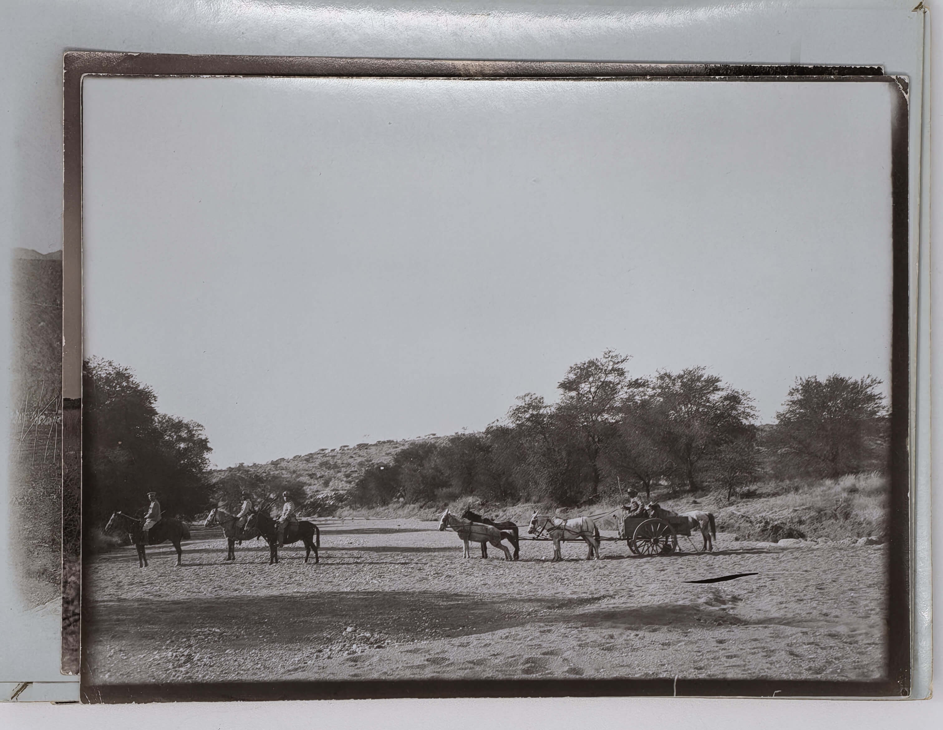 Other images show Schutztruppe forts and stations, tent camps, cavalry and soldiers on the move, German farms and homesteads, camels, cow herds, oxen- and donkey-driven wagons, Namibian hills, deserts and bush country, rivers and brooks, &c. A number of photos portray native Namibians wearing traditional outfits, families and children, women gathered for a ceremony, people getting water from a spring, peeling corn, riding donkeys, views of their villages, traditional round huts, &c. There are also portraits of German military men and their family members, posing inside or near their residences, with hunted or captured African animals and birds, &c. Overall an interesting, extensive collection of early original photos of Namibia and its people.