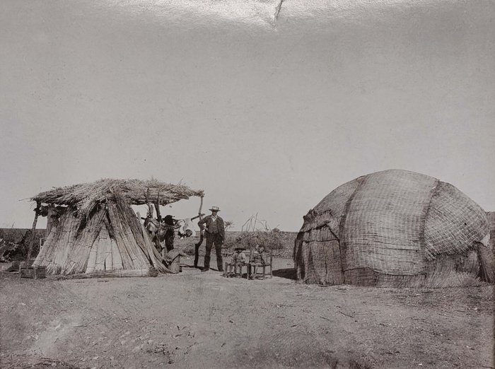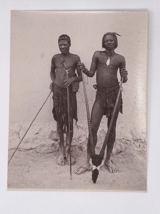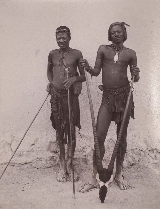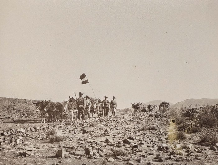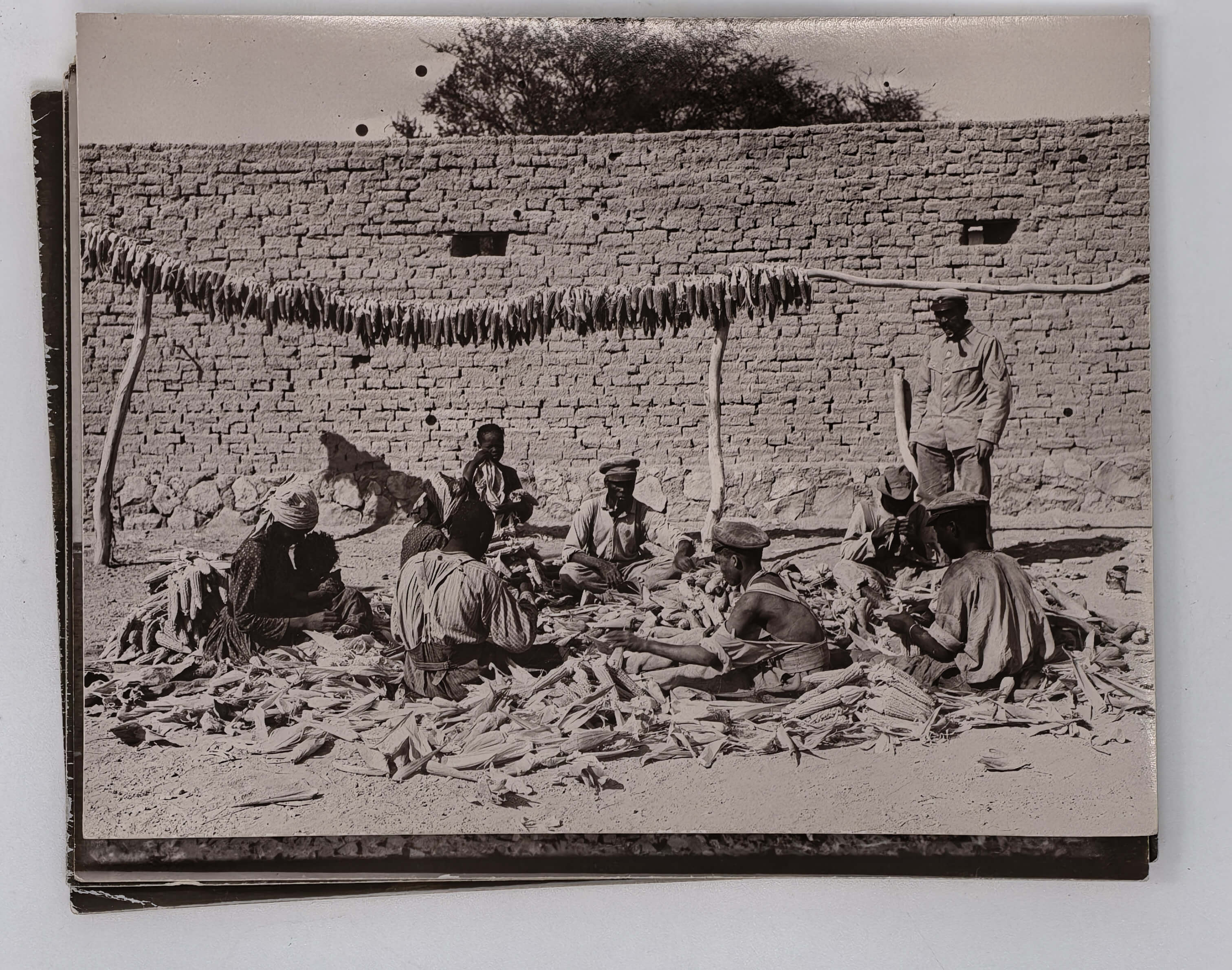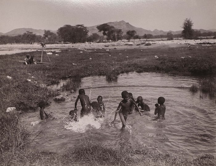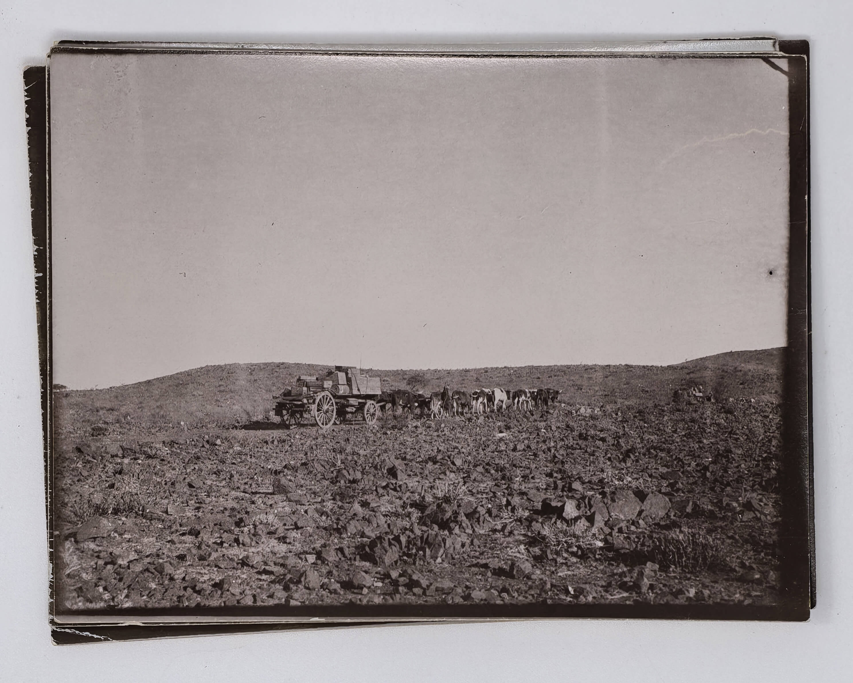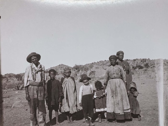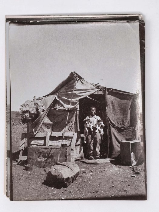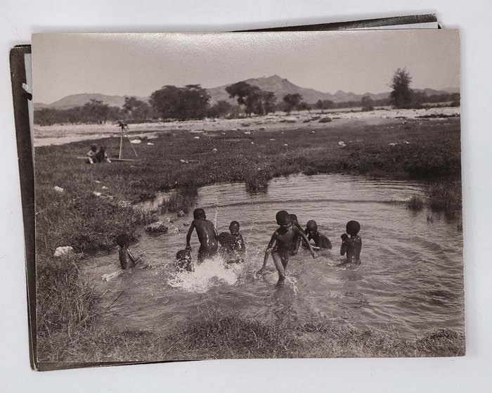 Other images show Schutztruppe forts and stations, tent camps, cavalry and soldiers on the move, German farms and homesteads, camels, cow herds, oxen- and donkey-driven wagons, Namibian hills, deserts and bush country, rivers and brooks, &c. A number of photos portray native Namibians wearing traditional outfits, families and children, women gathered for a ceremony, people getting water from a spring, peeling corn, riding donkeys, views of their villages, traditional round huts, &c. There are also portraits of German military men and their family members, posing inside or near their residences, with hunted or captured African animals and birds, &c. Overall an interesting, extensive collection of early original photos of Namibia and its people.
