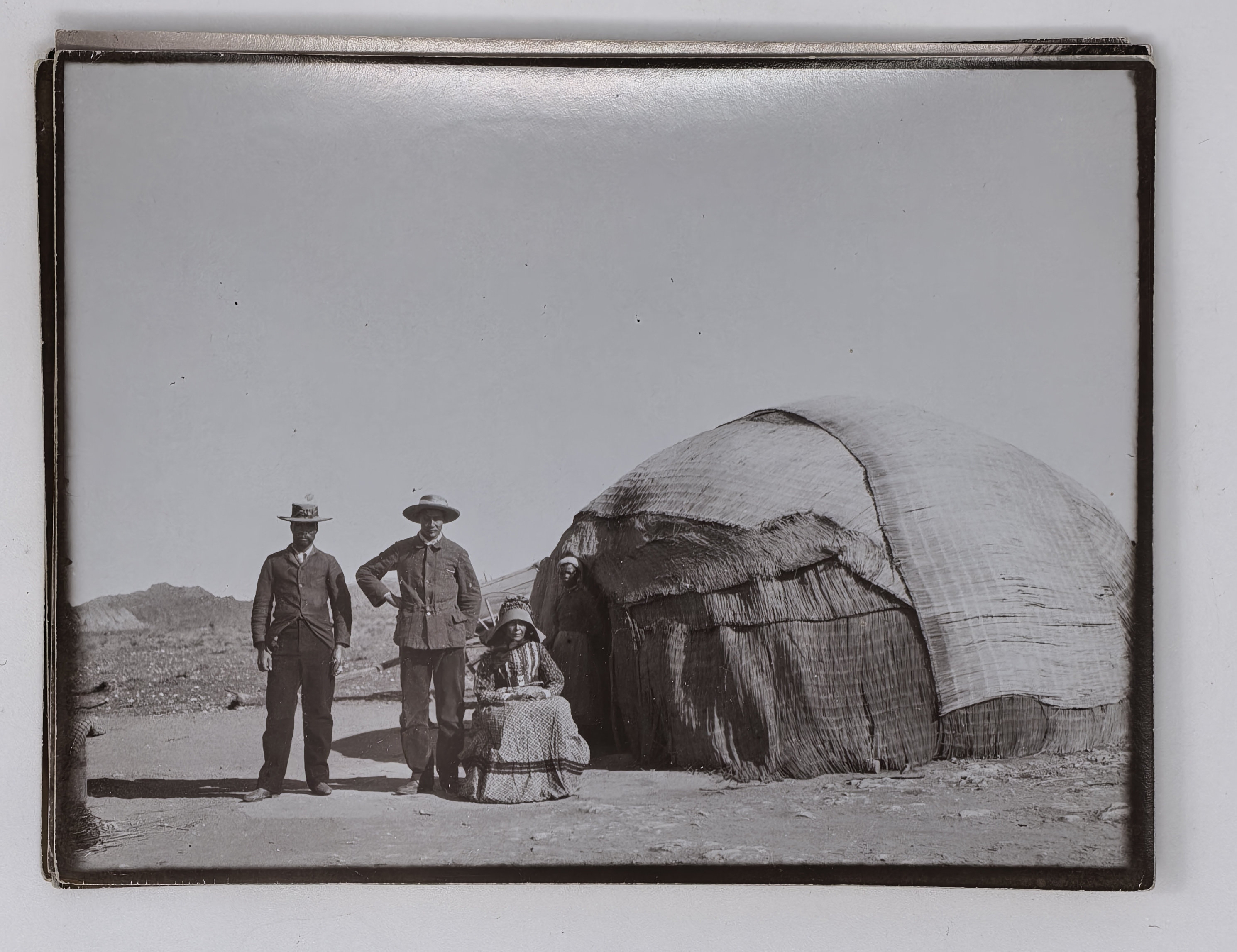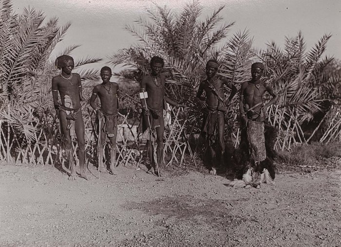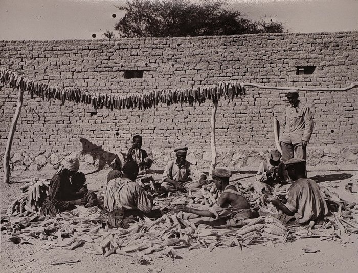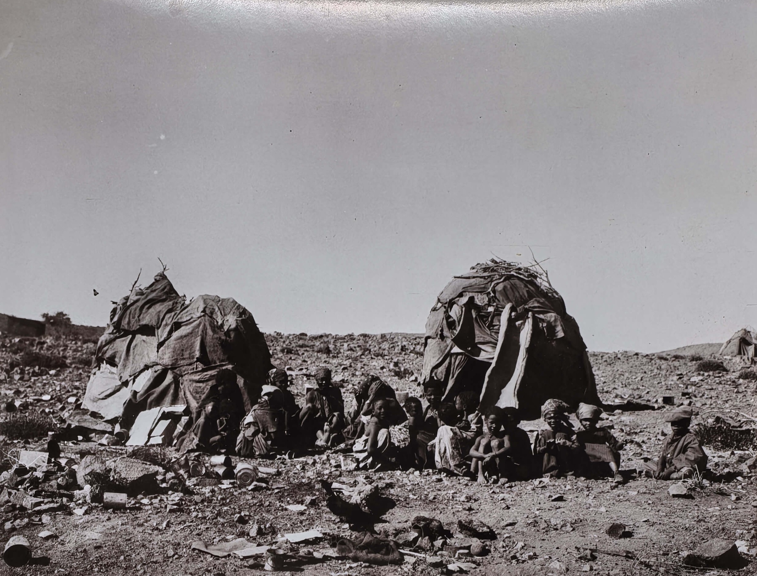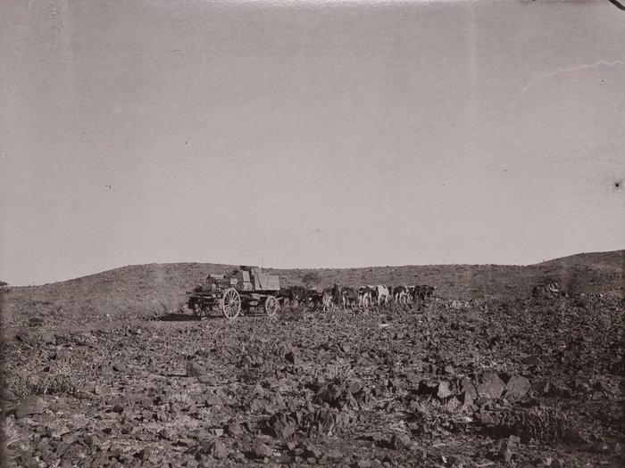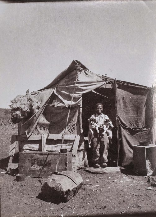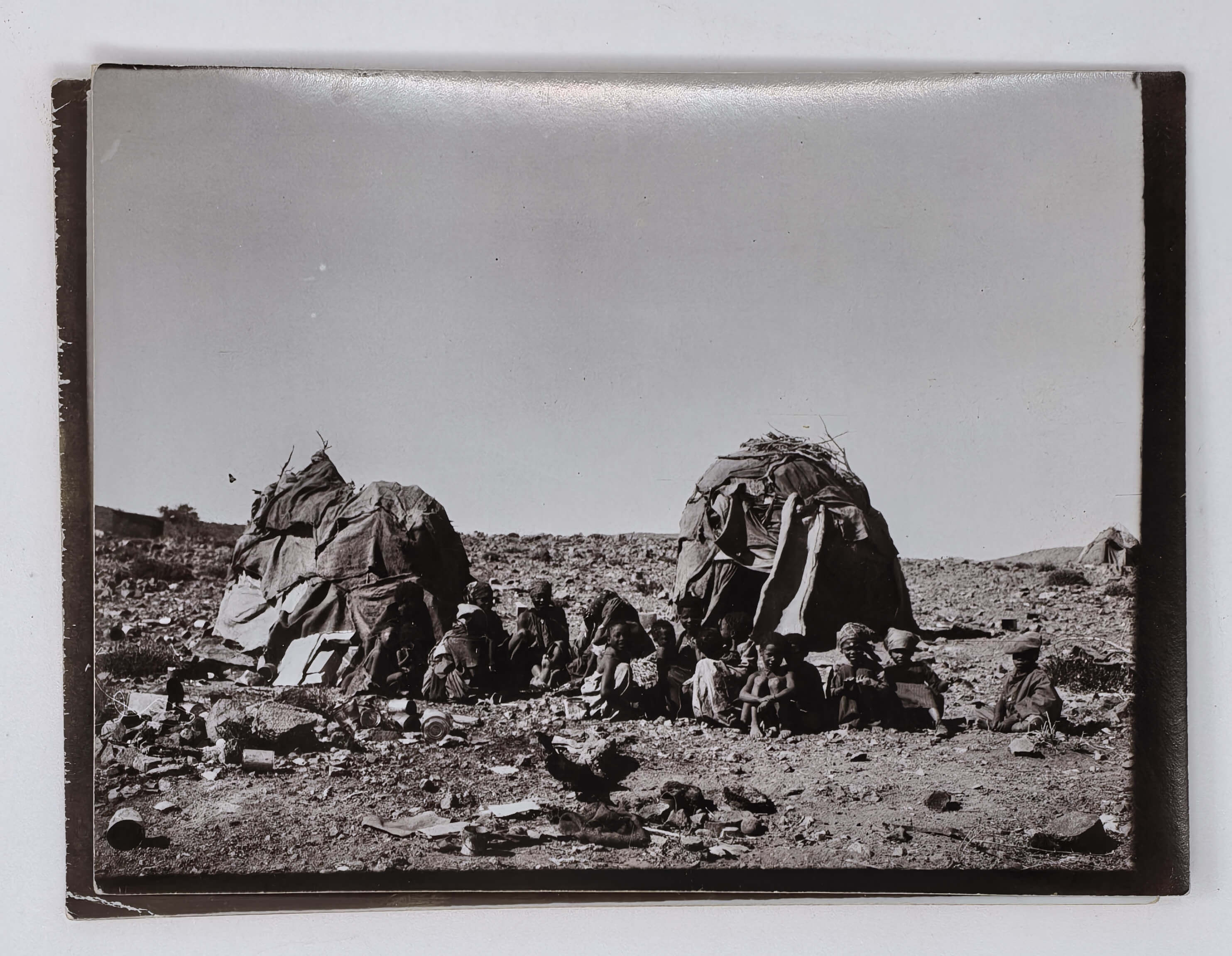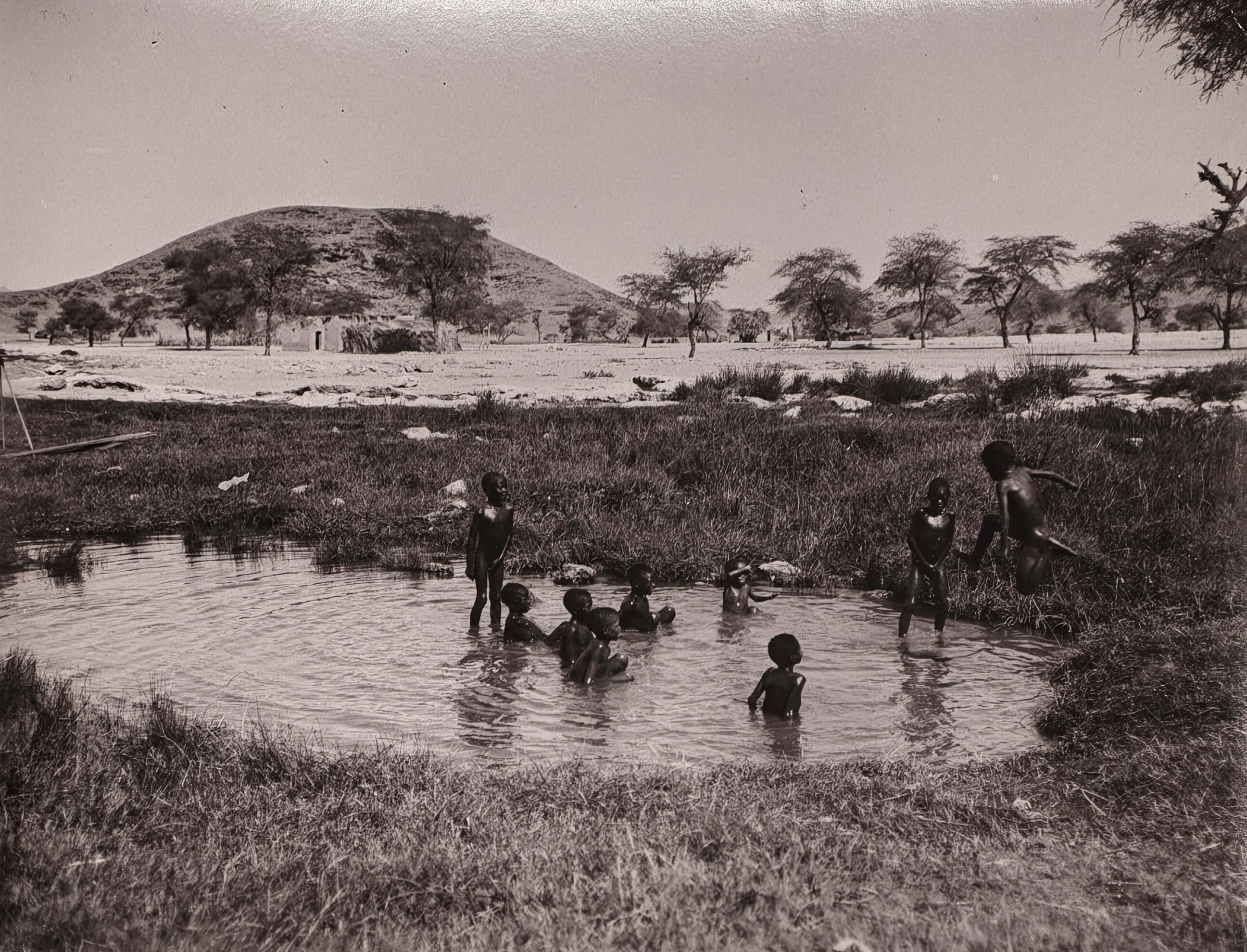 Other images show Schutztruppe forts and stations, tent camps, cavalry and soldiers on the move, German farms and homesteads, camels, cow herds, oxen- and donkey-driven wagons, Namibian hills, deserts and bush country, rivers and brooks, &c. A number of photos portray native Namibians wearing traditional outfits, families and children, women gathered for a ceremony, people getting water from a spring, peeling corn, riding donkeys, views of their villages, traditional round huts, &c. There are also portraits of German military men and their family members, posing inside or near their residences, with hunted or captured African animals and birds, &c. Overall an interesting, extensive collection of early original photos of Namibia and its people.