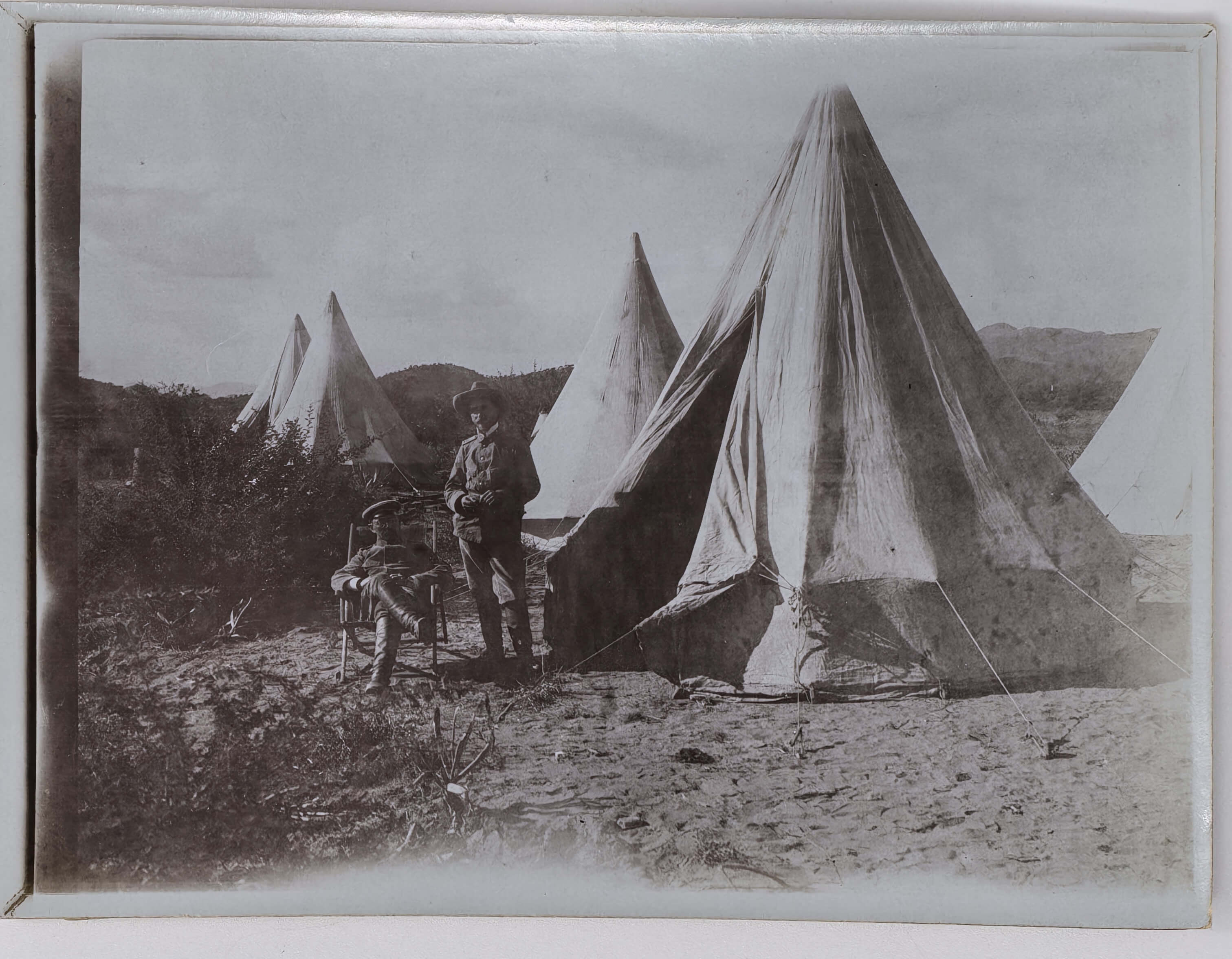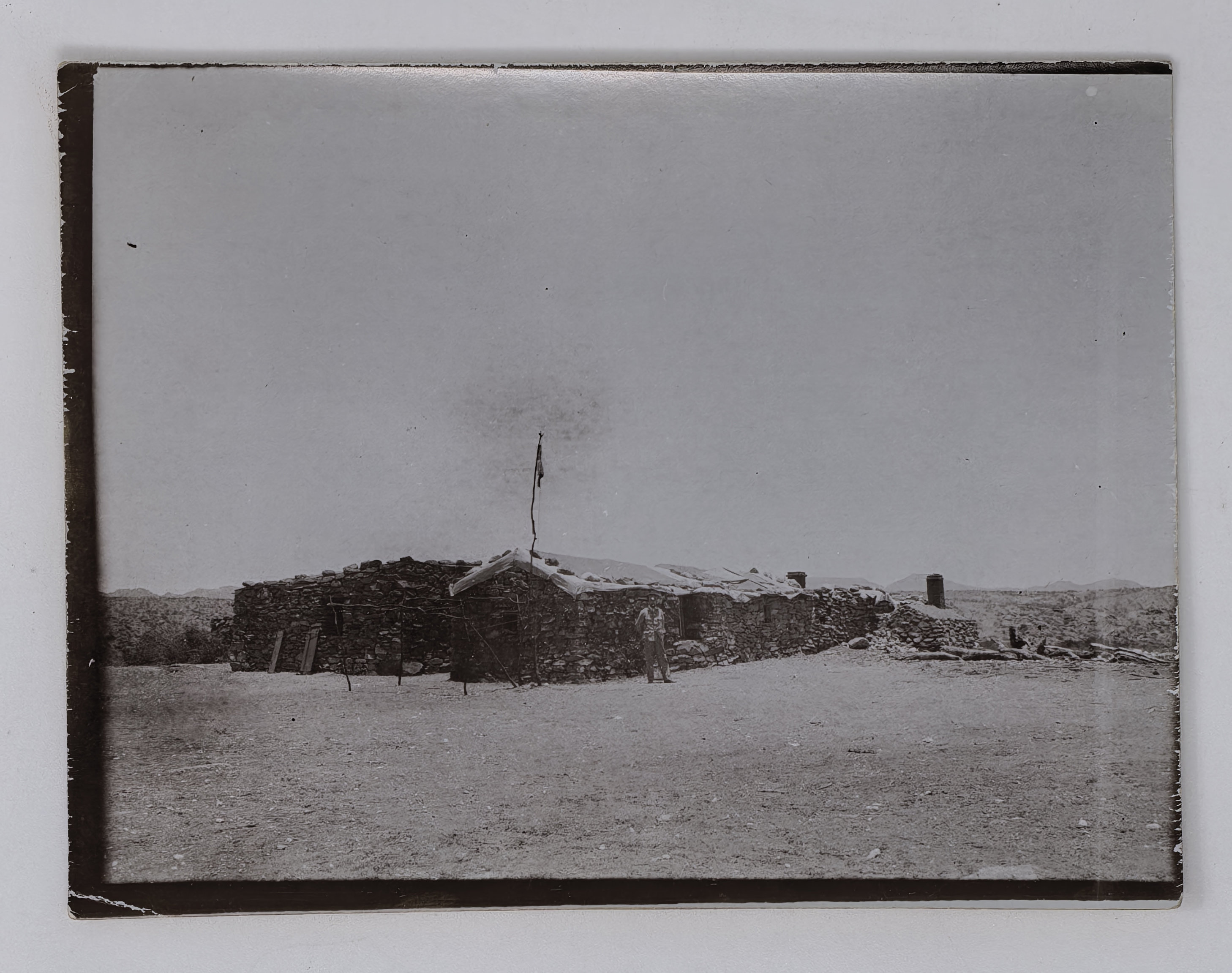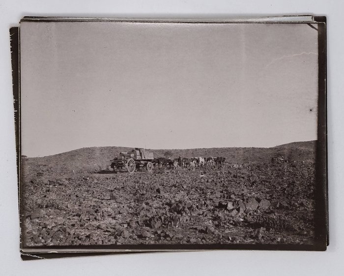 Interesting extensive collection of early original gelatin silver photos of German Southwest Africa (Namibia), apparently taken and collected by a German military officer during his service in the colony in ca. 1900s. Among the identified views are several images of the Garnison Lazarett (Hospital) in Windhoek, and the surrounding gardens; two photos of the hospital also feature the Schwerinsburg (Sperlinglust) castle on top of the hill in the background. Three images with pencil captions “Windhuk” on verso (as a part of longer captions) depict German Schutztruppe soldiers disembarking a train from Swakopmund to Windhoek, officers next to their field tent and a native Namibian woman. Pencil captions to four photos identify their locations as “Areb” (probably, Areb in the Khomas region southwest of Windhoek); captions to five photos identify their location as “Awabes.” There are also four photos of the Sesfontein Fort (Kunene Region of modern-day northwestern Namibia): a general view (captioned in negative) and three close-up views of the walls and one of the towers.