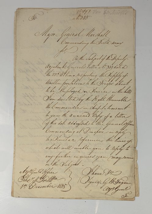 The documents contain valuable information on the history of operations of the British Indian Army in Kumaon and along the border of western Nepal. Originals or copies of official dispatches from Adjutant General George Fagan, Commissary General of Bengal Thomas Weguelin, James Nicol (Office of Deputy Adjutant General, Field Army) and Mayor William Lumsdaine (“Deputy Commissary General, Nepal”) refer to the formation of the British force in Seetapore, appointment of the Commissary Officers (William Lumsdale and others), issues with the supply of “woolen pantaloons to the troops about to be employed on service in the Hills” (Fagan’s despatch, December 1), and disbandment of the force “in consequence of the ratification of peace with the State of Nepaul” in late December (Lumsdaine’s despatch from December 22).