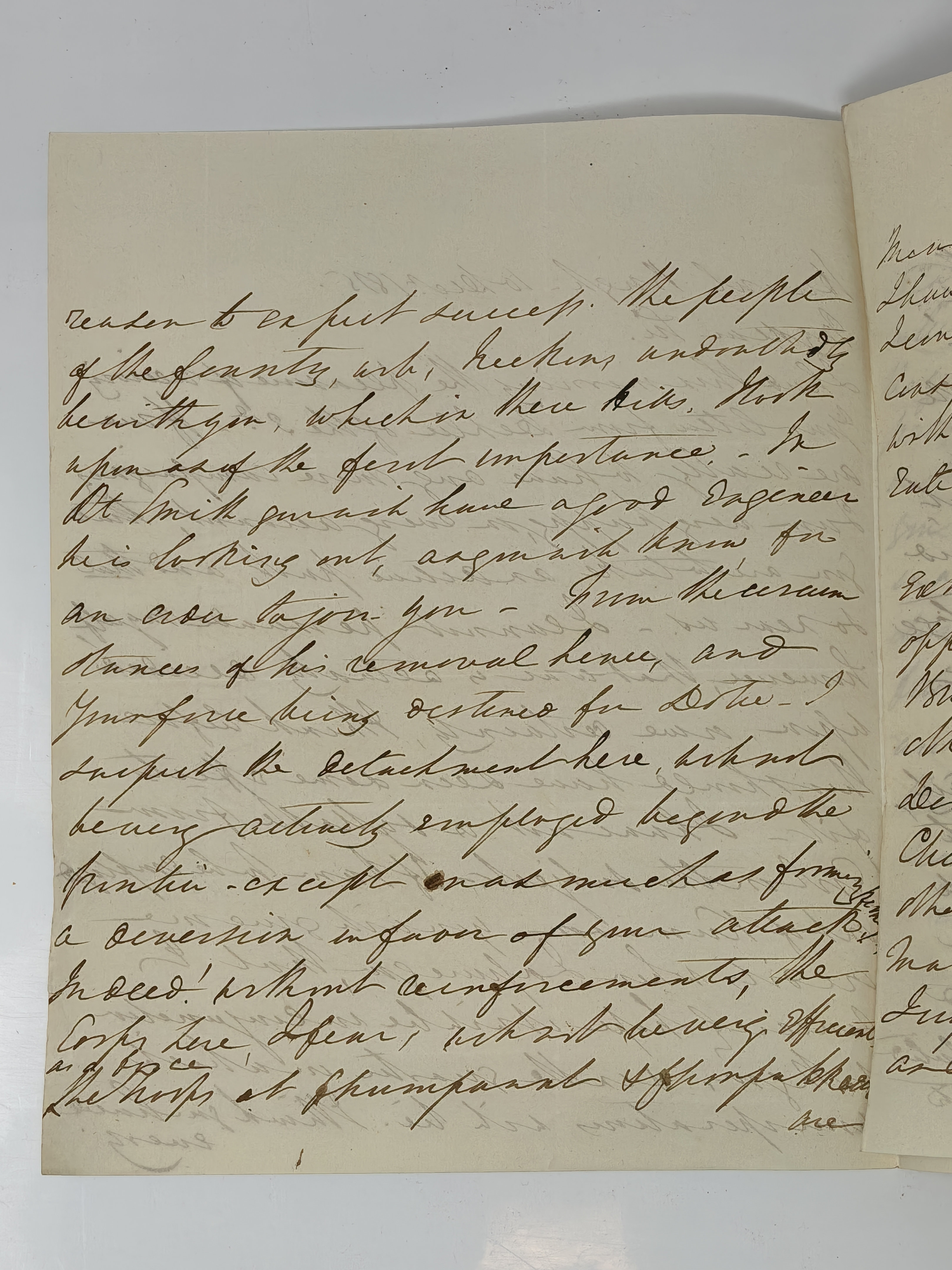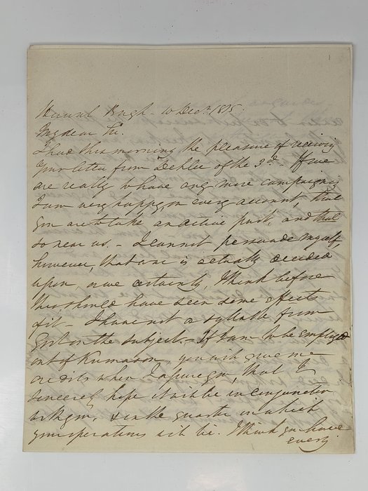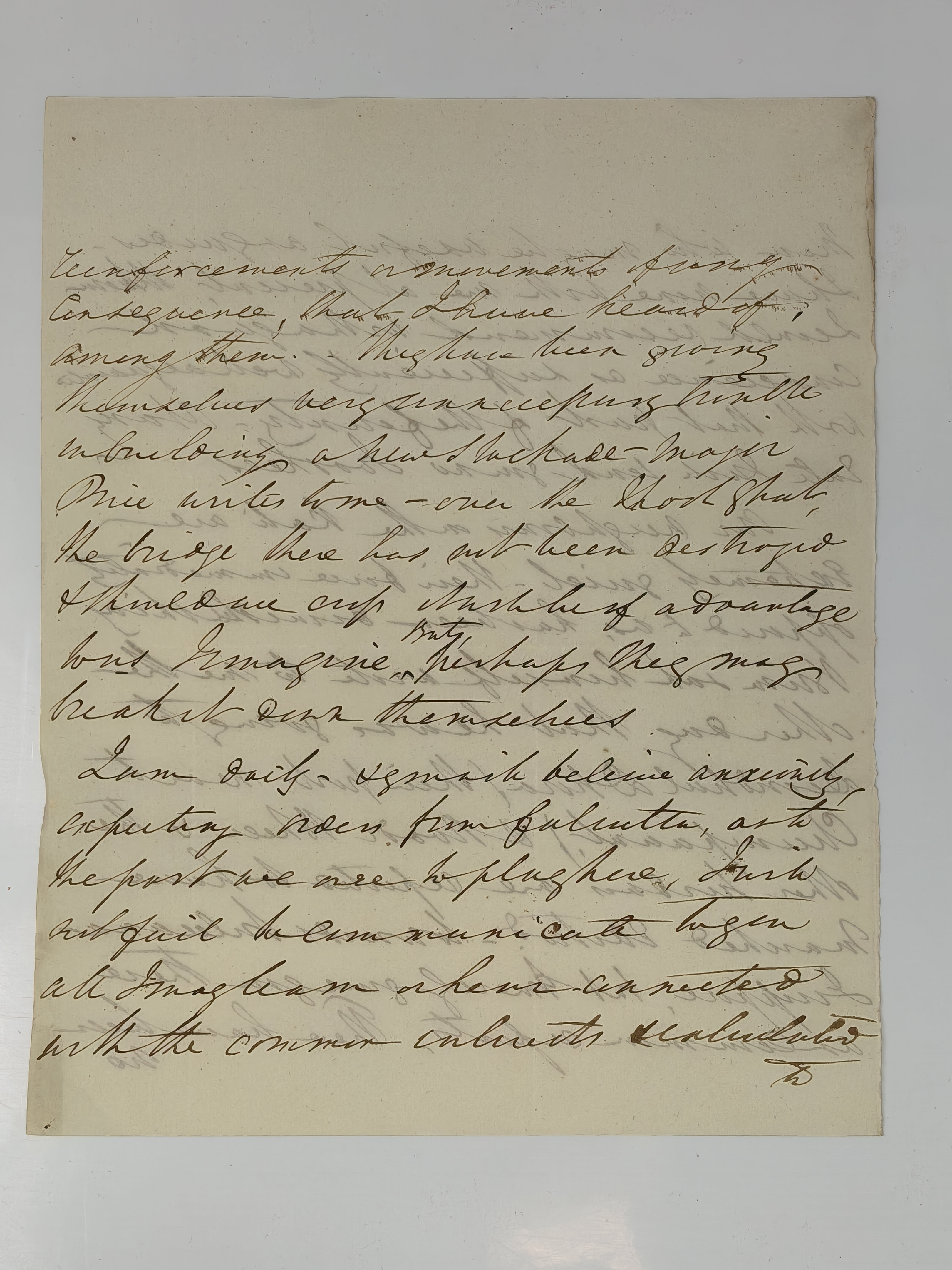 “<…> If we are really to have any more campaigning I am very happy, in every account, that you are to take an active part, and that so near us. I cannot persuade myself however that war is actually decided upon, or we certainly, I think before this, should have seen some effects of it. I have not a syllable from [Gvt?] on the subject. If I am to be employed out of Kumaon, you will give me credits when I assure you that I sincerely hope it will be in conjunction with you, & in the quarter in which your operations will be. I think you have every reason to expect success. <…> In Lt. Smith you will have a good engineer, he is looking out, as you will know, for an order to join you. From the circumstances of his removal hence and your force being destined for Dotee, I suspect the detachment here will not be very actively employed beyond the frontier, except in as much as forming perhaps a […?] in favor of your attack. Indeed! Without reinforcements the Corps here, I fear, will not be very efficient as a force. The troops at Champawat & […?] are greatly reduced & those that are still called fit for duty are not the men they were. <…> what is worse than all, the disgust & dislike of the Seapoys in general to the Hill service is rather [increased?] than otherwise & desertions <…> have lately become frequent. The 11th which I believe was the most effective Corps we had, has been relieved by this time I believe by the end of the 13th which I understand is very week. All these circumstance are really serious in contemplating any active movements across the Kali and I am very happy <…> that your operations will be in that quarter.