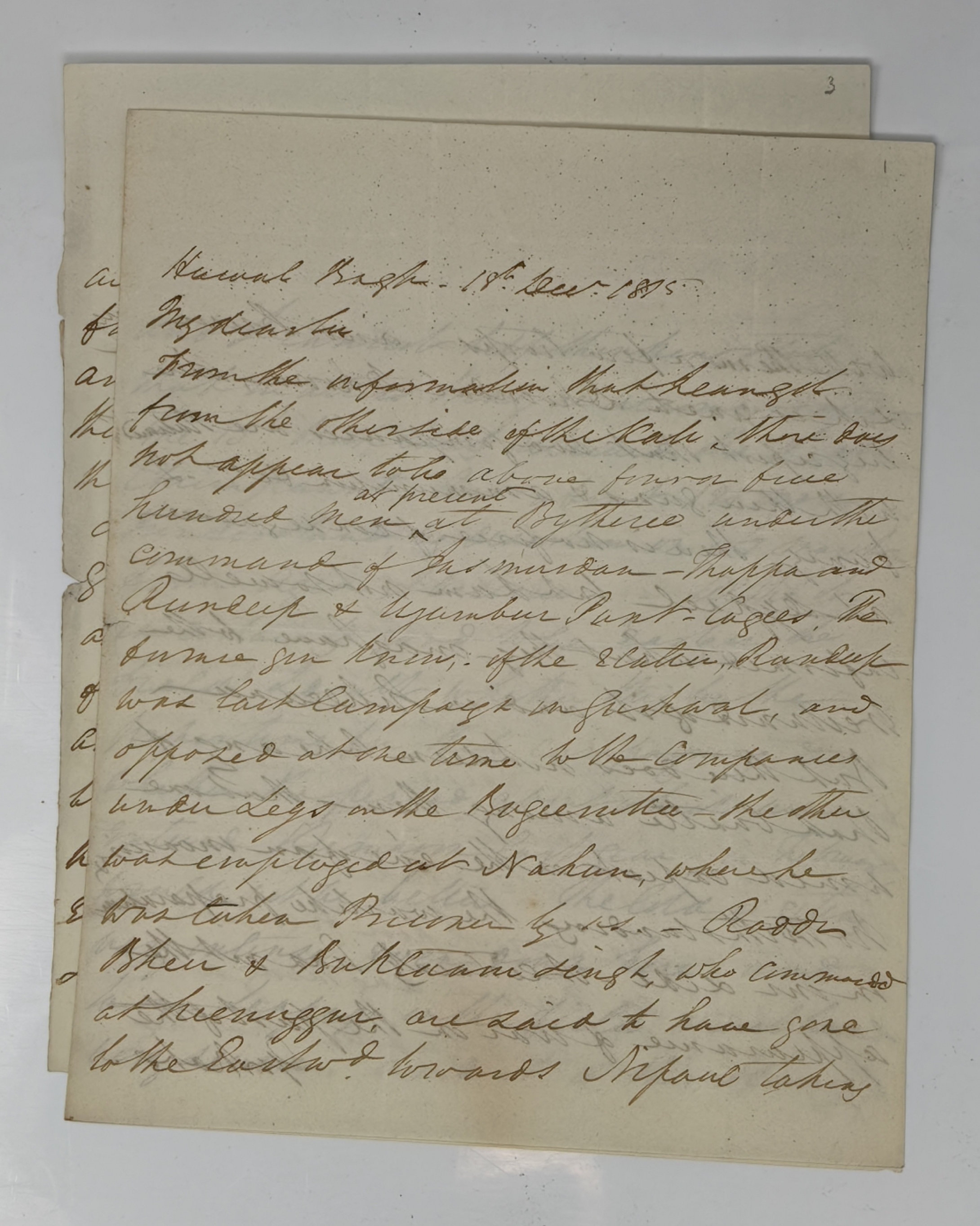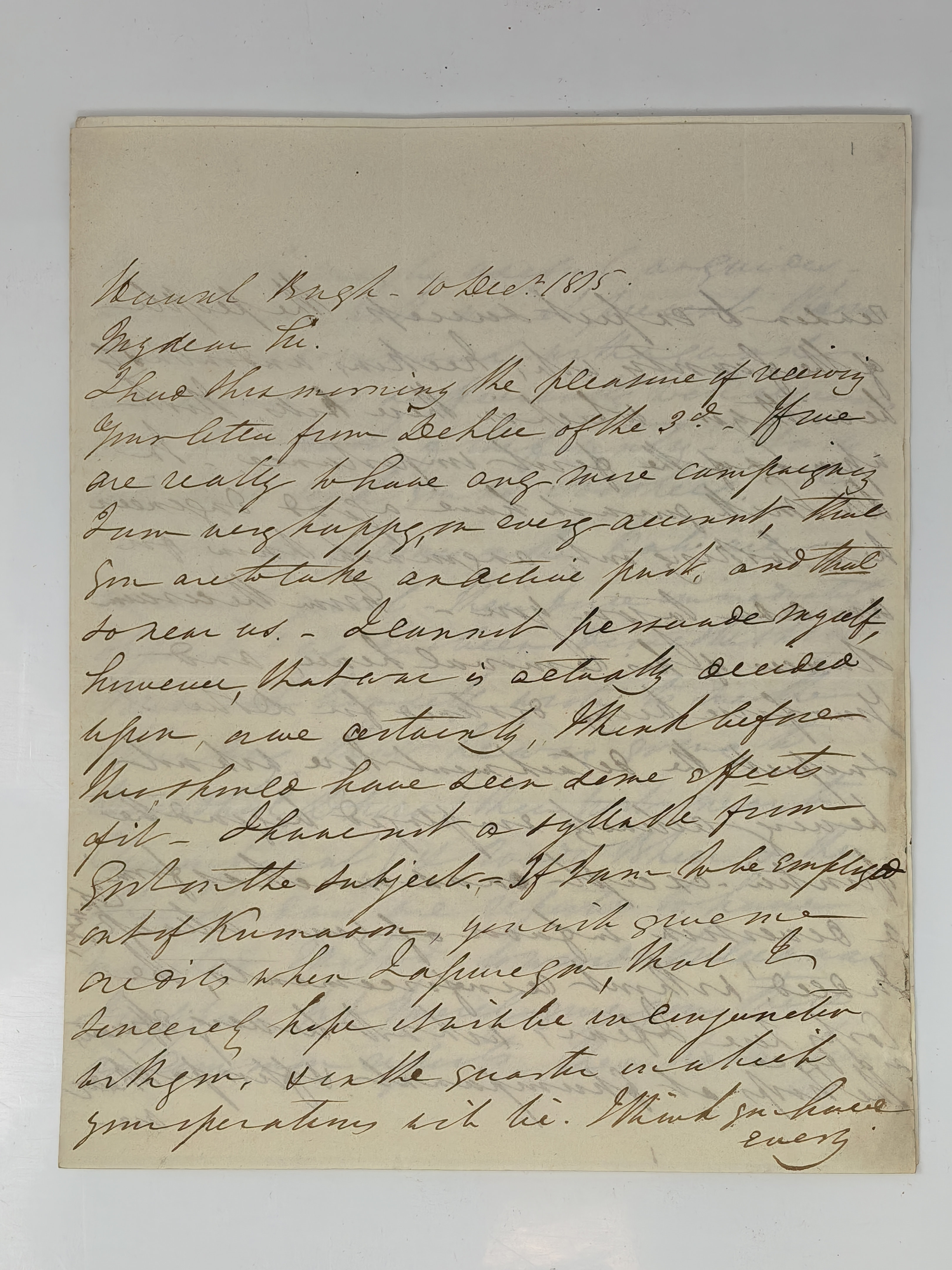 “My dear Sir, From the information that I have got from the other side of the Kali, there does not appear to be above four or five hundred men at present at Bytheree under the command of [names of Nepalese military commanders]. The former you knew, the latter, [Rankeep] was last campaigning in Gurhwal <…>, the other was employed at Nahun where he was taken prisoner by us. [Raddi Bheir & …] are said to have gone to the eastward towards Nipaul taking with them a few troops and Bam Sah is gone to Deenhul Dhora, where they report that two Companies are stationed with their guns & ammunition &c. <…> There does no seem to be any of that bustle among them that one should expect on the eve of an invasion notwithstanding the warlike preparations on our side – it certainly has not the appearance of war on the part of the Gurkhas. <…> The 13th that lately relieved the 11th at Chumpawat lost about 120 men I understand by desertion on its march from Agra <…> Altho’ it is certainly good to be ‘early in the field’ I doubt whether this be the proper time for this campaigning & whether the period about which we entered Kumaon last year – in February, should not be better, The cold is getting very intense even over here and to our Seapoys in the field must be very severe, and it is this I fancy, which they dislike and dread more than anything else <…> I have a letter from Col. Gardner in the neighbourhood of [Sotin] on the Goorukhpour frontier. He says nobody knows anything about the Gurkhas in that quarter. That they are neither seen nor heard of or appear from what he can learn, to be making any preparations for defence. However in not seeing them he says is no proof that they are unprepared for us <…>”