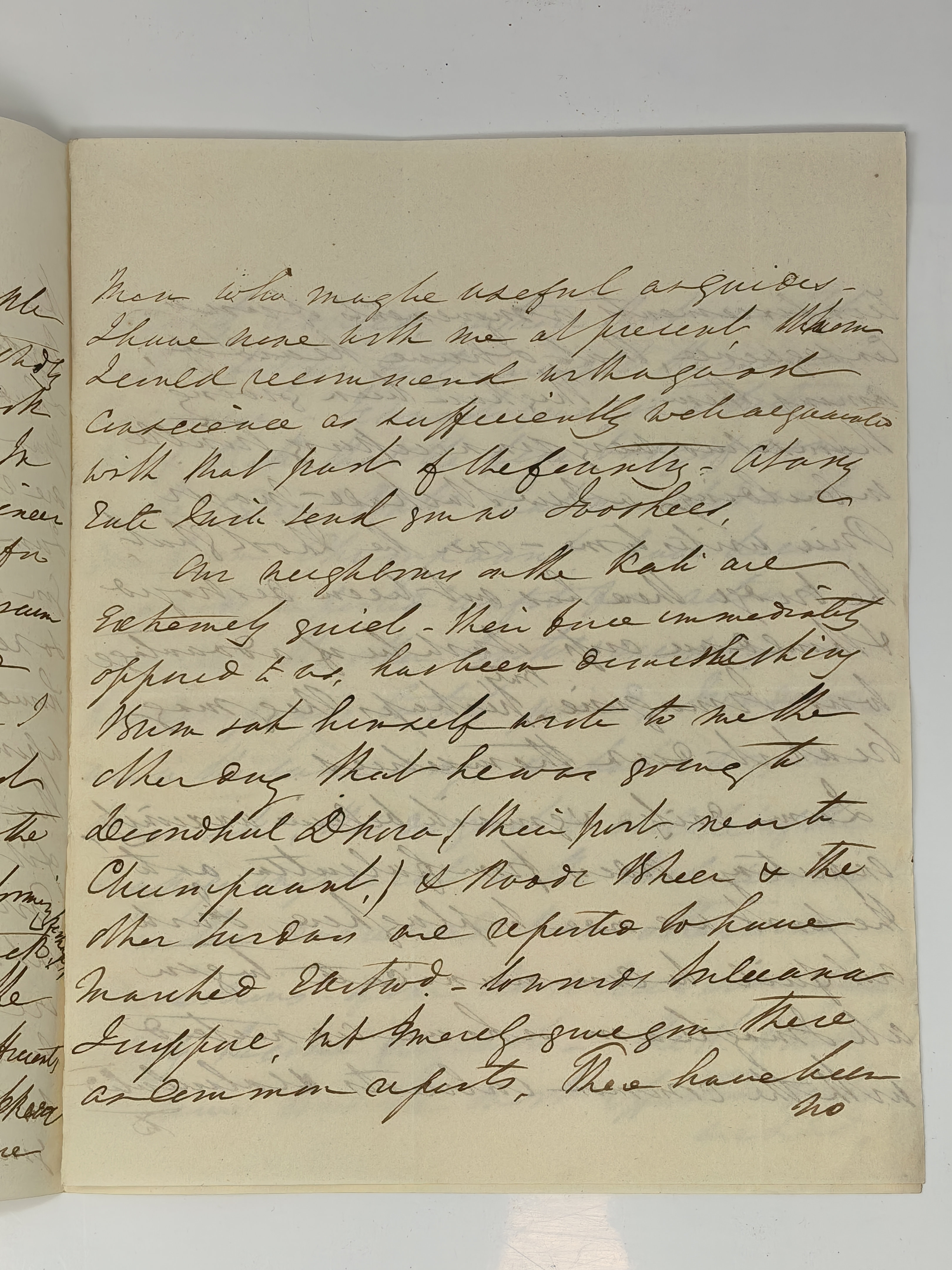 Of the passes into Dotee & Saleena from the […?] I am really too ignorant to pretend to give you information, I will however set about procuring at the intelligence I can & lead it hereafter however trivial it may be, to be added to you stash of knowledge on those subjects. I will also endeavour to get you some men who may be useful as guides, I have here with me at present, whom I could recommend with a good conscience as sufficiently well acquainted with that part of the country. <…>