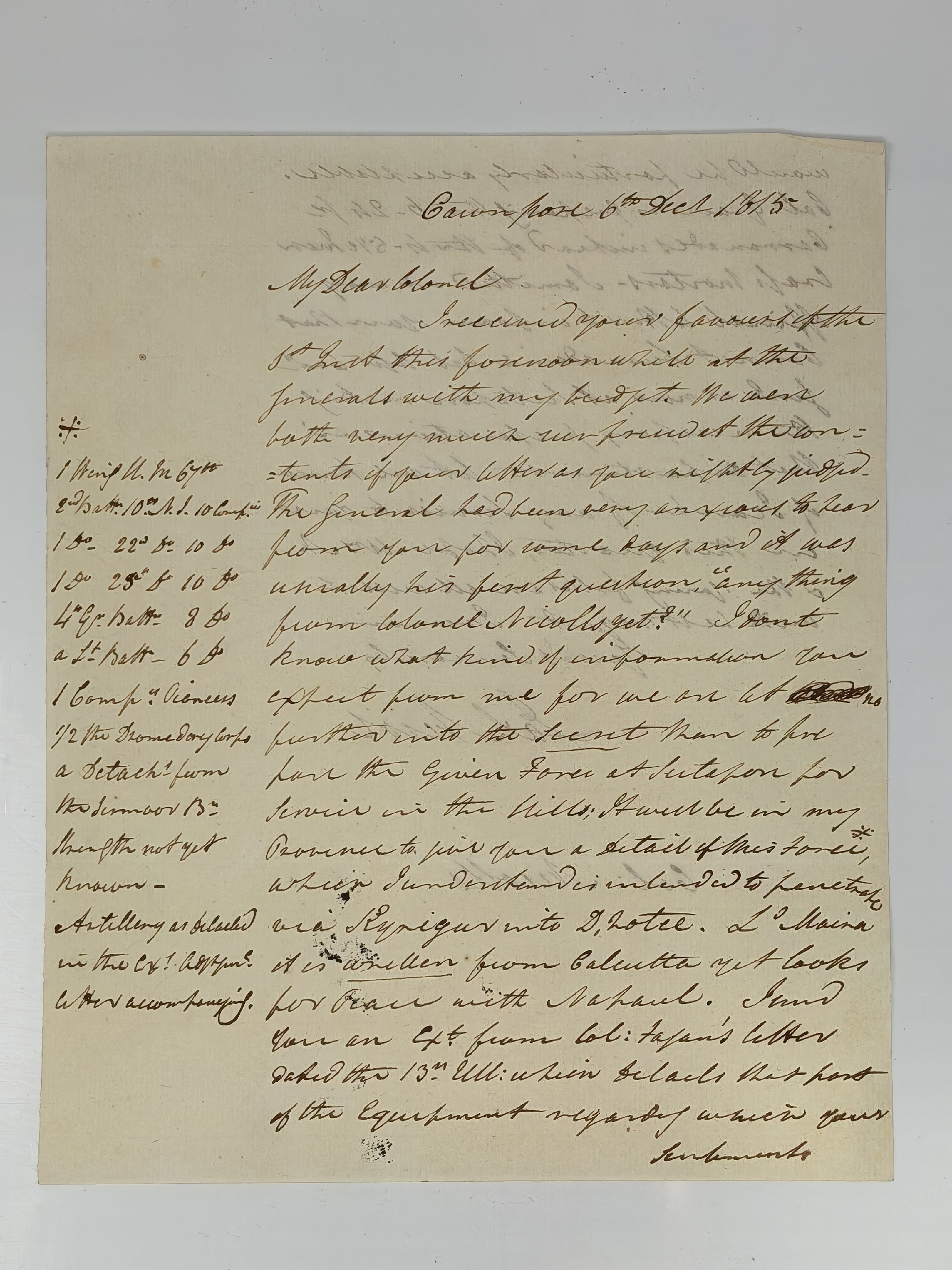 The documents from the collection date back to November-December 1815, the time of the first signing of the peace treaty and the subsequent discovery by the British that the Nepalese government intended to continue military actions. All manuscripts are related to the organization of the British military force, which was being formed in Sitapur (now Uttar Pradesh state of India) under the command of Colonel Jasper Nicolls (future Commander-in-Chief of the Madras Army and Commander-in-Chief, India), with the goal “to penetrate into the provinces of Doti and Salena” in western Nepal (Frontier and Overseas Expeditions from India. Vol. IV, p. 32). Ultimately, Nicolls’ force didn’t take part in the military actions, as a quick, victorious campaign by Major General David Ochterlony south of Kathmandu effectively ended the war.