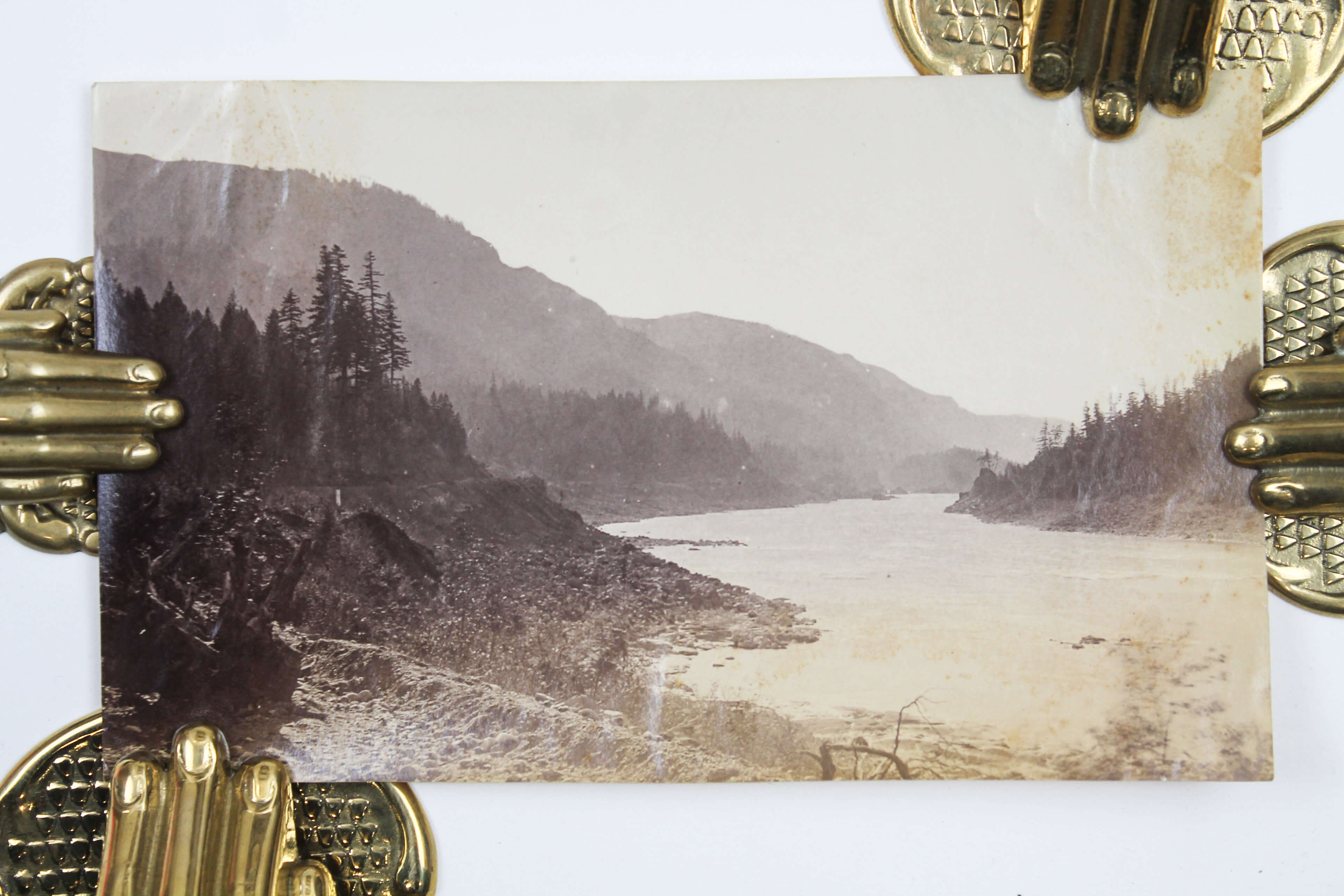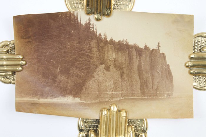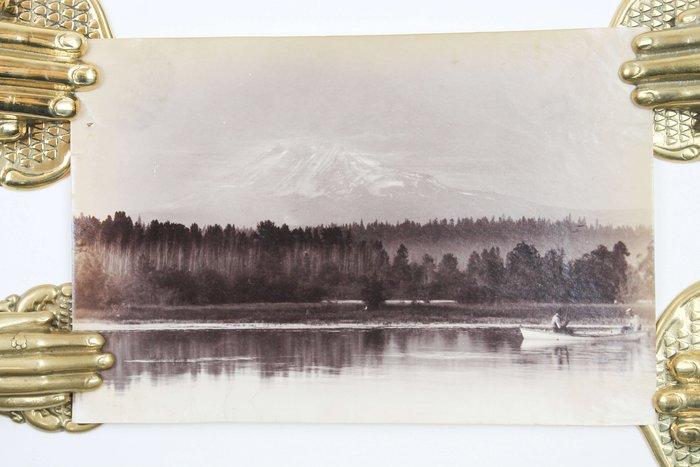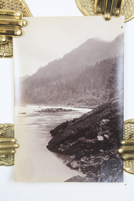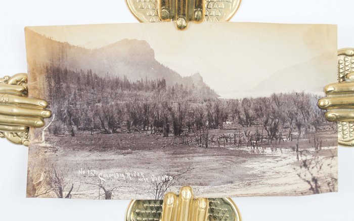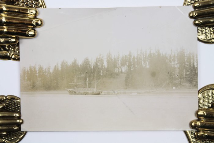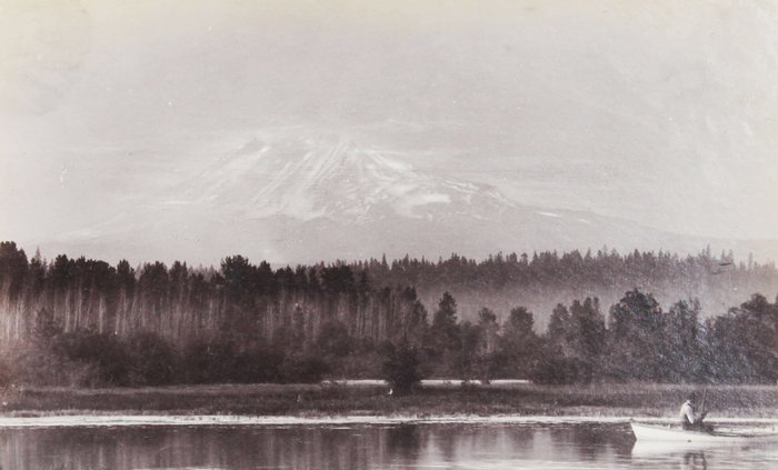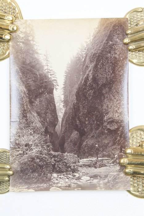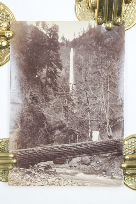 The collection comprises fifteen excellent original gelatin silver photographs apparently taken by an American traveler and his companion (captured from the back in several photos) in the late 1890s. Especially interesting is a well-executed photo of the U.S.S. Nipsic gunboat docked at the Puget Sound Naval Shipyard. The Nipsic arrived at the yard in 1892 and, at the time the photograph was taken, was serving as both a receiving ship and a prison hulk. The image shows the gunboat with a large roof built over the amidships section, used to accommodate personnel and prisoners. Another important photo from the Naval Shipyard shows officer’s quarters, constructed to provide adequate housing for the officers responsible for the shipyard and industrial area. The images depict early grounds of the quarters with several similar buildings erected side by side. The other photographs from the collection feature excellent views of the Columbia River Gorge and its environs, showing Latourelle Falls, Rooster Rock, Beacon Rock, Oneonta Gorge, and Mount Hood.