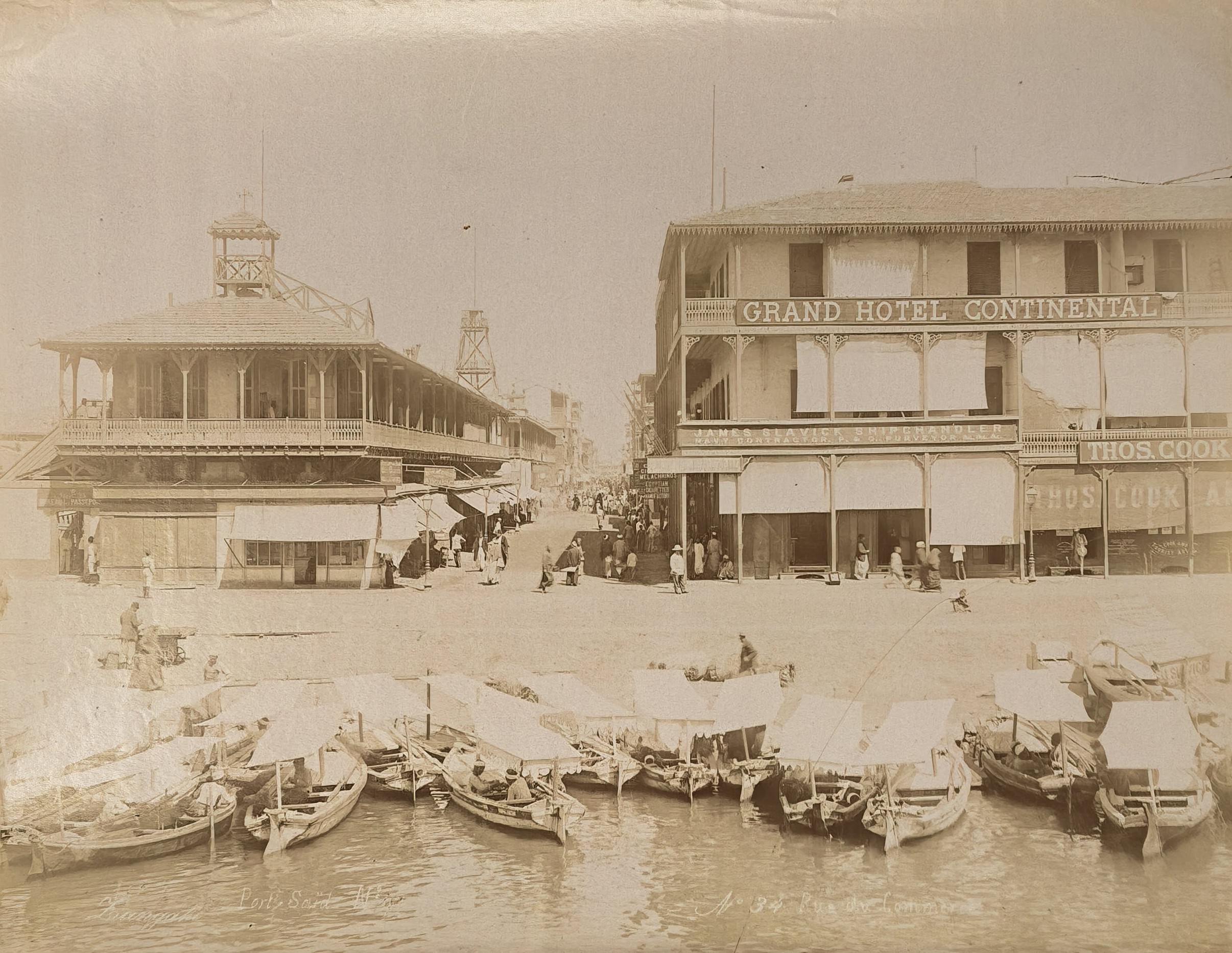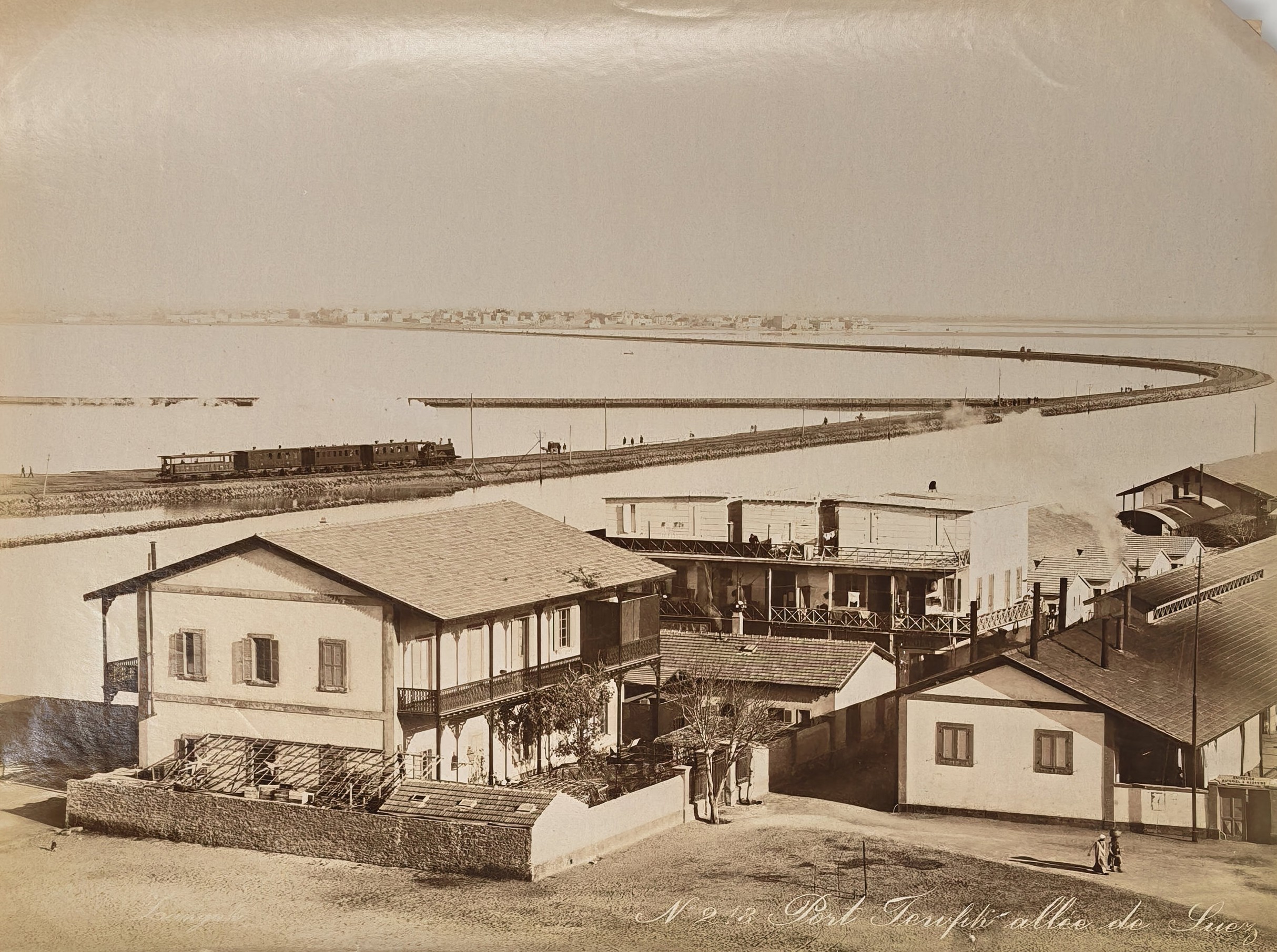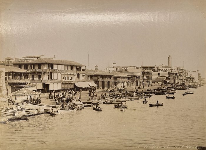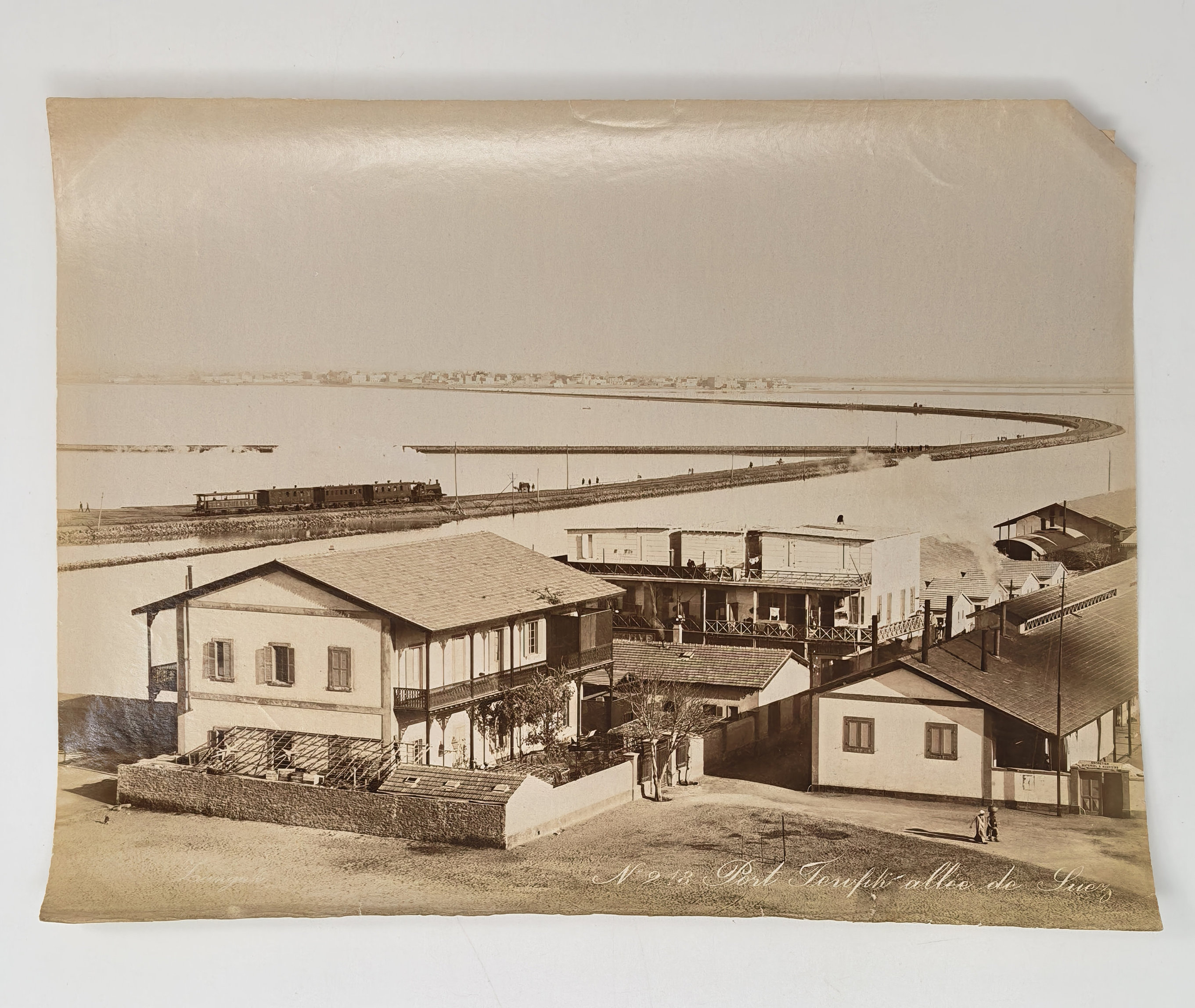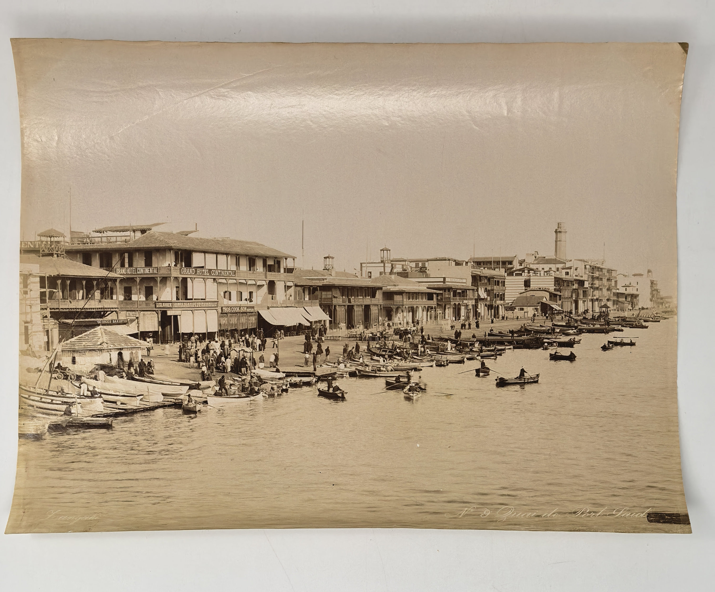 Nine photos of the Pyramids of Giza include general and close-up views of the Pyramids and the Sphinx, featuring Arab villages, Nile channels, camel riders, a traveller in a horse-drawn cart, palm groves, Arab guides atop the Sphinx, &c. Fifteen views of the Suez Canal by Zangaki Brothers show Port Said (general views, Suez Canal Company’s office, the Quay, the Lighthouse, Palais Hollandaise, Rue du Commerce, Eastern Exchange Hotel – including a rare photo when the terraces were not closed off with glass windows), Suez (new quay on reclaimed land/ “quai de terre plein”, Port Tewfik), and several photos of steamers passing through the canal. There are also several portraits of Egyptians and Middle Eastern people (“Chech Arabe,” a man wearing a turban, women wearing elaborate costumes, smoking “le nargile” (hookah), a boy with donkey, an adolescent girl, “Fille de Prince du Mt. Liban”), views of the fallen colossal statue of Ramses II near the ruins of Memphis in Bedrechen/Badrashim, an Arab village on the Nile, &c.