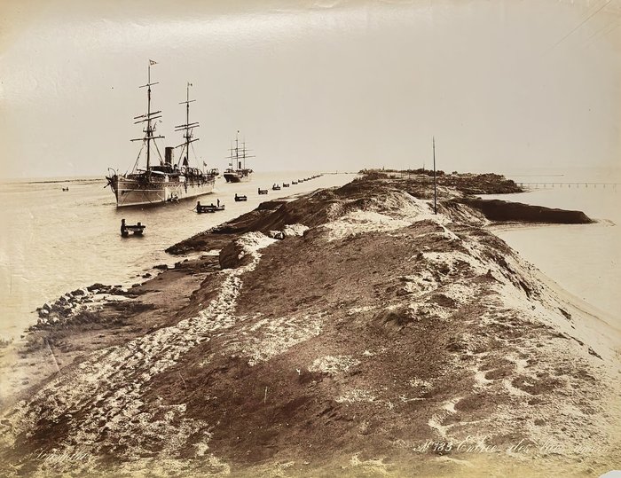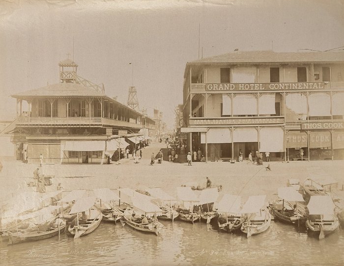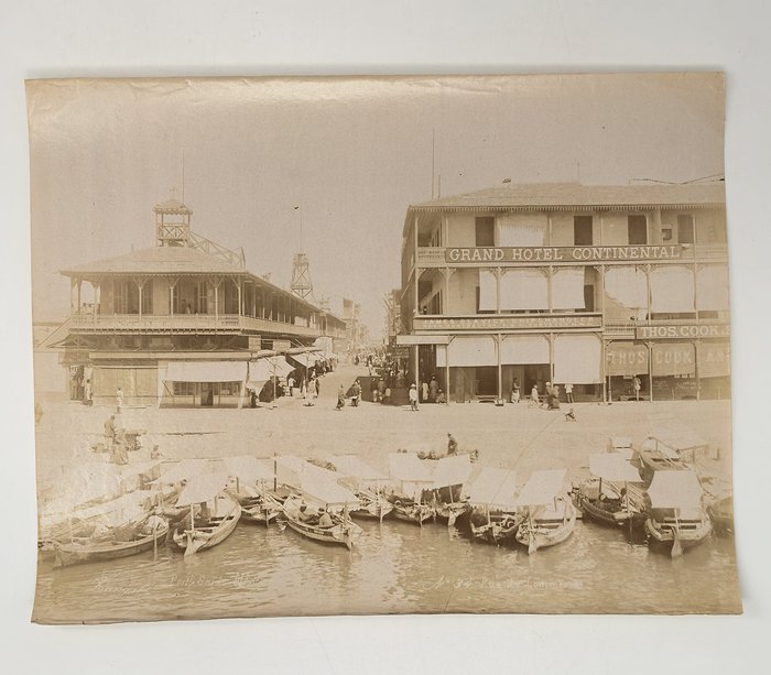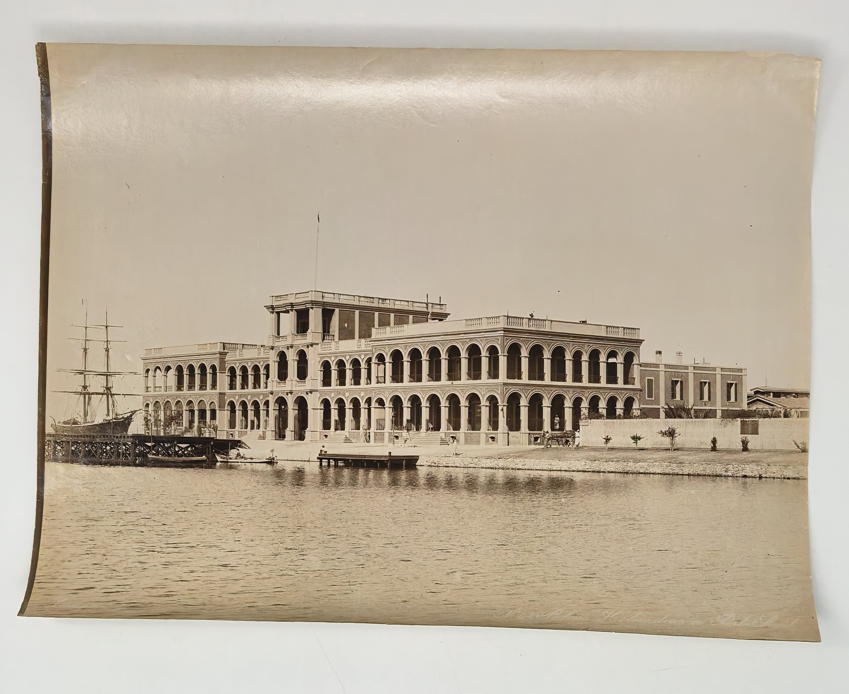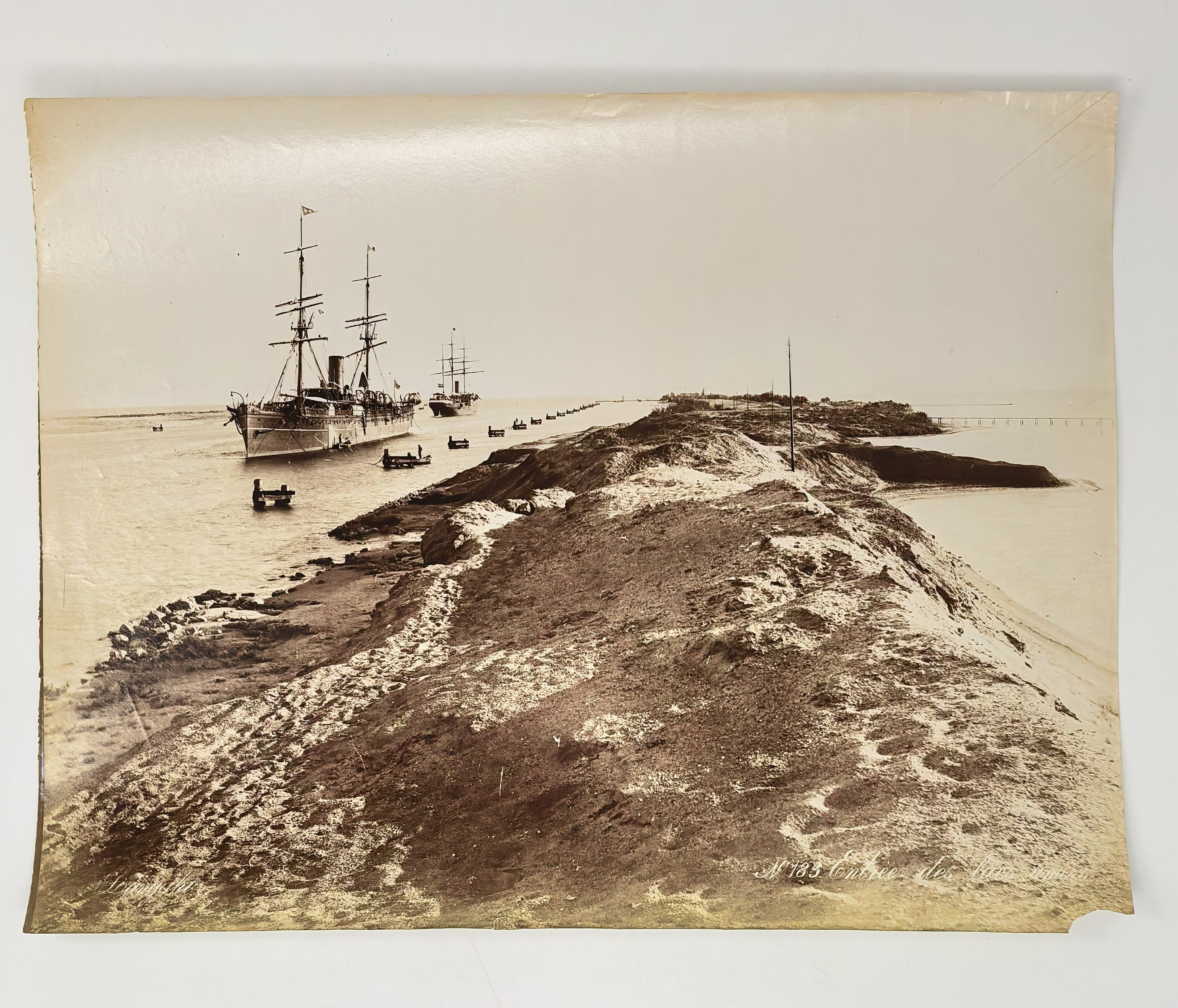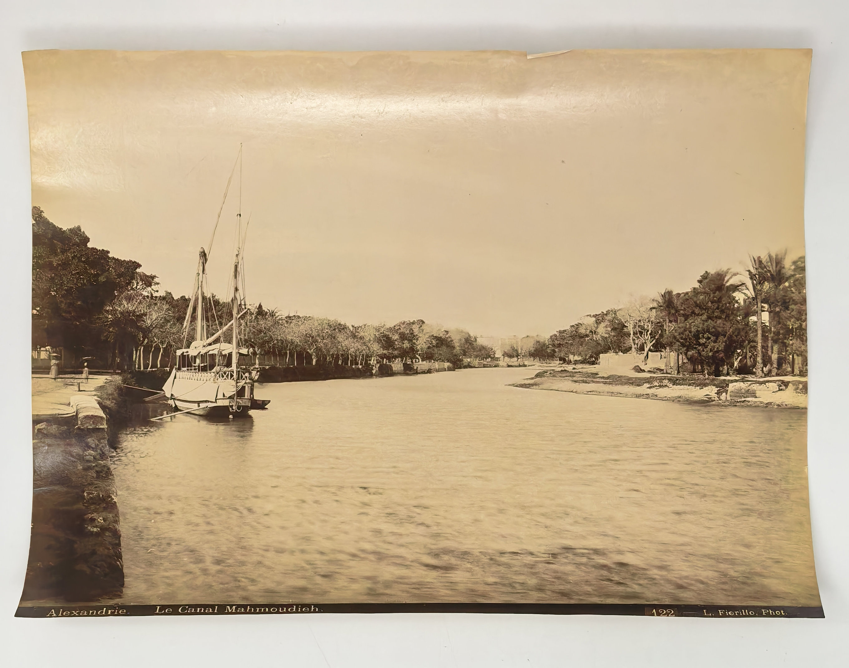 Nine photos of the Pyramids of Giza include general and close-up views of the Pyramids and the Sphinx, featuring Arab villages, Nile channels, camel riders, a traveller in a horse-drawn cart, palm groves, Arab guides atop the Sphinx, &c. Fifteen views of the Suez Canal by Zangaki Brothers show Port Said (general views, Suez Canal Company’s office, the Quay, the Lighthouse, Palais Hollandaise, Rue du Commerce, Eastern Exchange Hotel – including a rare photo when the terraces were not closed off with glass windows), Suez (new quay on reclaimed land/ “quai de terre plein”, Port Tewfik), and several photos of steamers passing through the canal. There are also several portraits of Egyptians and Middle Eastern people (“Chech Arabe,” a man wearing a turban, women wearing elaborate costumes, smoking “le nargile” (hookah), a boy with donkey, an adolescent girl, “Fille de Prince du Mt. Liban”), views of the fallen colossal statue of Ramses II near the ruins of Memphis in Bedrechen/Badrashim, an Arab village on the Nile, &c.