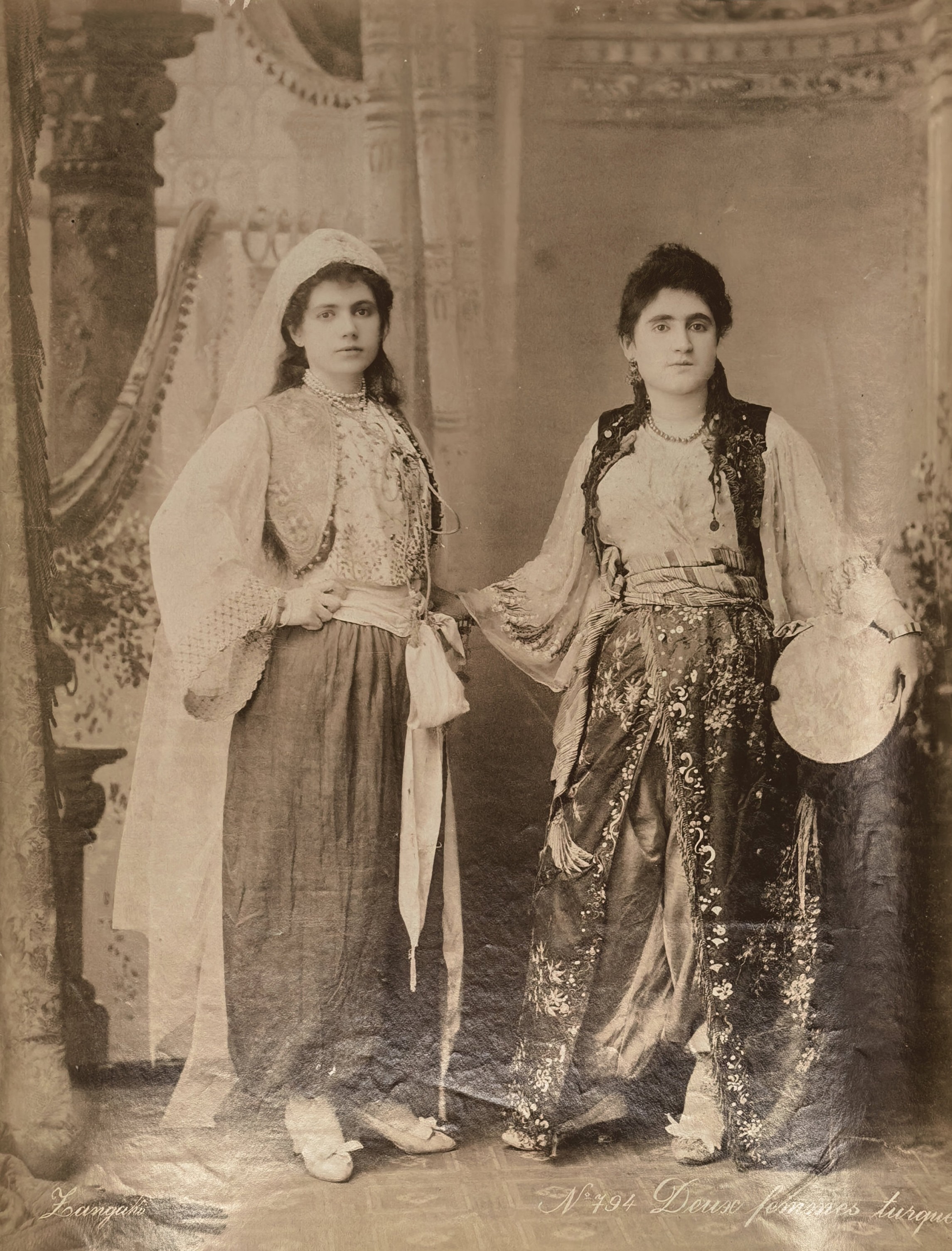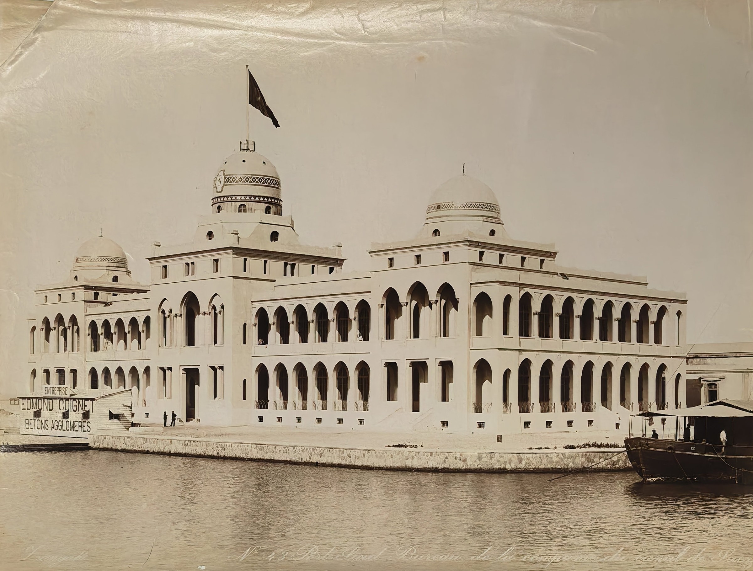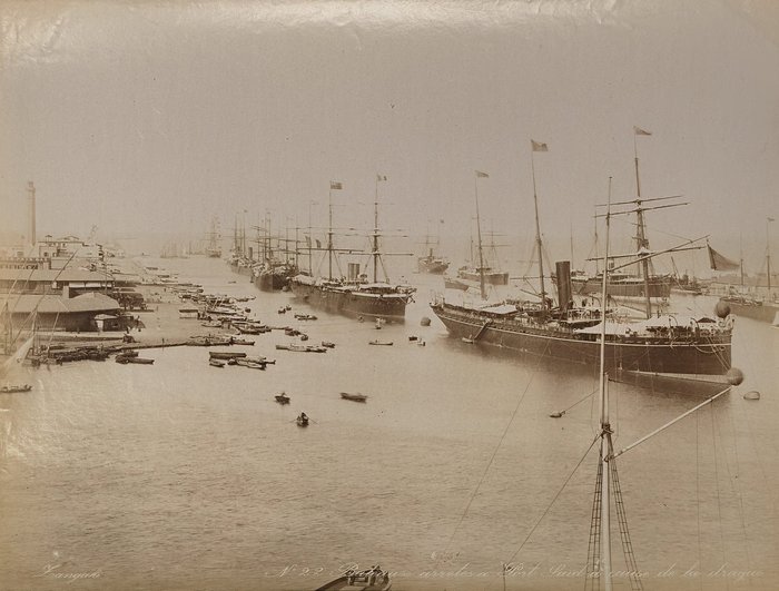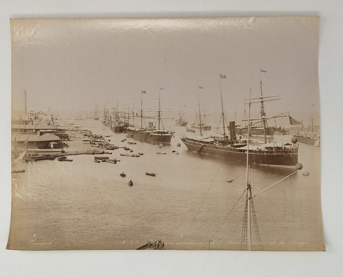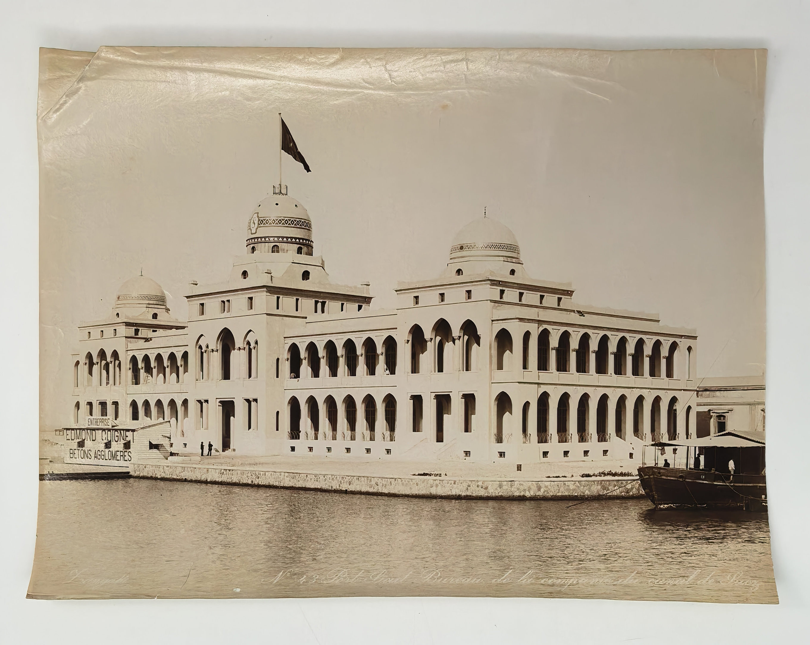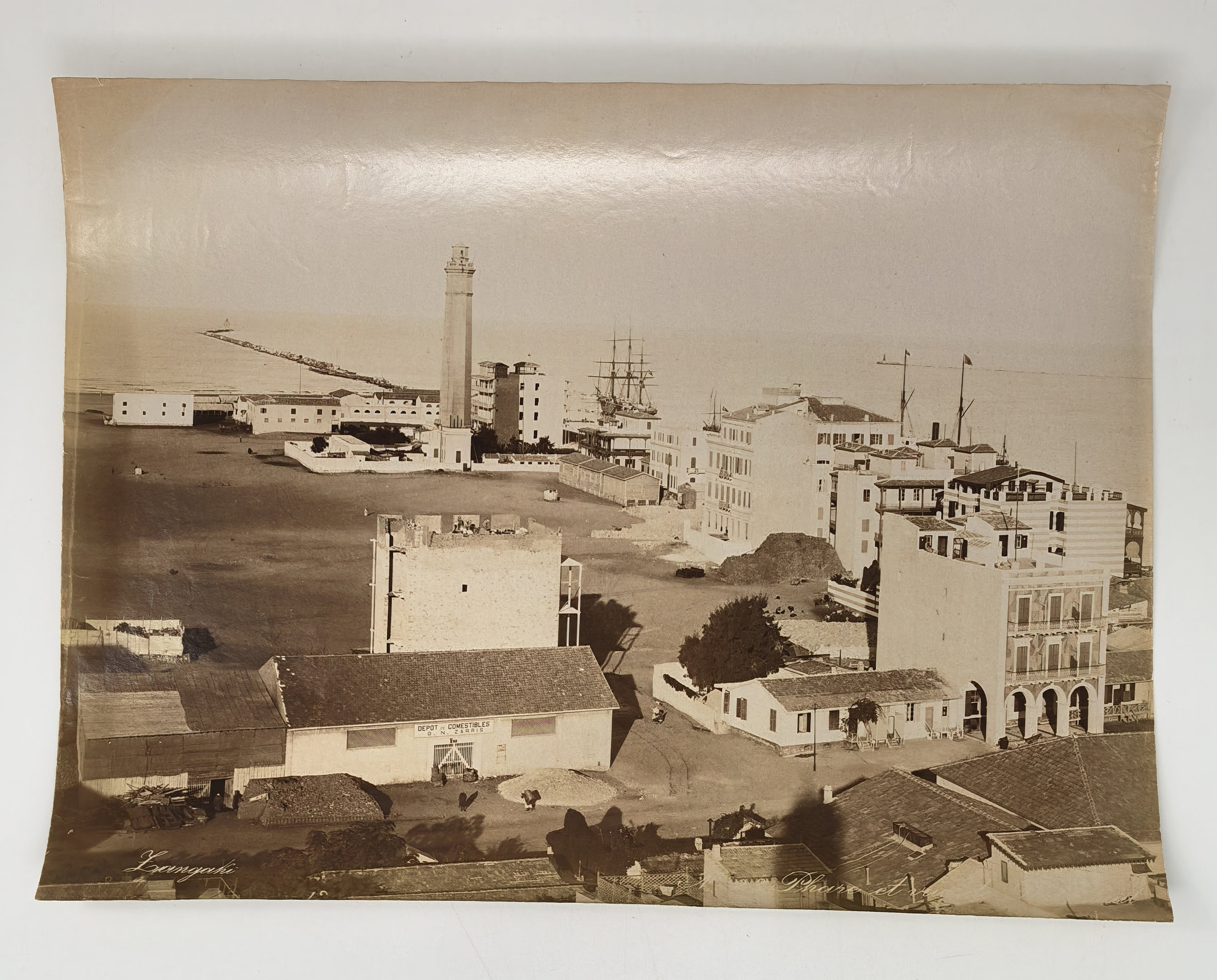 Nine photos of the Pyramids of Giza include general and close-up views of the Pyramids and the Sphinx, featuring Arab villages, Nile channels, camel riders, a traveller in a horse-drawn cart, palm groves, Arab guides atop the Sphinx, &c. Fifteen views of the Suez Canal by Zangaki Brothers show Port Said (general views, Suez Canal Company’s office, the Quay, the Lighthouse, Palais Hollandaise, Rue du Commerce, Eastern Exchange Hotel – including a rare photo when the terraces were not closed off with glass windows), Suez (new quay on reclaimed land/ “quai de terre plein”, Port Tewfik), and several photos of steamers passing through the canal. There are also several portraits of Egyptians and Middle Eastern people (“Chech Arabe,” a man wearing a turban, women wearing elaborate costumes, smoking “le nargile” (hookah), a boy with donkey, an adolescent girl, “Fille de Prince du Mt. Liban”), views of the fallen colossal statue of Ramses II near the ruins of Memphis in Bedrechen/Badrashim, an Arab village on the Nile, &c.