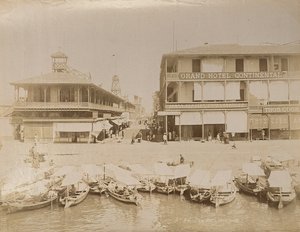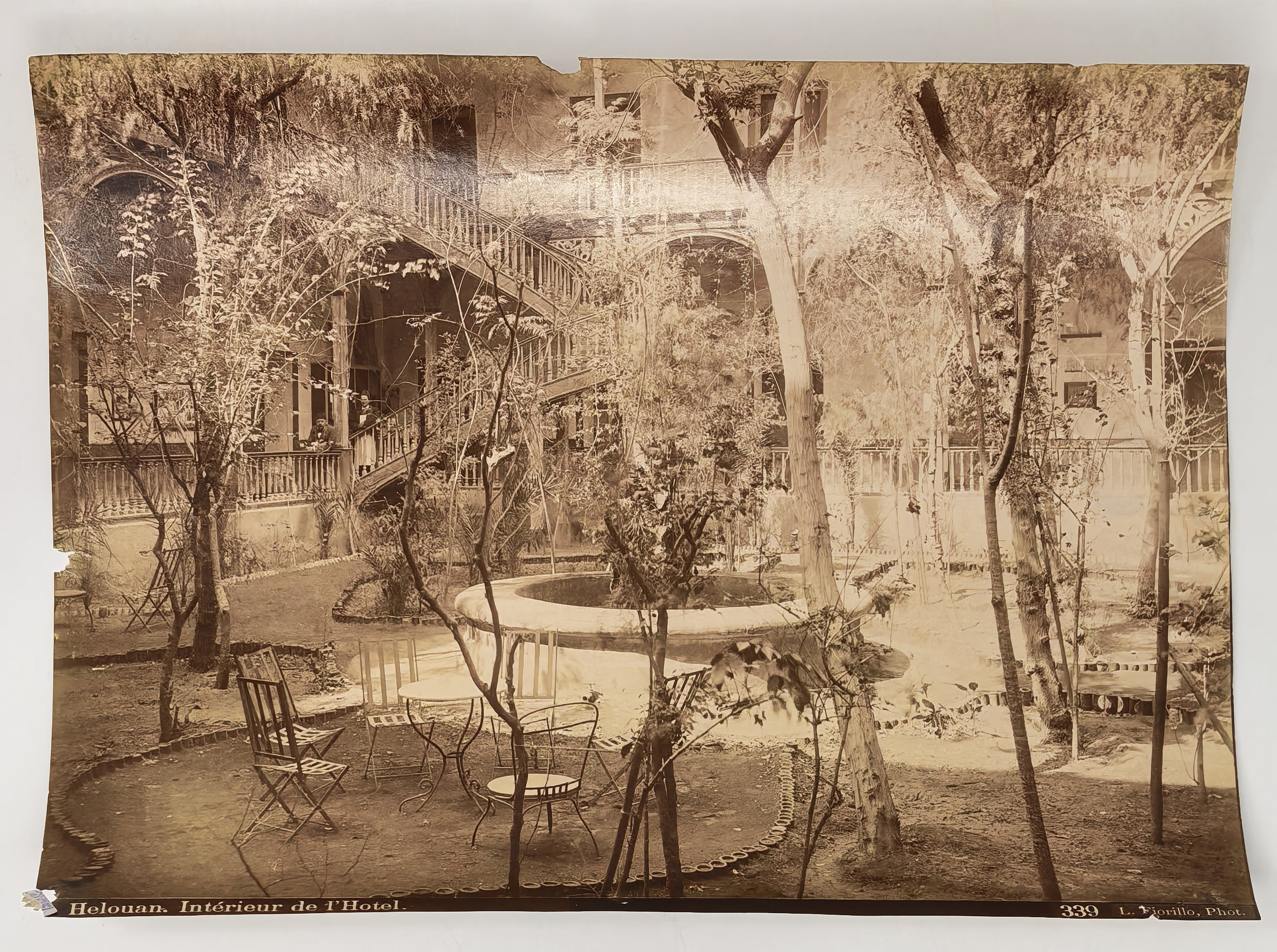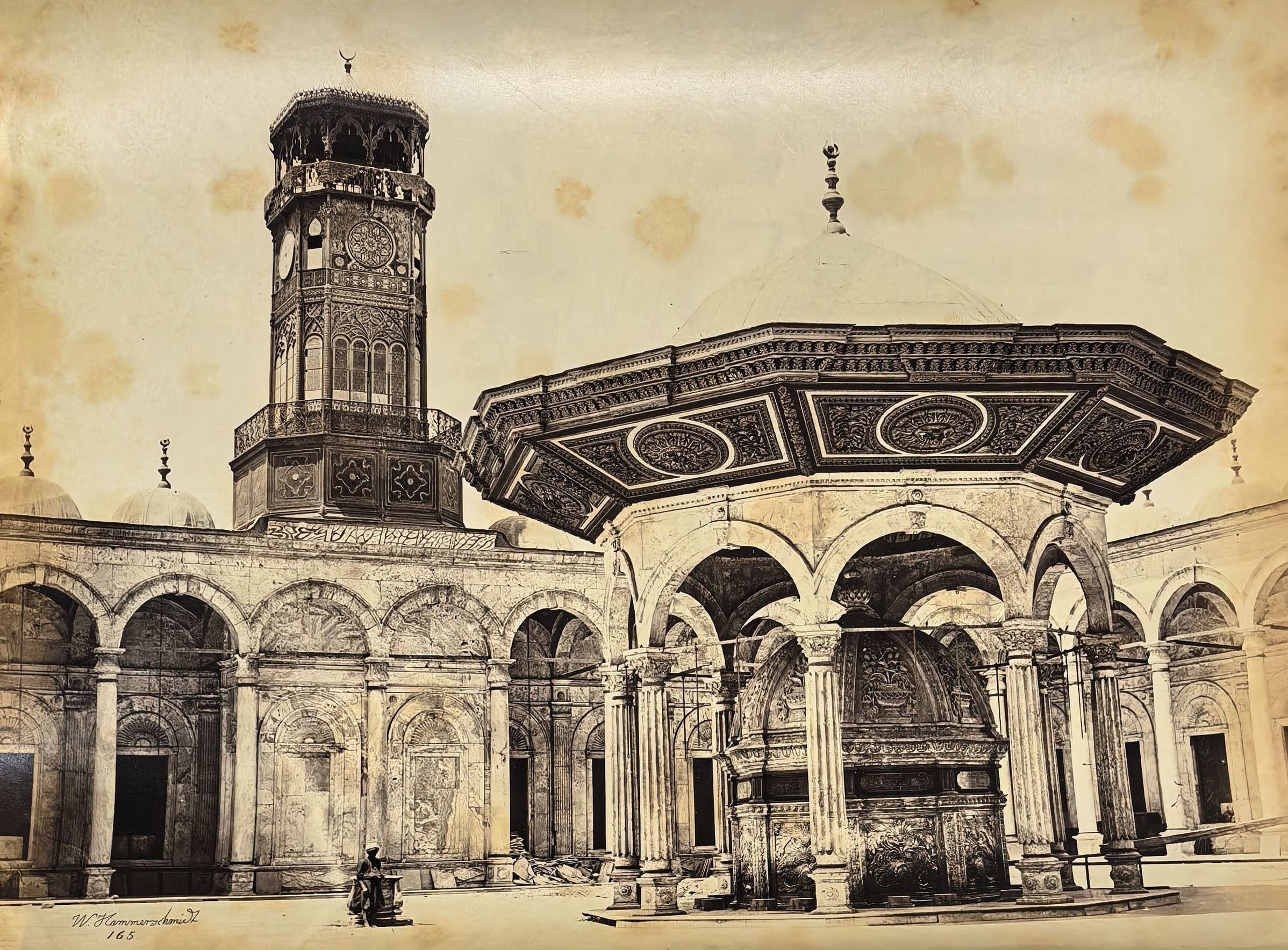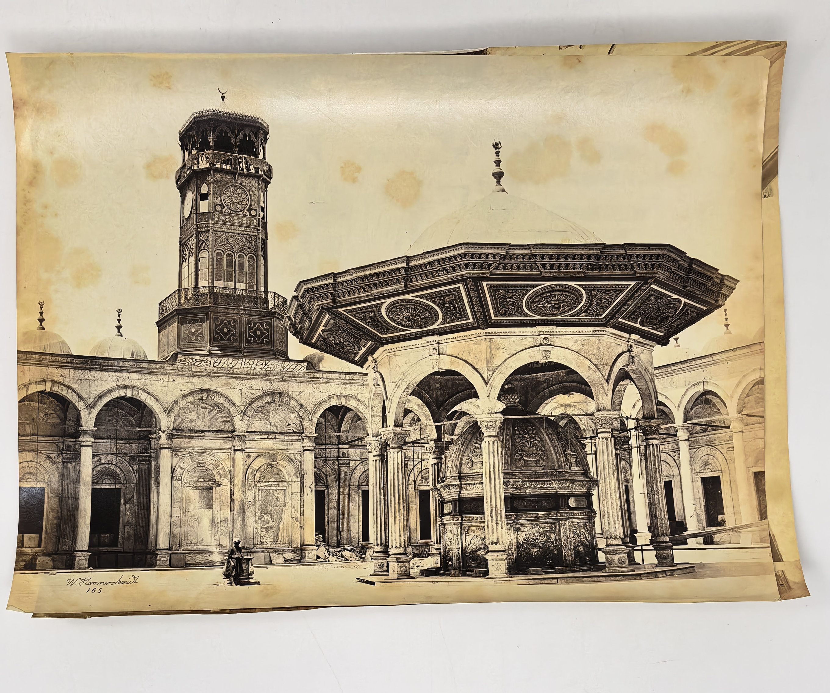 Over a dozen views of Cairo (including two early images by Wilhelm Hammerschidt) show the city with the Delta Barrage in the background, Citadel and Muhammad Ali mosque, Necropolis with the Citadel in the background, lion sculptures at the entrance to Qasr el Nil/El Gezira bridge, opening of the El-Gezira bridge for the water traffic, Gezira Palace, Ablution Fountain in the courtyard of Muhammad Ali mosque, interior of Sultan Barquq mosque, a street in old Cairo, garden in the courtyard of a hotel in Helwan, “village Com-el-Assuit,” &c.