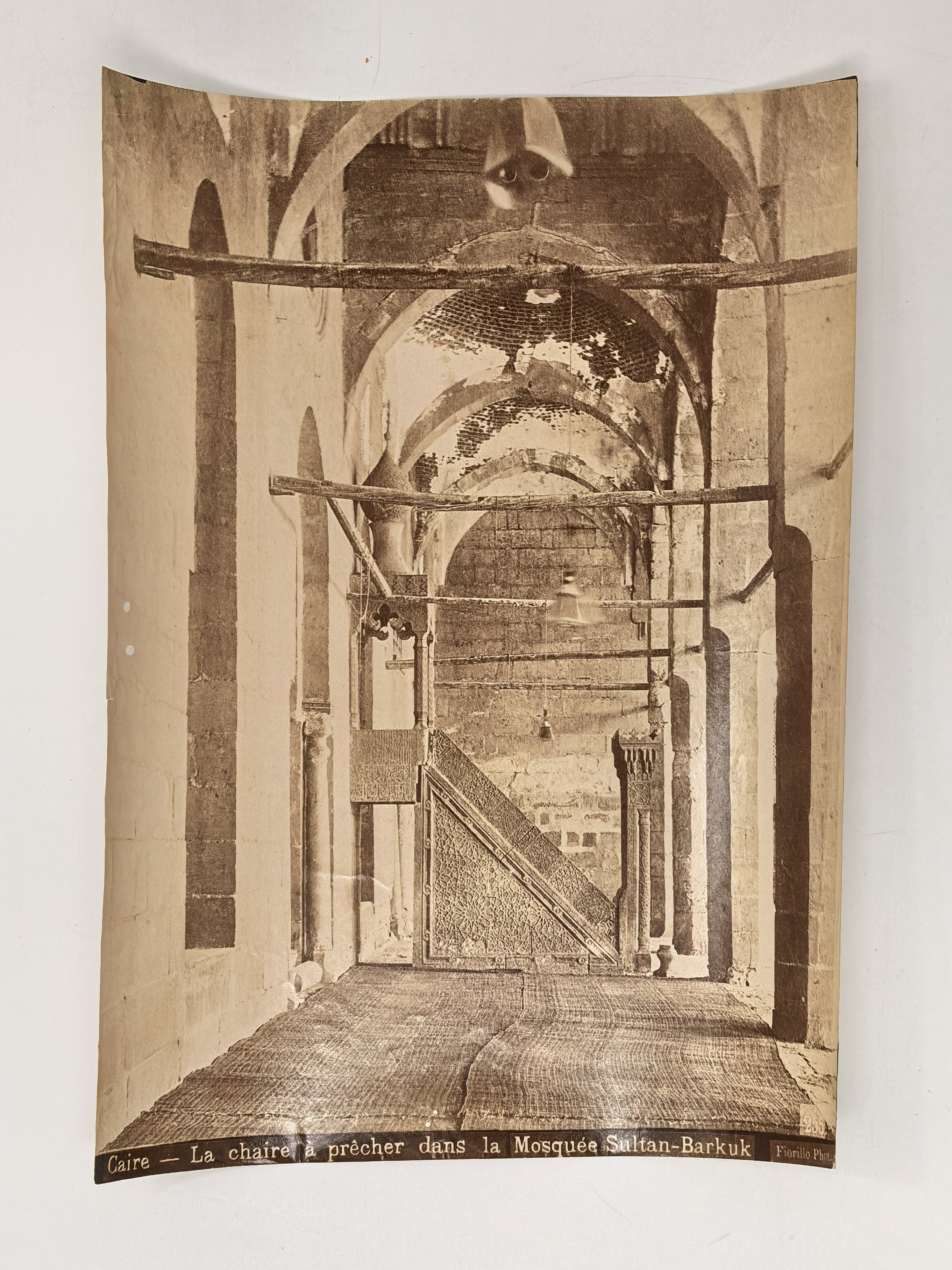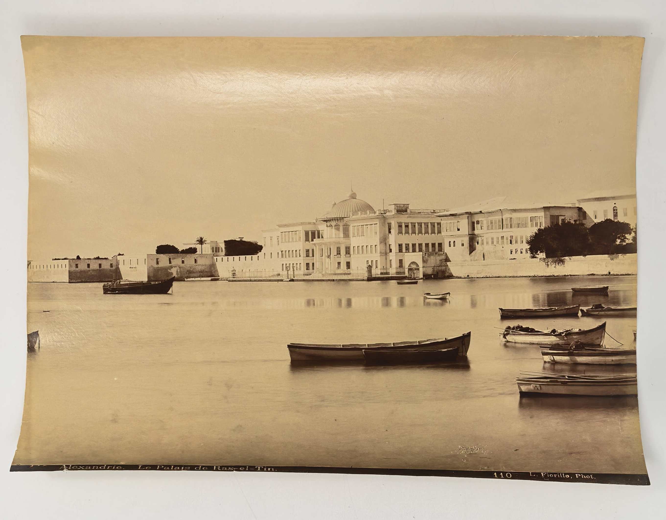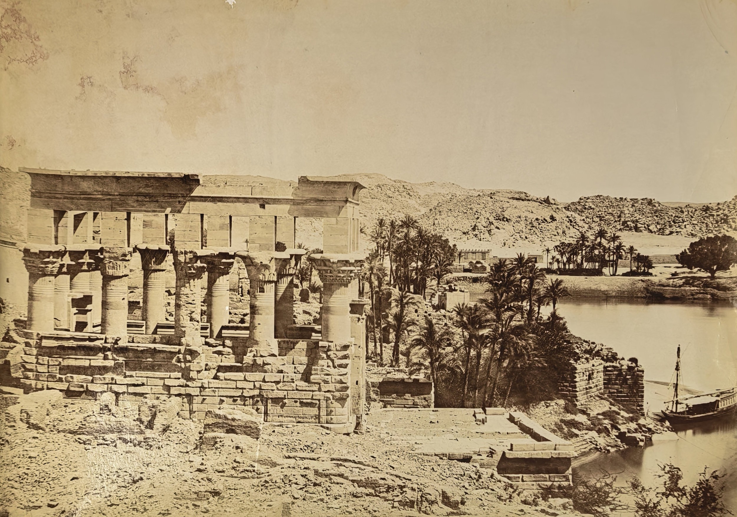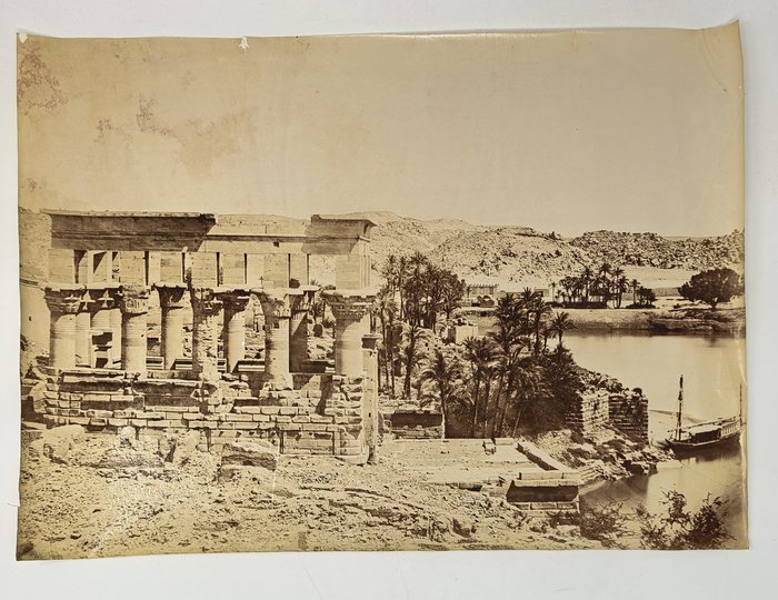 Historically significant, extensive collection of seventy-five original albumen photos of Egypt and its people, taken by several prominent studios of the second half of the 19th century. The largest image is an early view of the Kiosk of Trajan (part of the Temple of Isis) on the island of Philae, looking north, with the Nile bank and a docked dahabiya on the right. Six early photos by Francis Frith (dating back to ca. 1857-1558), mounted on period album leaves, include three views of Cairo (a distant view of the Citadel and Muhammad Ali mosque taken from the Mokattam Hills, madrasa and mosque of Sultan Qaytbay, a street in the Old Cairo area), and three of the Near East - Baalbek temple complex (columns of the temple of Jupiter with the temple of Bacchus in the back), the north shore of the Dead Sea and Mount Horeb, Sinai.