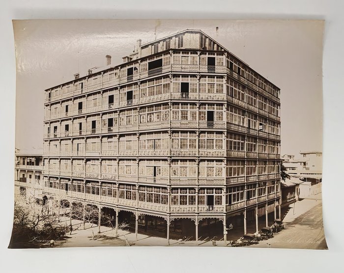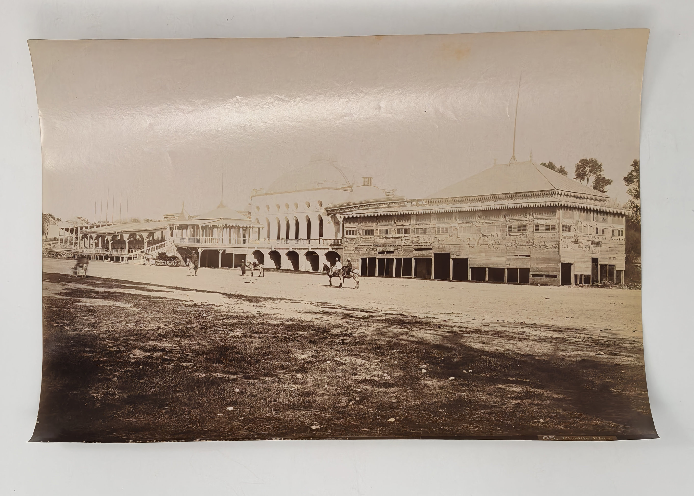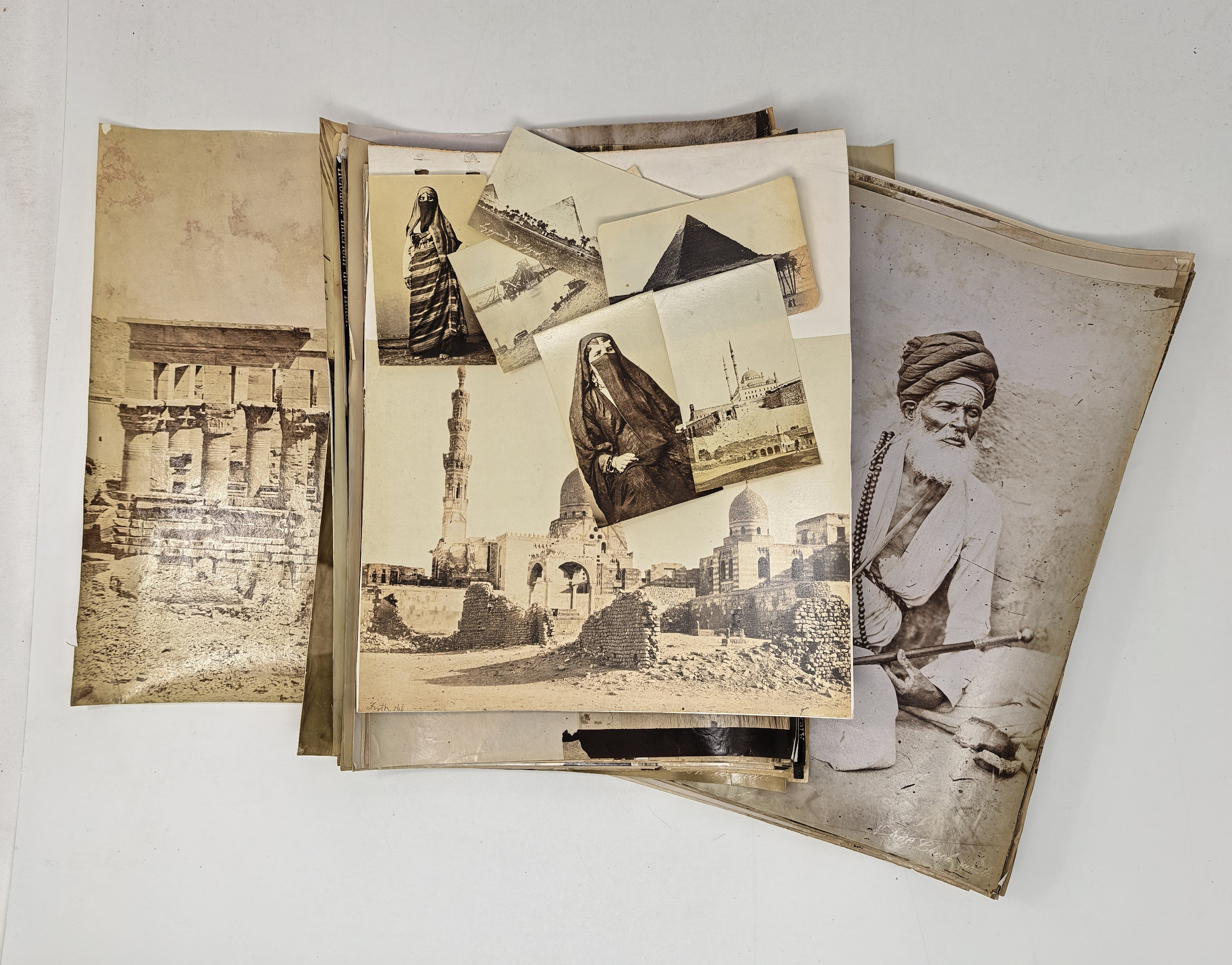 Seventy-five original albumen photos, including one large image ca. 26x36 cm (10x14 in), 57 photos from ca. 22,5x28,5 cm (8 ¾ x 11 ¼ in) to ca. 18x25 cm (7 ¼ x 9 ¾ in), 11 images from ca. 16x23 cm (6 ¼ x 9 in) to ca. 11x19,5 cm (4 ¼ x 7 ½ in), and six smaller photos ca. 5,5x9 cm (2 ¼ x 3 ½ in) or slightly smaller. Over fifty images with captions and/or numbers in negative; over forty with the photographers’ credentials in negative; ca. twenty-five with period pencil captions on verso. Six images by Francis Frith mounted on period album leaves; all but one with his signatures in negative; four with later red pen captions on verso. Most photos slightly waved, minor creases or tears on extremities, several with remnants of old mounts on verso, one with two holes in the left upper corner, one with old repairs with tape on the margins, a few photos mildly faded, but overall a very good collection of interesting photos.