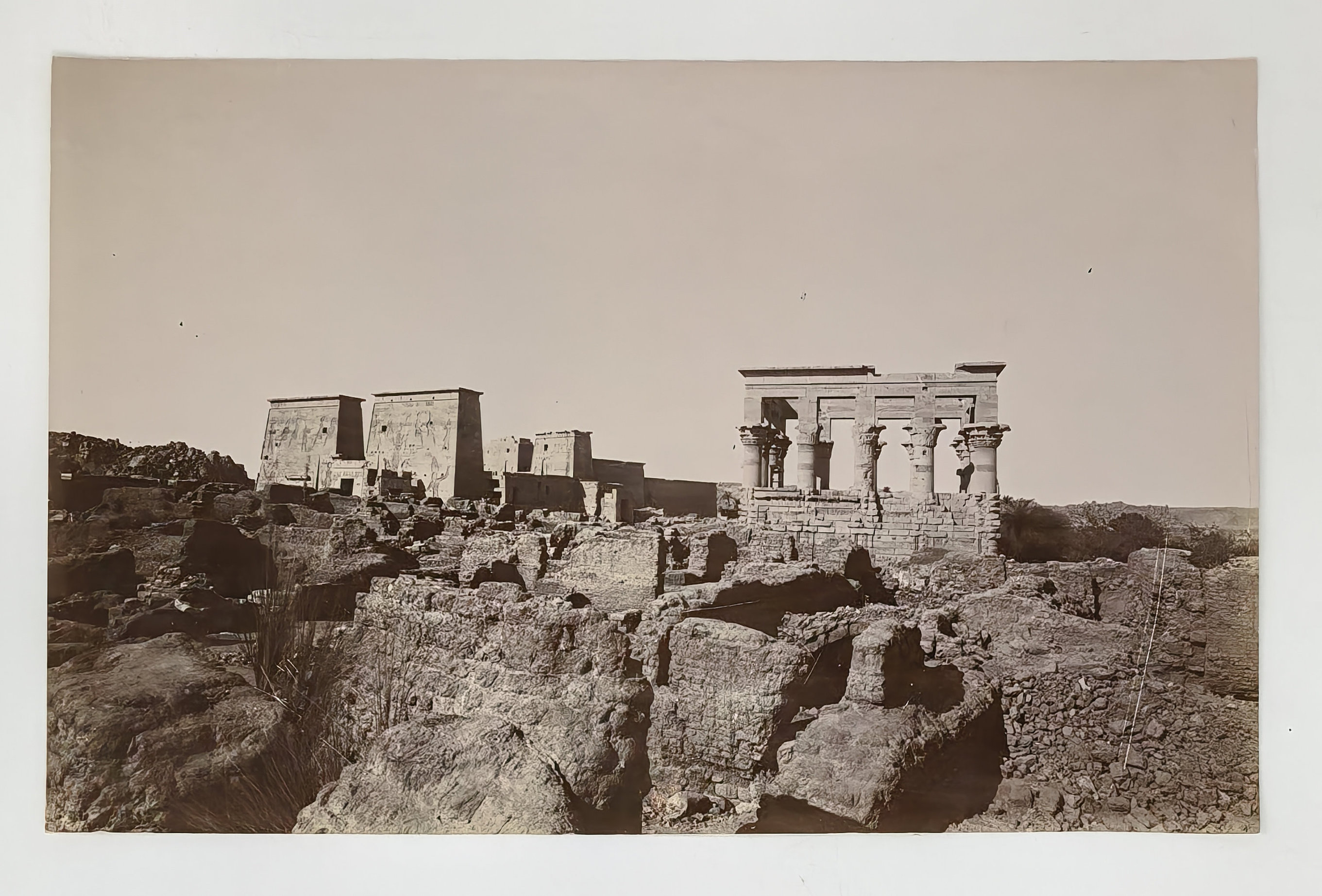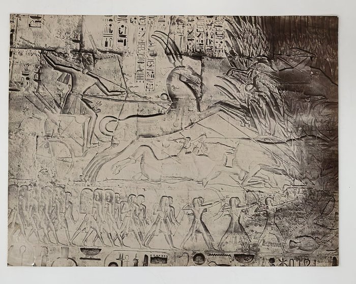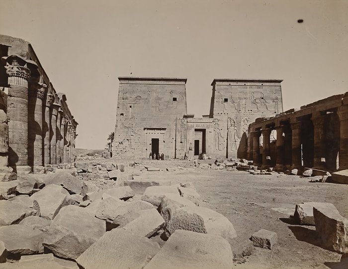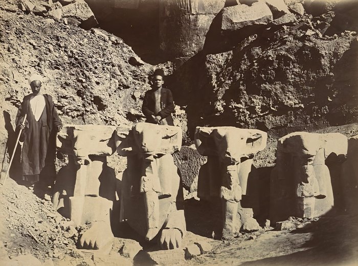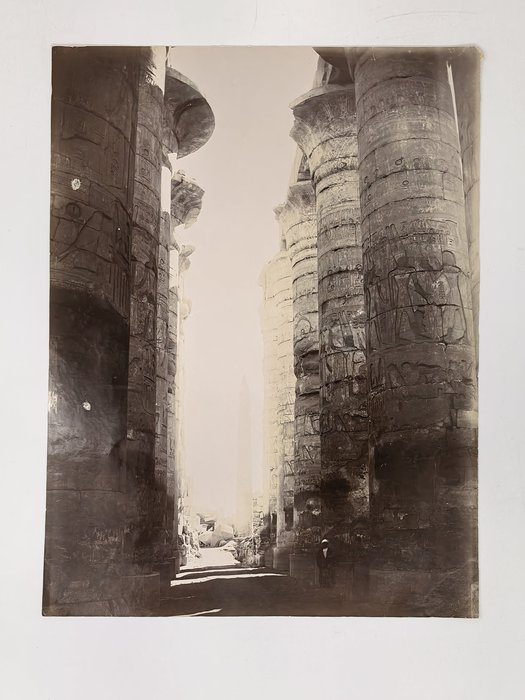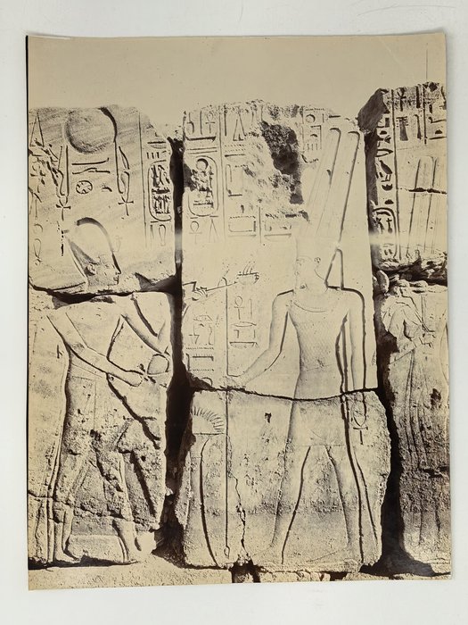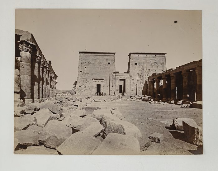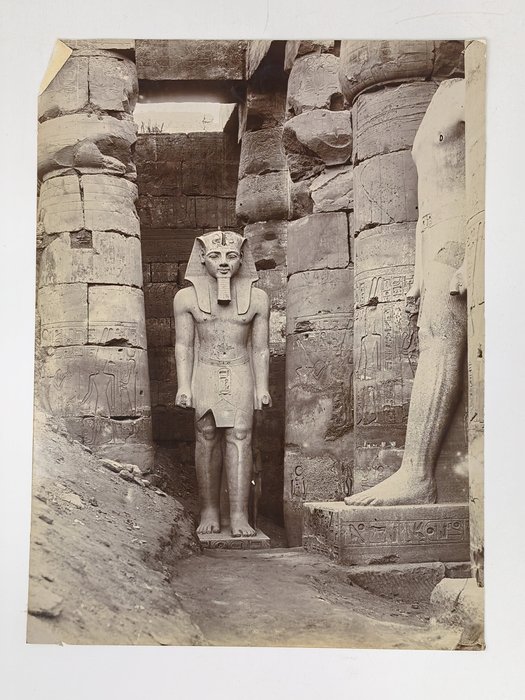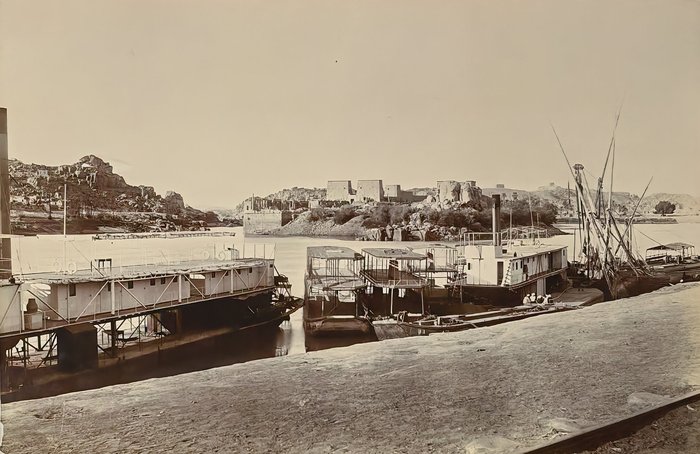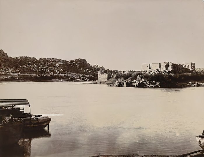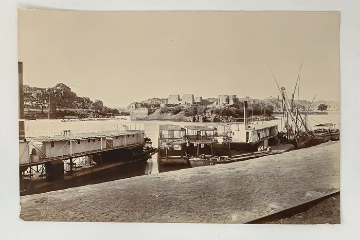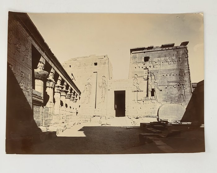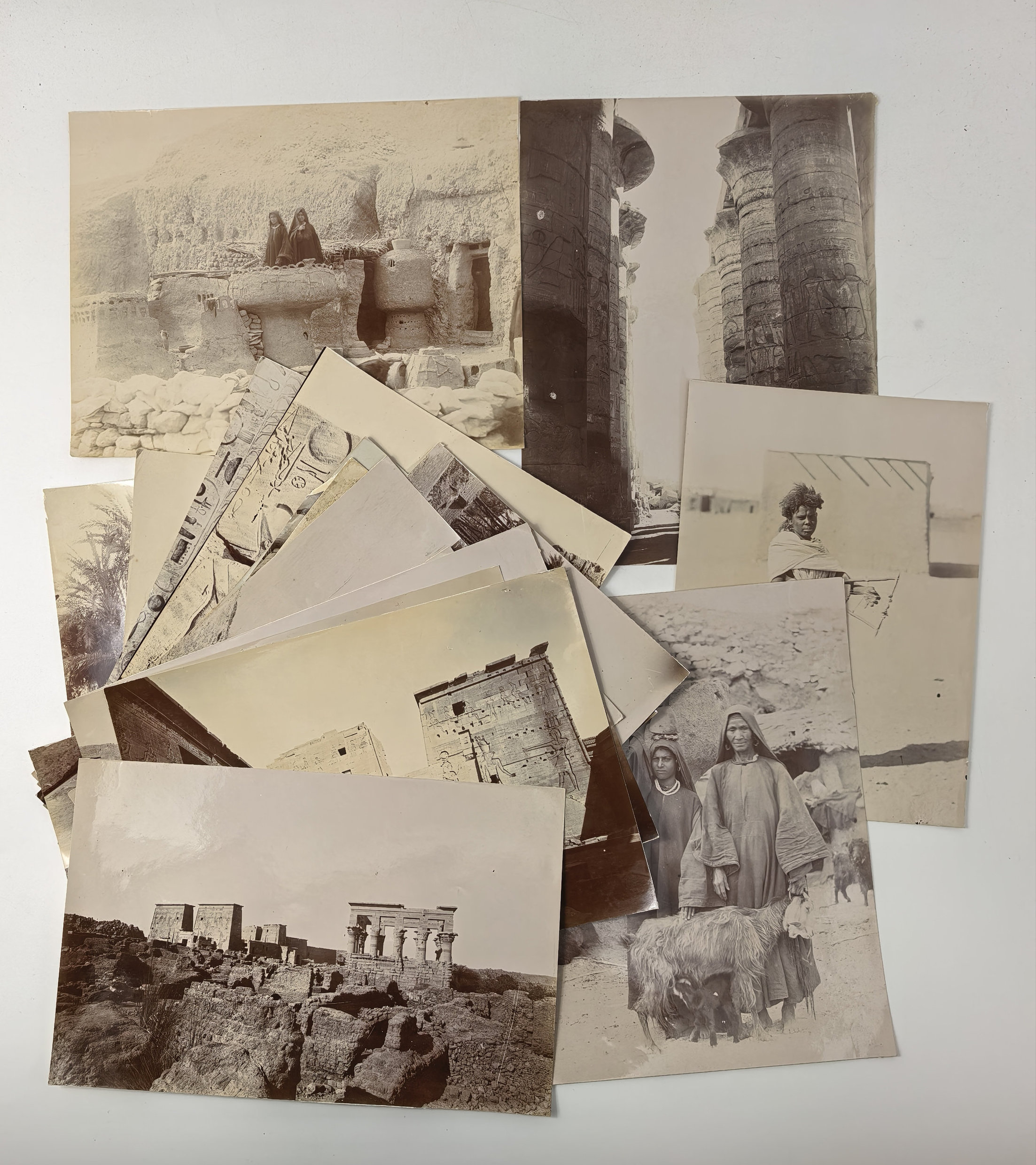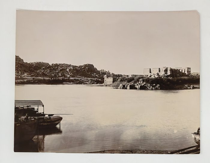 Interesting collection of original gelatin silver amateur photos of Egypt, taken by European travellers (likely, French) in the late 19th century. The collection includes a series of views of the Philae Temple and its environs, dating to before the island of Philae was flooded by the construction of the Aswan Low Dam in 1902. The photos show the island and the temple from the distance across the Nile River, as well as closer views of the Trajan’s Kiosk, the Second Pylon, the Mammisi building and the colonnade; two excellent photos of the Nile’s First Cataract (submerged after the construction of the Aswan Low Dam), and three views of the “Chellal” (Shellal) village south of Philae Island, where the trips to the temple departed from (tourist boats docked at the Nile bank, travellers on donkeys in the village). Other images show the Karnak Temple (Great Hypostyle Hall, Egyptian guides posing next to the partly-excavated ram sculptures of the Ram’s Road, interior of the Third or Fourth Pylon), statue of Ramses II in the partly-excavated courtyard of the Luxor Temple, the entrances to the tombs of the Theban Necropolis, flooded “Colosses de Memnon pendant l’inondation,” and two ancient Egyptian bas-reliefs: the first from the Ramses III’s mortuary temple in Medinet Habu shows the pharaoh hunting wild bulls, the second depicts a pharaoh bringing sacrifice to god Amun-Ra. There are also portraits of a Bichari boy from Aswan, “Zénobia at sa grand-mére (Thébes)” and two scenes with the travellers posing in an Egyptian garden (possibly, of the “Shepheard’s Hotel” in Cairo). Overall, an interesting collection of early amateur photographs depicting the Philae and other Egyptian temples before the major excavations and relocations that occurred in the 20th century.