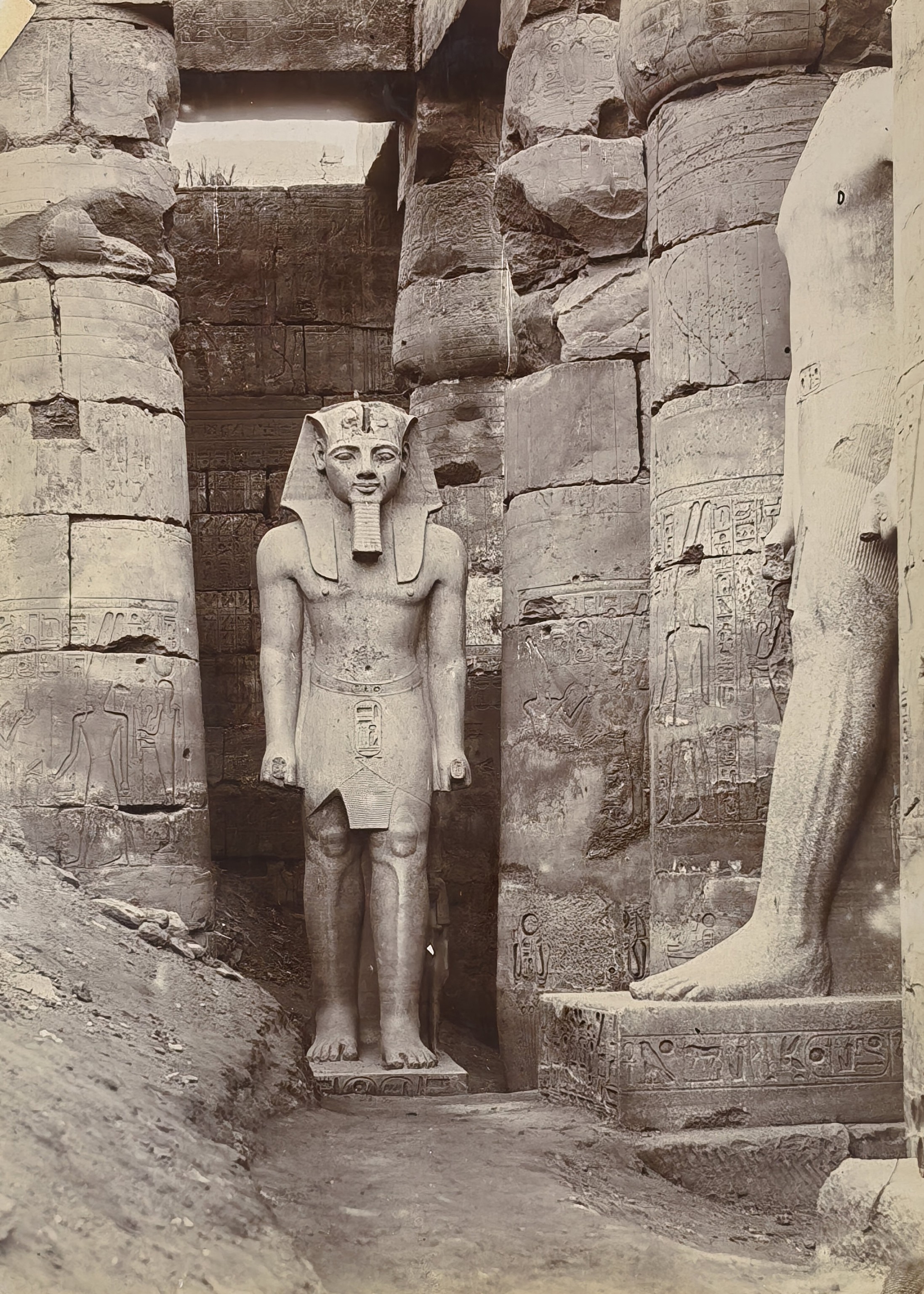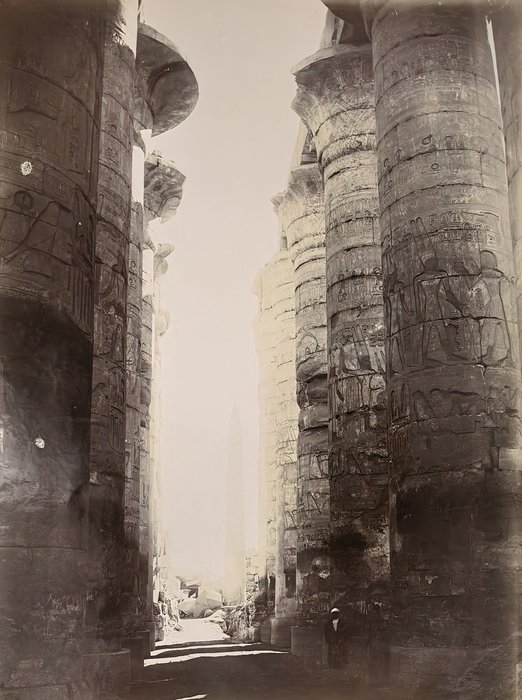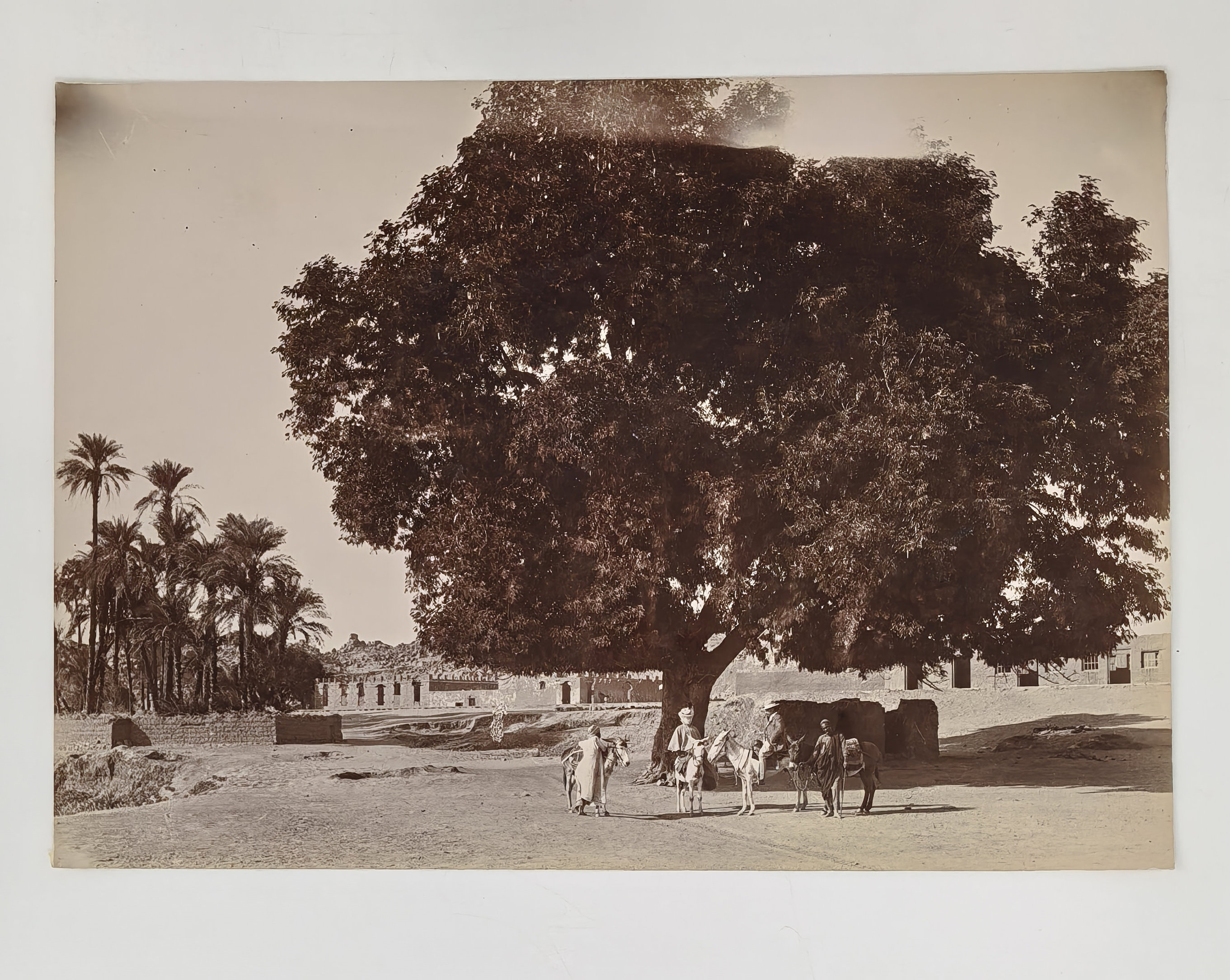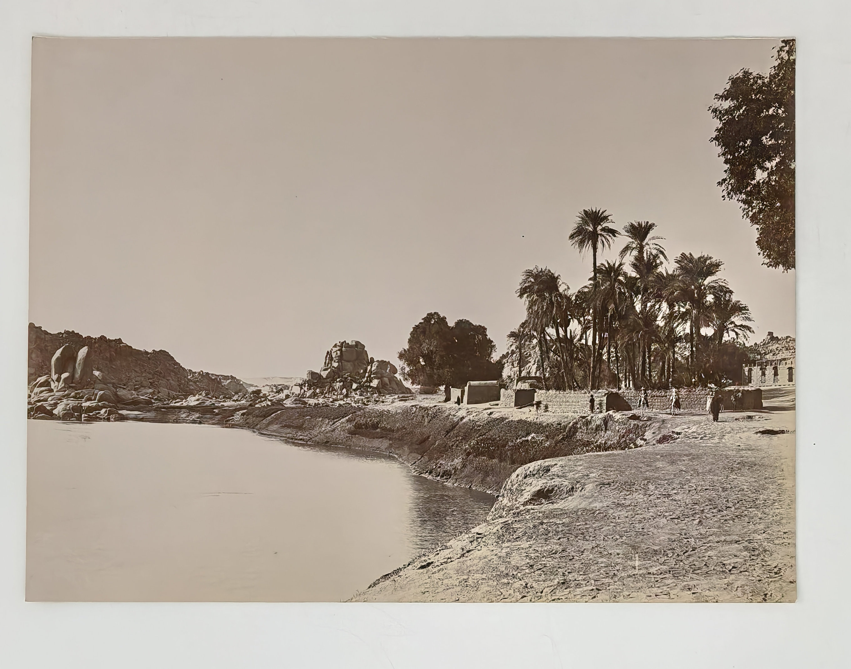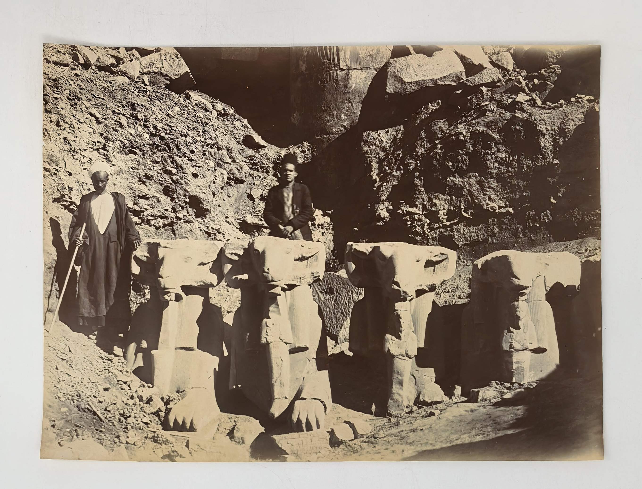 Interesting collection of original gelatin silver amateur photos of Egypt, taken by European travellers (likely, French) in the late 19th century. The collection includes a series of views of the Philae Temple and its environs, dating to before the island of Philae was flooded by the construction of the Aswan Low Dam in 1902. The photos show the island and the temple from the distance across the Nile River, as well as closer views of the Trajan’s Kiosk, the Second Pylon, the Mammisi building and the colonnade; two excellent photos of the Nile’s First Cataract (submerged after the construction of the Aswan Low Dam), and three views of the “Chellal” (Shellal) village south of Philae Island, where the trips to the temple departed from (tourist boats docked at the Nile bank, travellers on donkeys in the village). Other images show the Karnak Temple (Great Hypostyle Hall, Egyptian guides posing next to the partly-excavated ram sculptures of the Ram’s Road, interior of the Third or Fourth Pylon), statue of Ramses II in the partly-excavated courtyard of the Luxor Temple, the entrances to the tombs of the Theban Necropolis, flooded “Colosses de Memnon pendant l’inondation,” and two ancient Egyptian bas-reliefs: the first from the Ramses III’s mortuary temple in Medinet Habu shows the pharaoh hunting wild bulls, the second depicts a pharaoh bringing sacrifice to god Amun-Ra. There are also portraits of a Bichari boy from Aswan, “Zénobia at sa grand-mére (Thébes)” and two scenes with the travellers posing in an Egyptian garden (possibly, of the “Shepheard’s Hotel” in Cairo). Overall, an interesting collection of early amateur photographs depicting the Philae and other Egyptian temples before the major excavations and relocations that occurred in the 20th century.