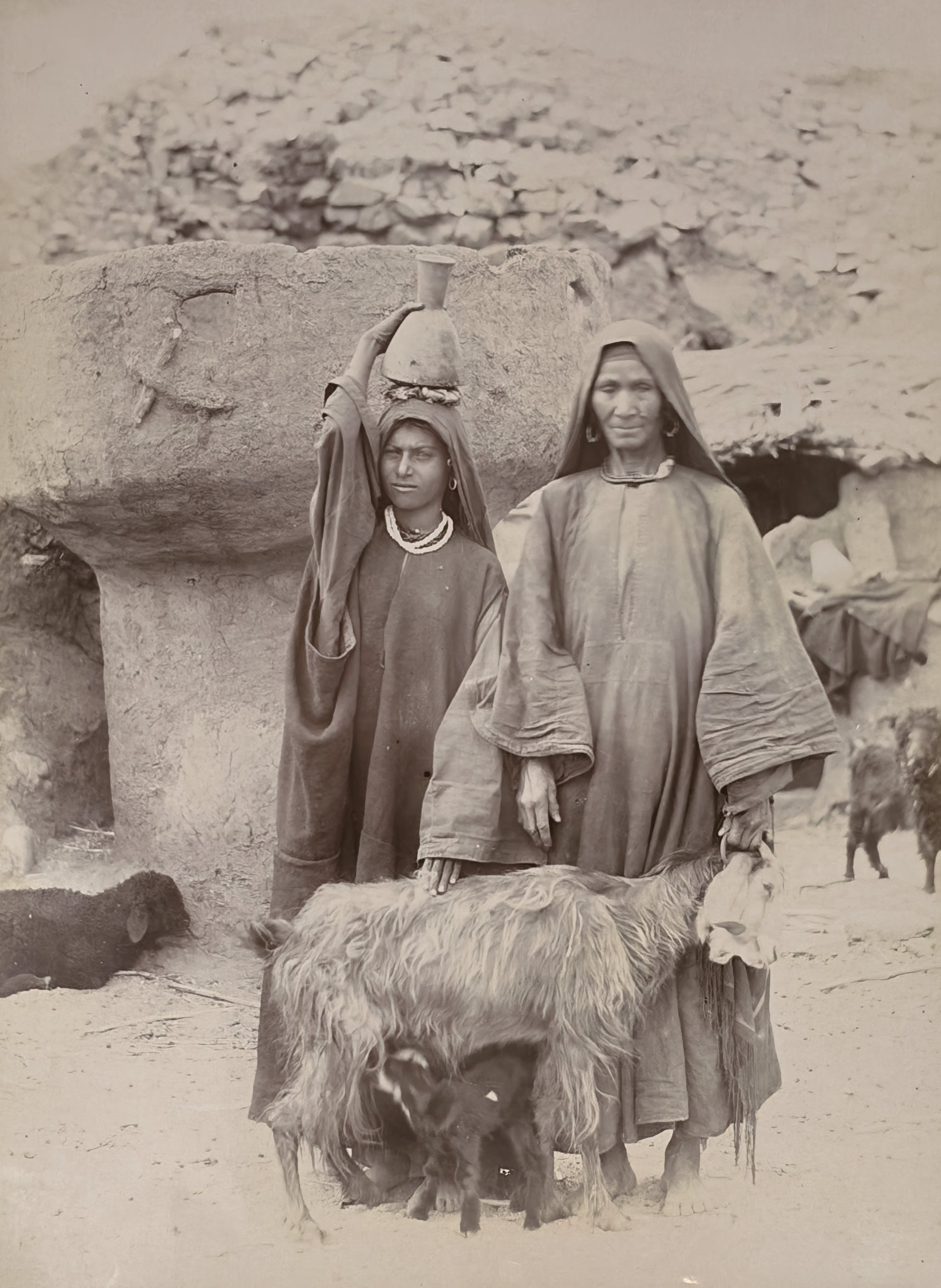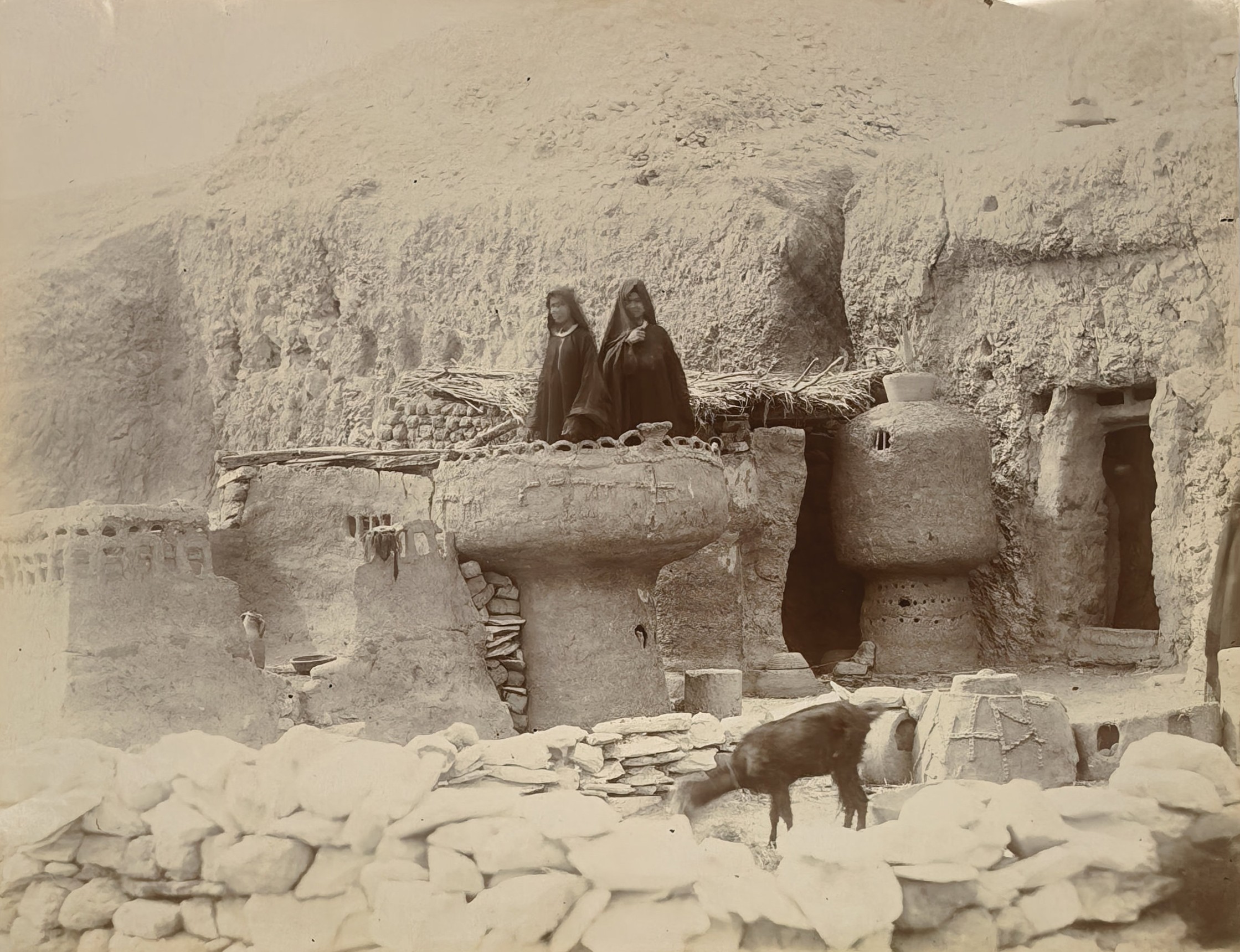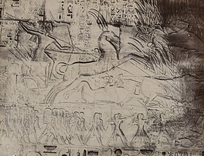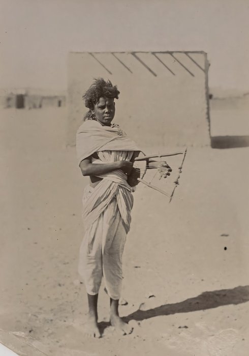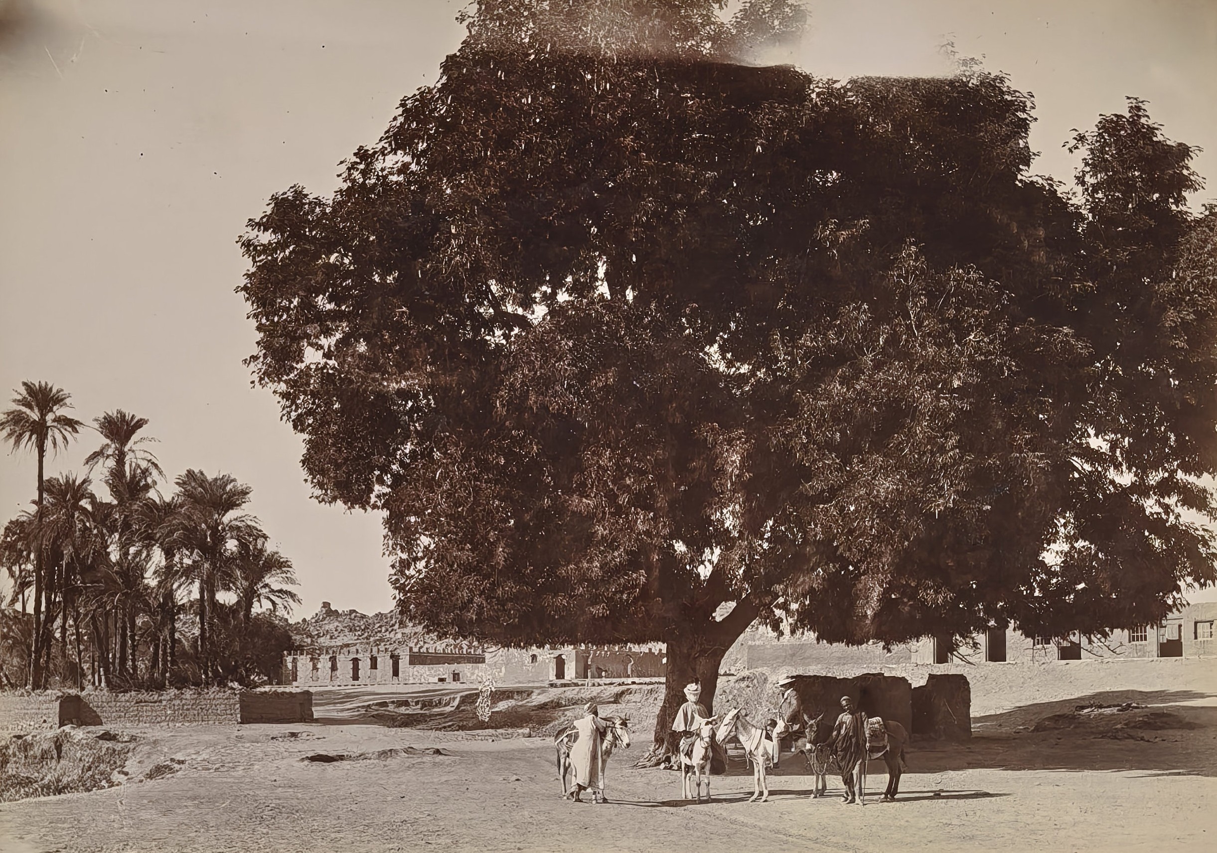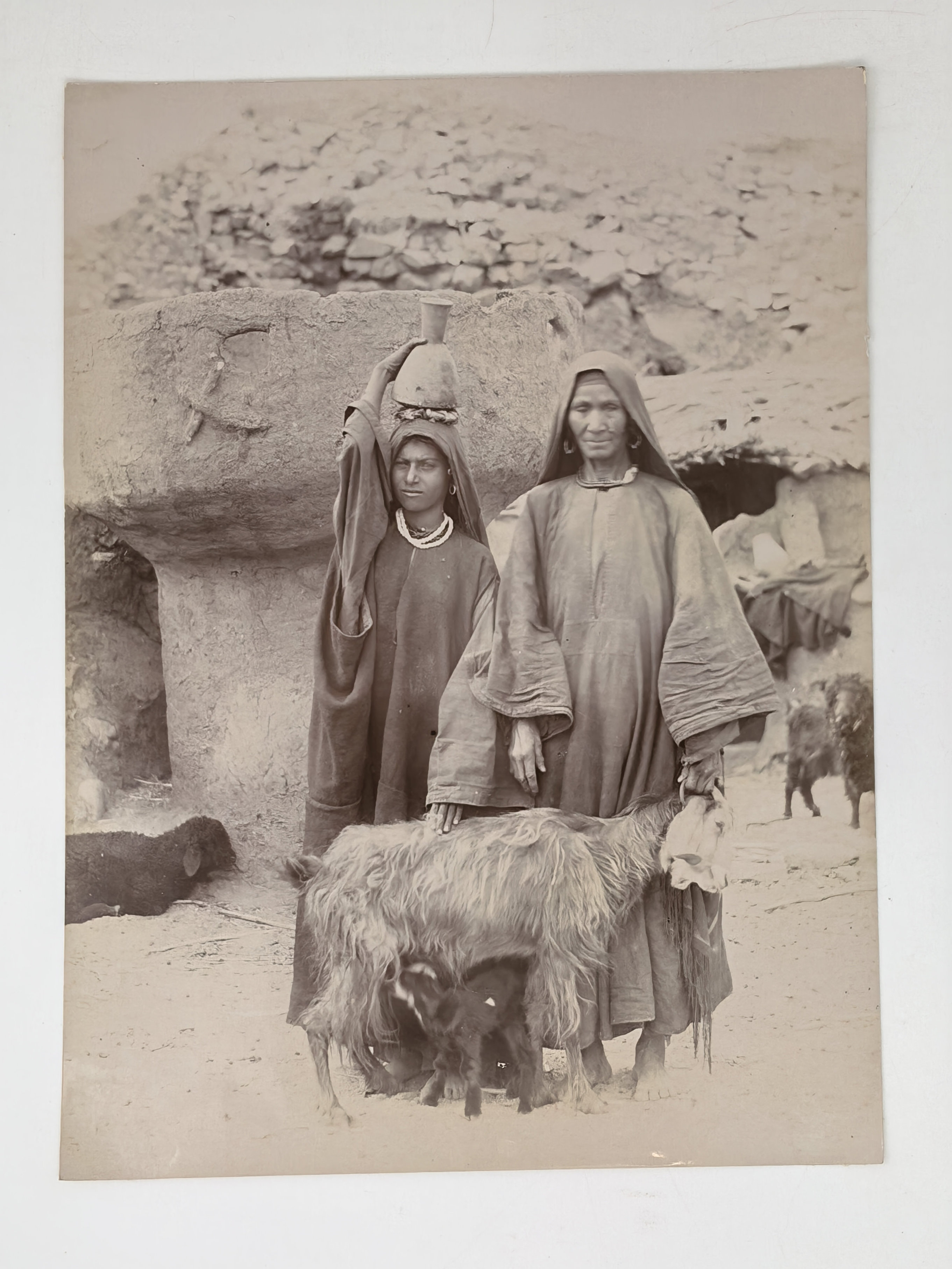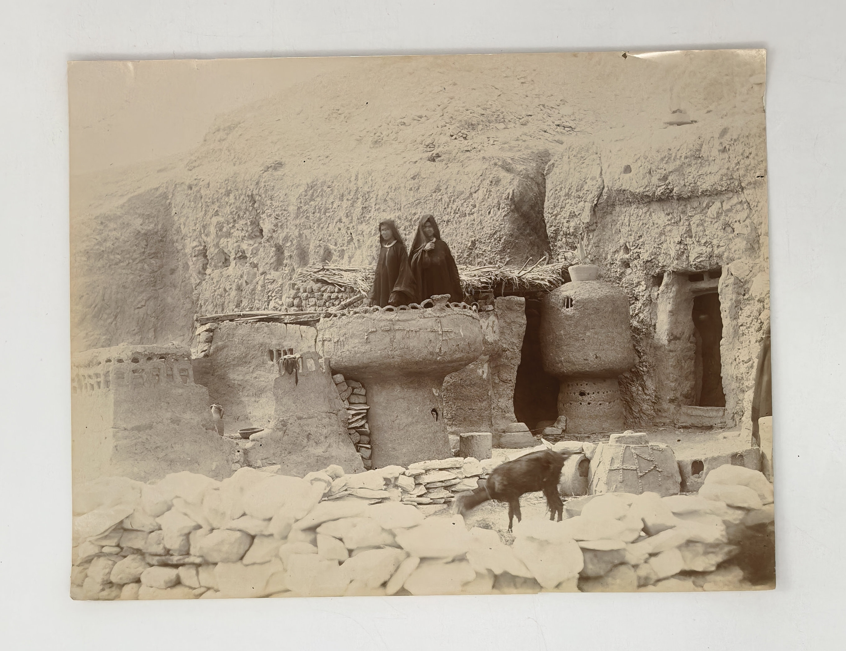 Interesting collection of original gelatin silver amateur photos of Egypt, taken by European travellers (likely, French) in the late 19th century. The collection includes a series of views of the Philae Temple and its environs, dating to before the island of Philae was flooded by the construction of the Aswan Low Dam in 1902. The photos show the island and the temple from the distance across the Nile River, as well as closer views of the Trajan’s Kiosk, the Second Pylon, the Mammisi building and the colonnade; two excellent photos of the Nile’s First Cataract (submerged after the construction of the Aswan Low Dam), and three views of the “Chellal” (Shellal) village south of Philae Island, where the trips to the temple departed from (tourist boats docked at the Nile bank, travellers on donkeys in the village). Other images show the Karnak Temple (Great Hypostyle Hall, Egyptian guides posing next to the partly-excavated ram sculptures of the Ram’s Road, interior of the Third or Fourth Pylon), statue of Ramses II in the partly-excavated courtyard of the Luxor Temple, the entrances to the tombs of the Theban Necropolis, flooded “Colosses de Memnon pendant l’inondation,” and two ancient Egyptian bas-reliefs: the first from the Ramses III’s mortuary temple in Medinet Habu shows the pharaoh hunting wild bulls, the second depicts a pharaoh bringing sacrifice to god Amun-Ra. There are also portraits of a Bichari boy from Aswan, “Zénobia at sa grand-mére (Thébes)” and two scenes with the travellers posing in an Egyptian garden (possibly, of the “Shepheard’s Hotel” in Cairo). Overall, an interesting collection of early amateur photographs depicting the Philae and other Egyptian temples before the major excavations and relocations that occurred in the 20th century.