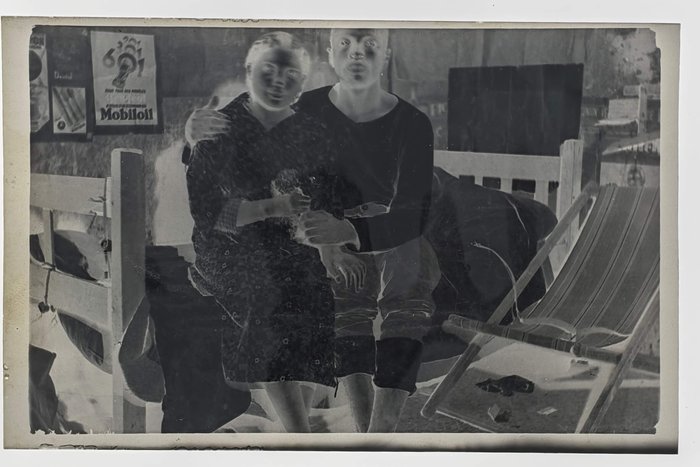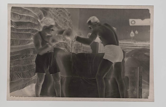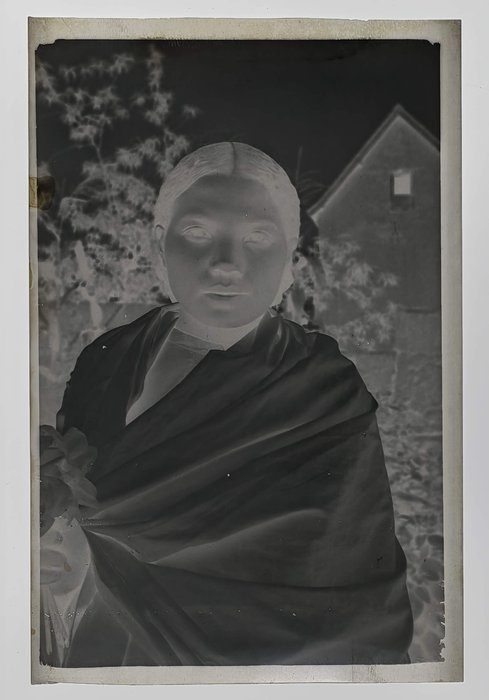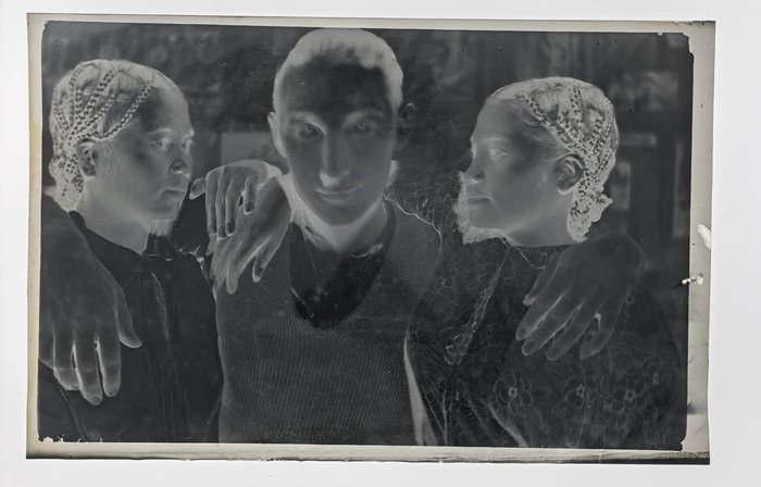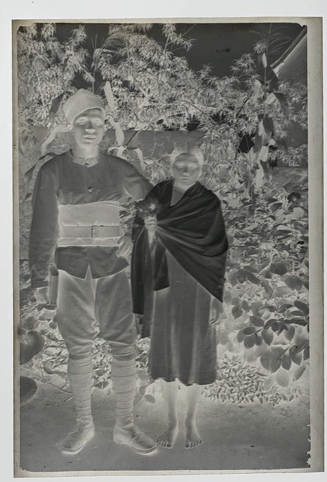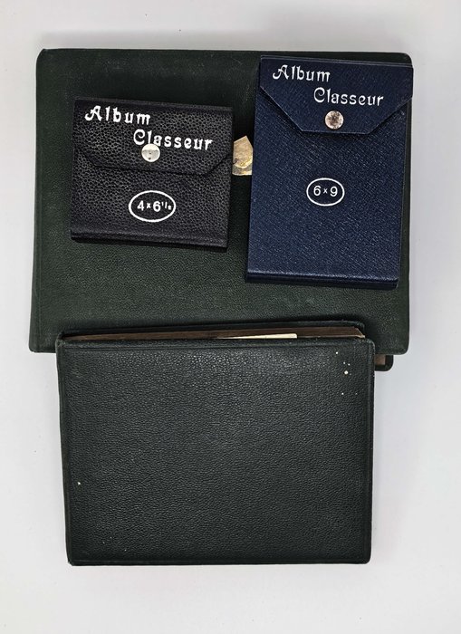 With two period folders ca. 8,5x12,5x3,5 cm (3 ¼ x 4 ¾ x 1 ½ in) and ca. 8x9x3 cm (3 x 3 ½ x 1 ¾ in) with 45 and ca. 95 film negatives ca. 6x9 cm (2 ¼ x 3 ¼ in) and ca. 4x6,5 cm (1 ¾ x 2 ¾ in) respectively. Several negatives faded or blurry, several tissue paper pockets housing negatives with minor tears or losses, but overall very good folders.