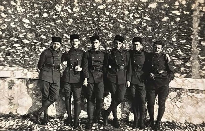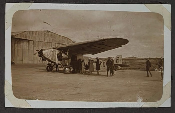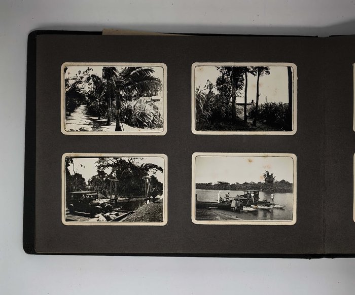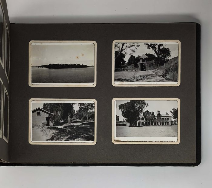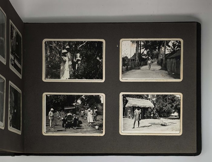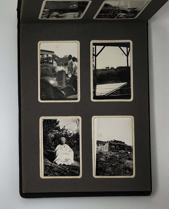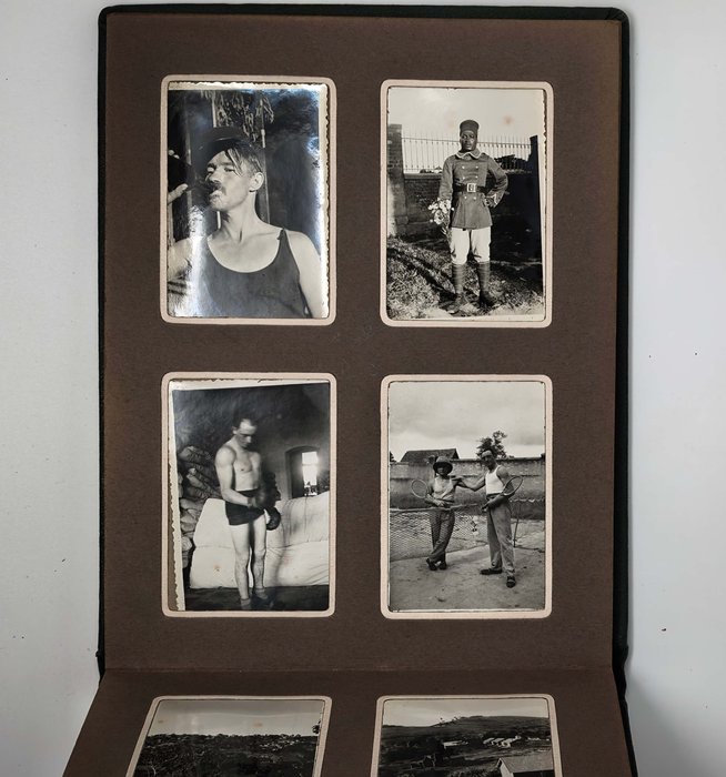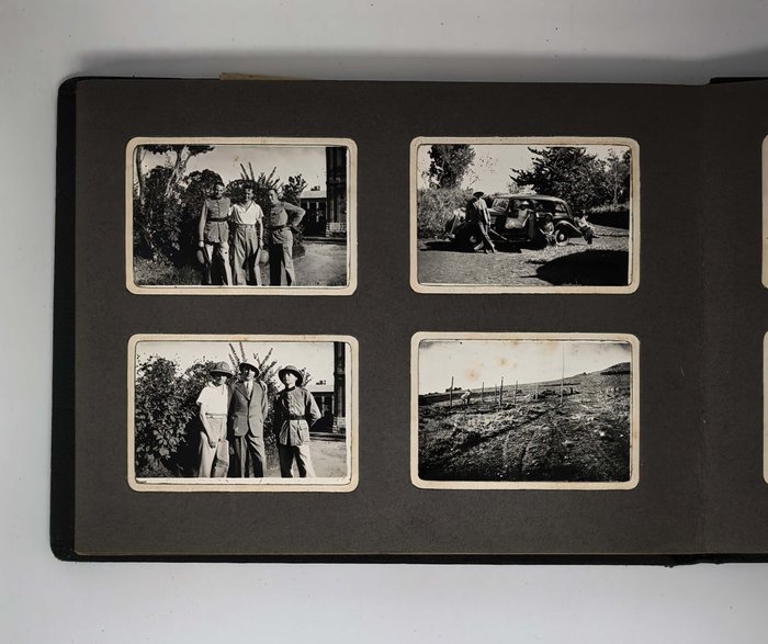 Oblong Octavo album (ca. 19x22,5 cm or 7 ¼ x 9 in). 12 card stock leaves. With 103 original mounted gelatin silver photos, mostly snapshots ca. 6,5x9 cm (2 ½ x 3 ½ in); three studio photos mounted on the inner side of the front cover are 7,5x9,5 cm (2 ¾ x 3 ¾ in). With two loosely inserted leaves of paper ca. 21x13,5 cm (8 ¼ x 5 ¼ in) with period manuscript ink captions in French to all snapshot photos; three studio photos with mounted period paper labels with manuscript ink captions. Period green full cloth album. Binding slightly rubbed on extremities, several images slightly faded, a couple of photos detached but present; overall a very good album.