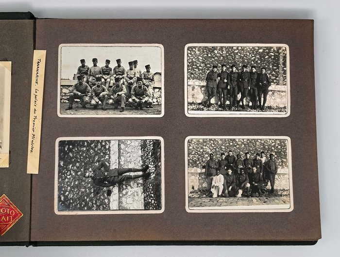 Historically significant collection of two albums with ca. 200 well-annotated gelatin silver amateur photographs, supplemented with ca. 140 original film negatives, taken by one “Pierre Le Roux,” a young French military man, who served in Madagascar in ca. 1934-1935 (apparently, in the Third Battalion of the “1er Régiment Mixte de Madagascar,” stationed in the Soanierana neighbourhood of Antananarivo). The photos are supplemented with several paper leaves with manuscript captions, identifying the time and location of images and often containing interesting historical details.
