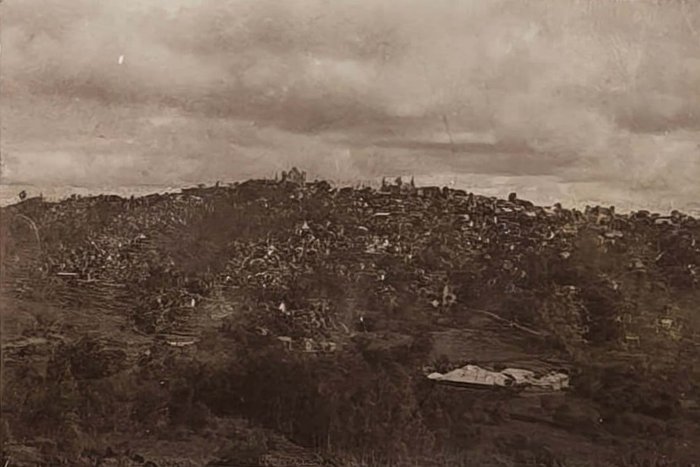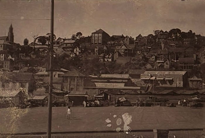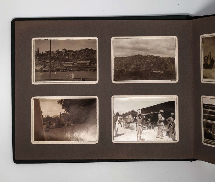 Over seventy photos show Madagascar’s capital Tananarive (Antananarivo) and environs: general views of the city’s neighbourhoods and hills, French military compound where the compiler served (barracks and the surrounding areas taken from above, scenes with the compiler and other French service men boxing, playing tennis, “le pavillon d’Honneur du 3eme Battalion…,” &c.), the Queen’s Palace, Gallieni Square, outdoor markets and street scenes, Lake Anosy, Lake Tsymbazaho, Anozirato suspension bridge, nearby rice fields, Ikopa River, &c. Four images show airplanes on “Aerodrome d’Ivato” (modern-day Ivato International Airport, the gateway to Antananarivo), which (according to the manuscript captions) carried out one of the first mail deliveries between France and Madagascar. Very interesting are four scenes from a Famadihana or “the turning of the bones” ceremony photographed near Antananarivo. There are also several views of the town of Ambatolampy and environs (city market, French military camp and exercises), and the Royal Rova (castle) in Ambohimanga.