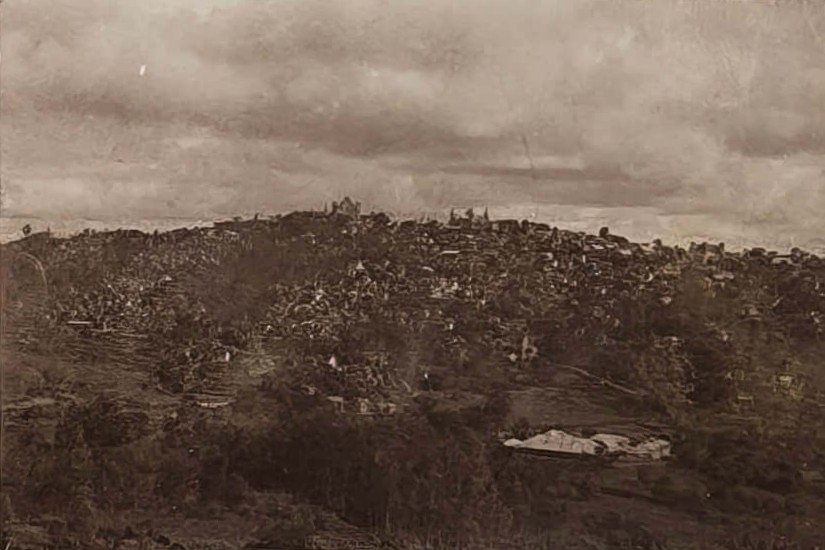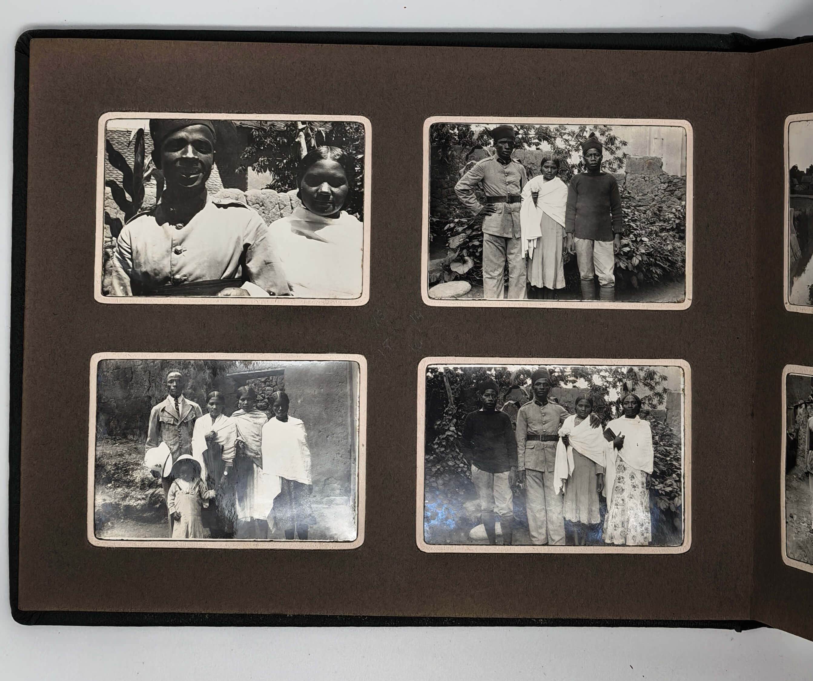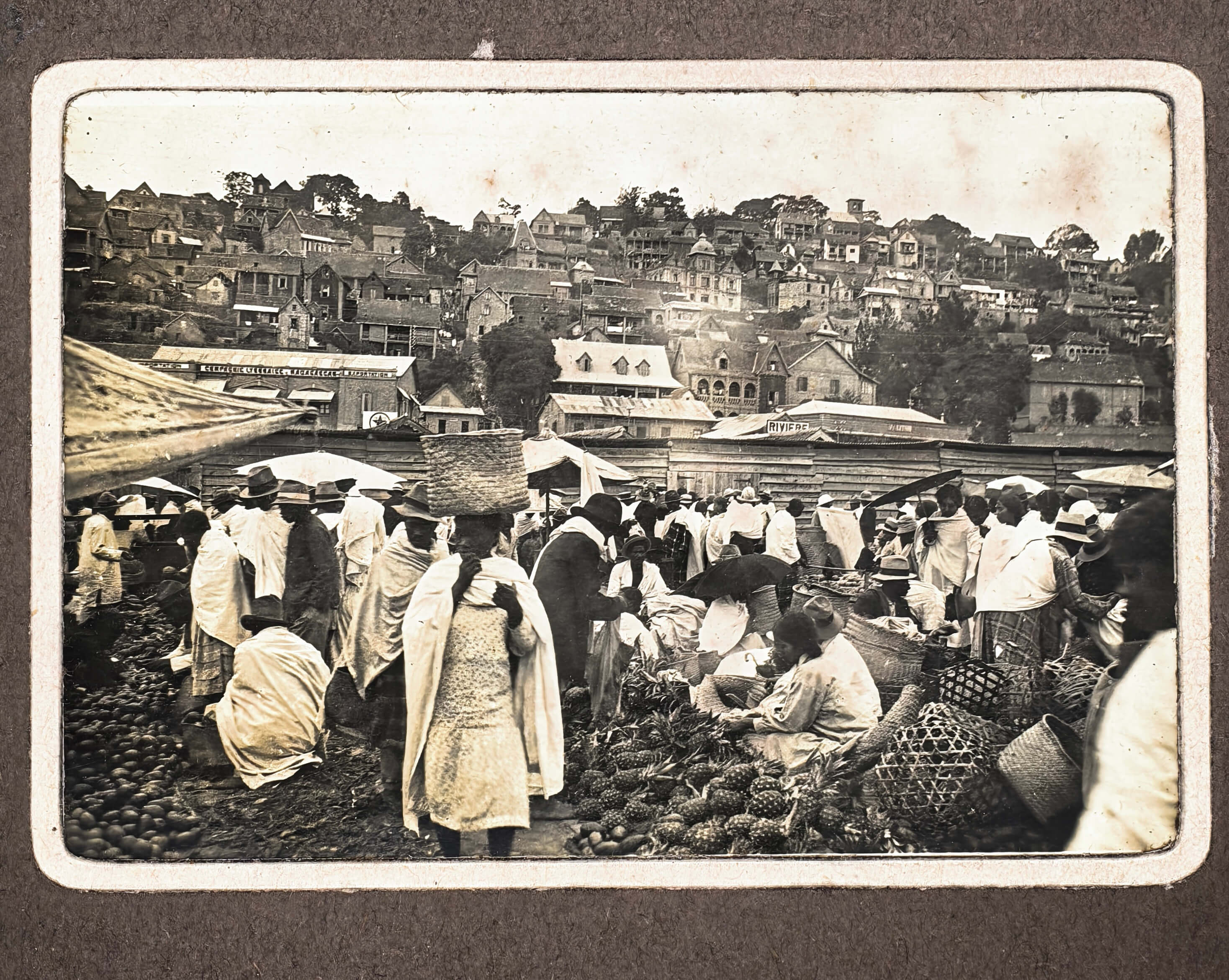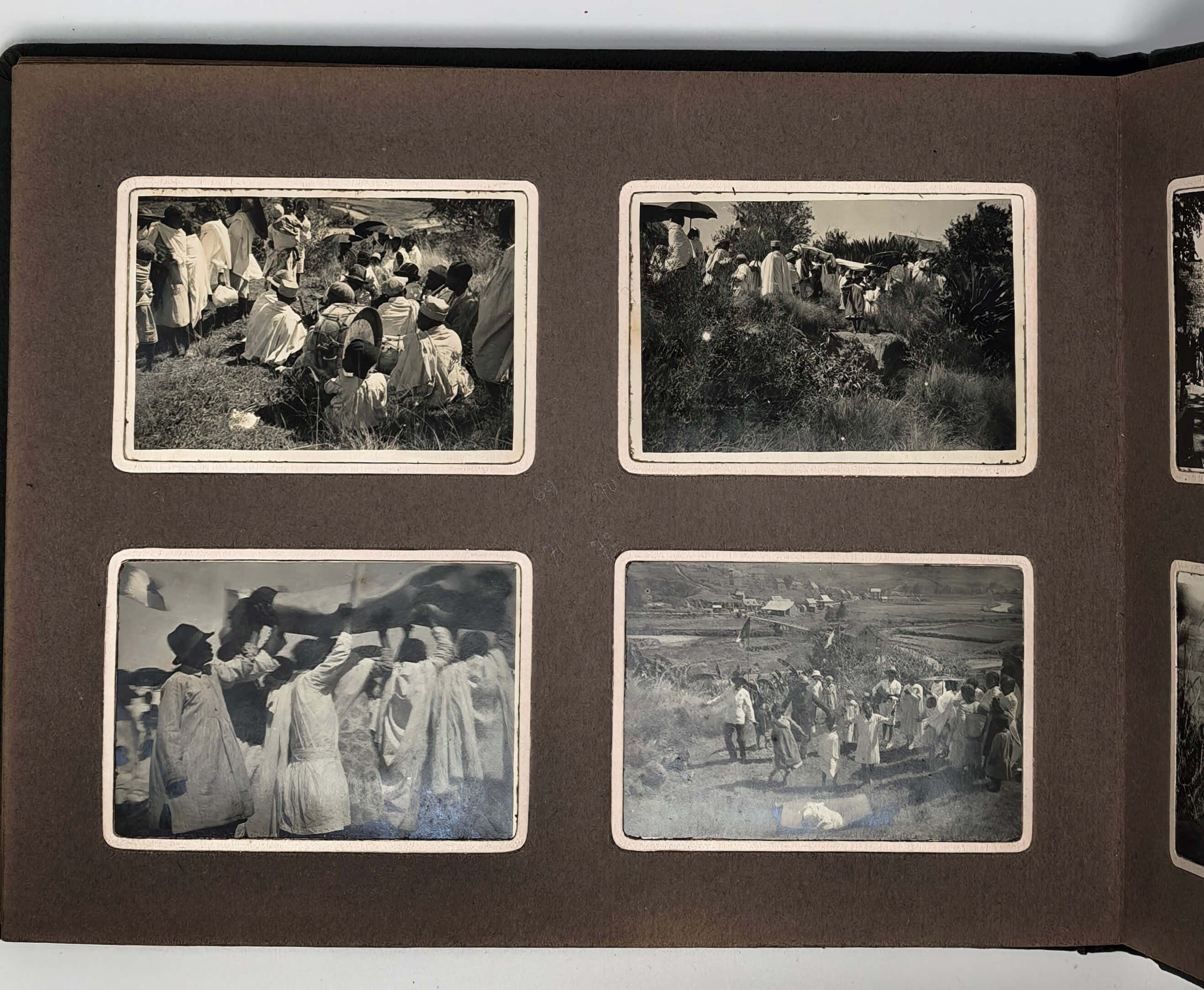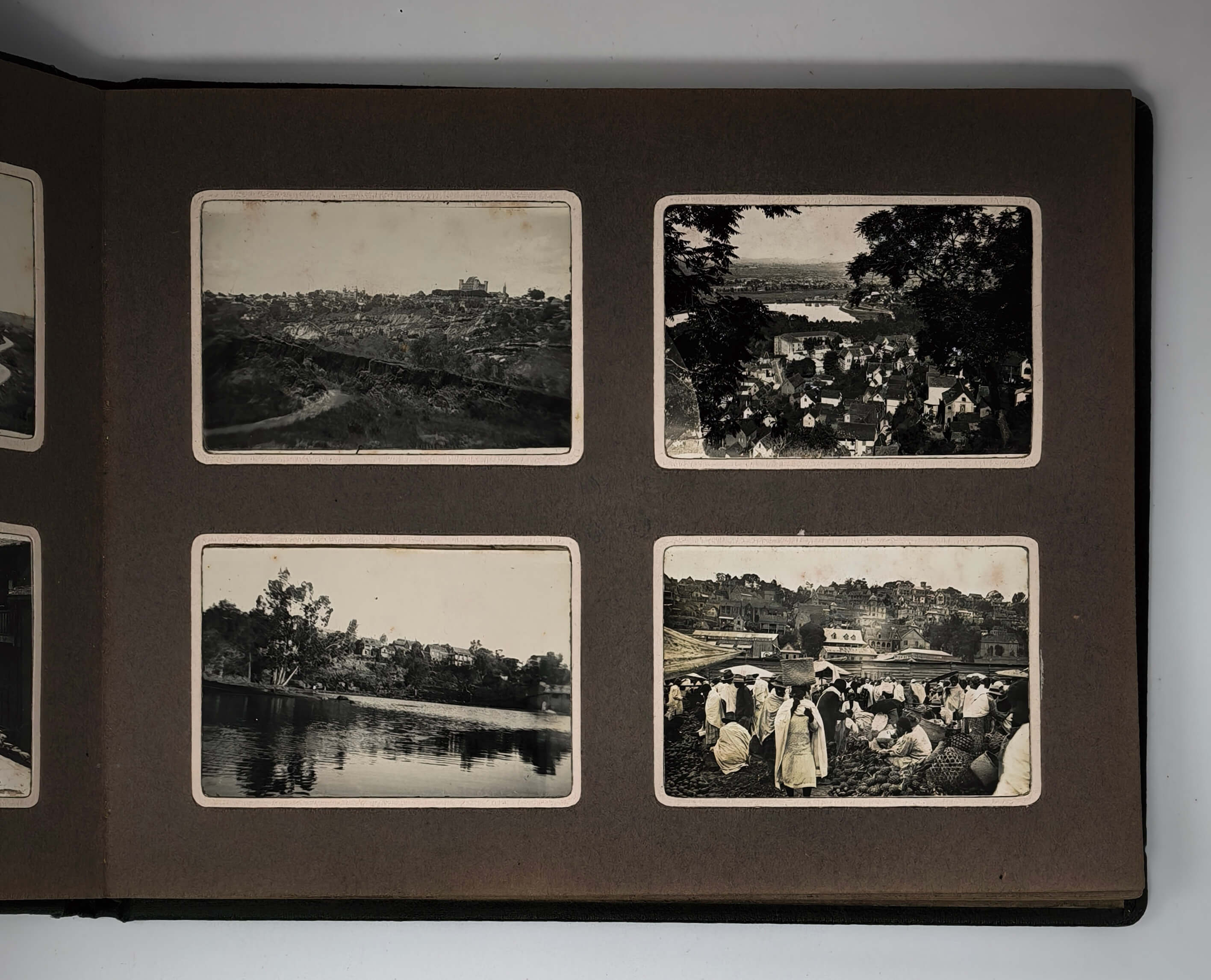 Over seventy photos show Madagascar’s capital Tananarive (Antananarivo) and environs: general views of the city’s neighbourhoods and hills, French military compound where the compiler served (barracks and the surrounding areas taken from above, scenes with the compiler and other French service men boxing, playing tennis, “le pavillon d’Honneur du 3eme Battalion…,” &c.), the Queen’s Palace, Gallieni Square, outdoor markets and street scenes, Lake Anosy, Lake Tsymbazaho, Anozirato suspension bridge, nearby rice fields, Ikopa River, &c. Four images show airplanes on “Aerodrome d’Ivato” (modern-day Ivato International Airport, the gateway to Antananarivo), which (according to the manuscript captions) carried out one of the first mail deliveries between France and Madagascar. Very interesting are four scenes from a Famadihana or “the turning of the bones” ceremony photographed near Antananarivo. There are also several views of the town of Ambatolampy and environs (city market, French military camp and exercises), and the Royal Rova (castle) in Ambohimanga.