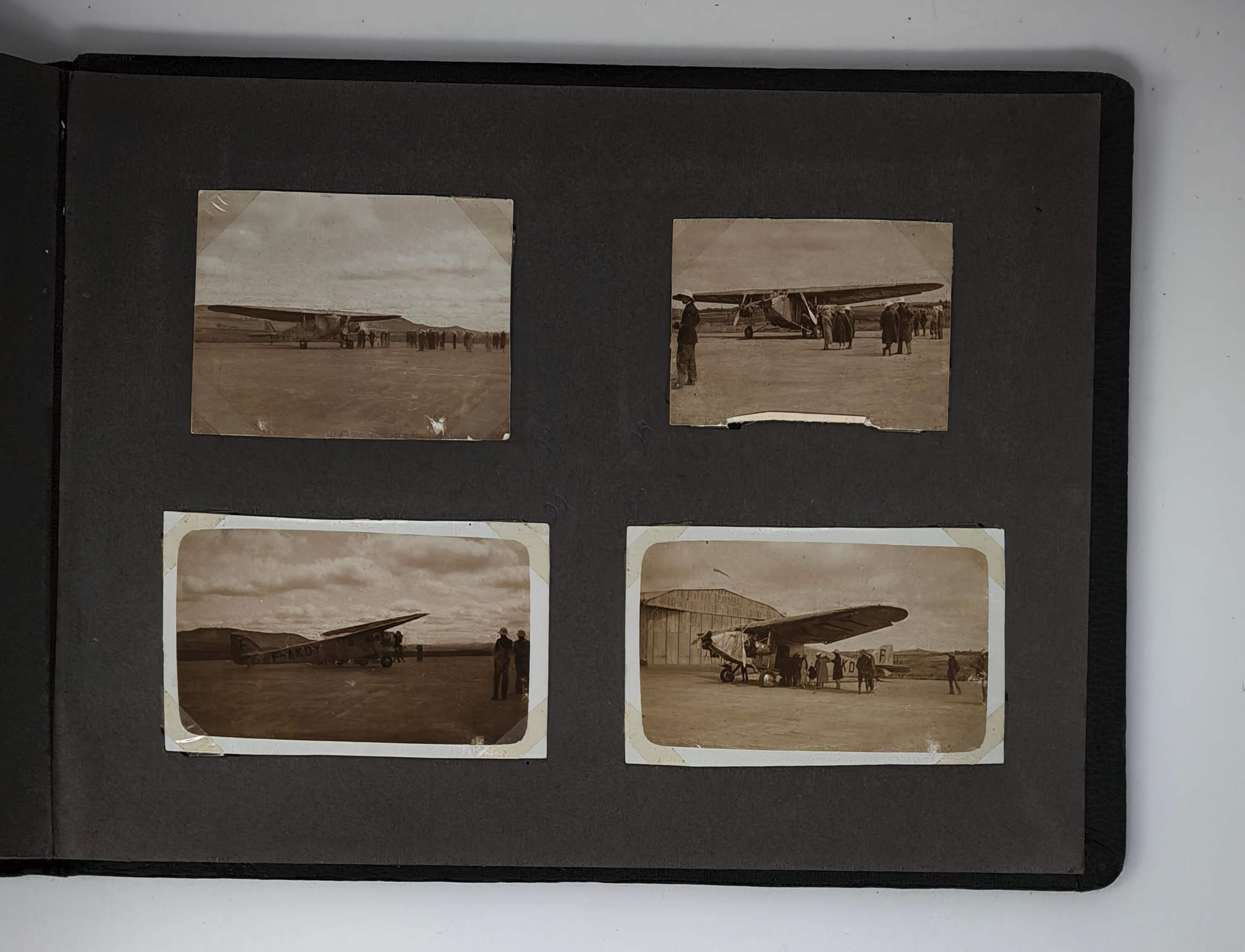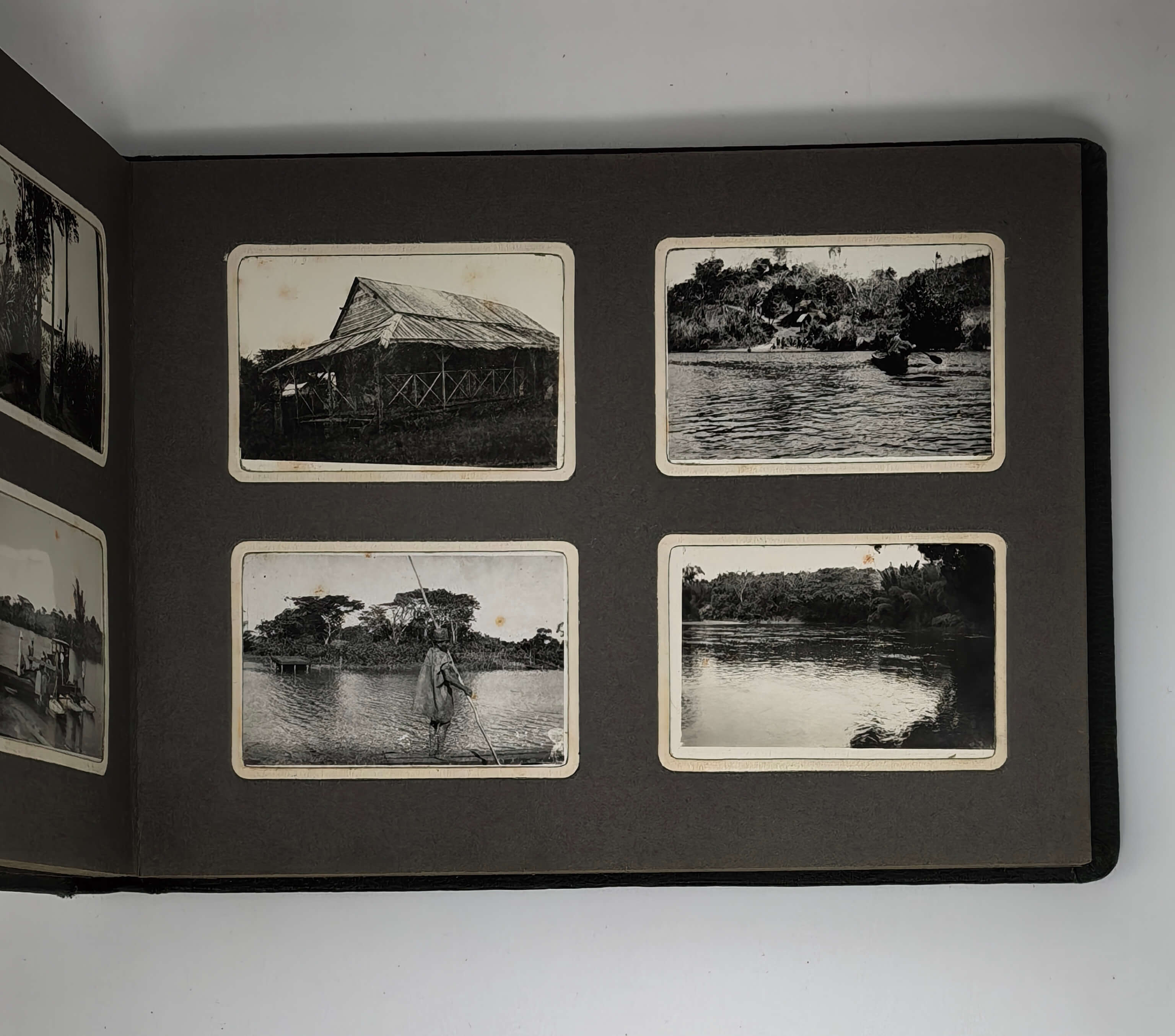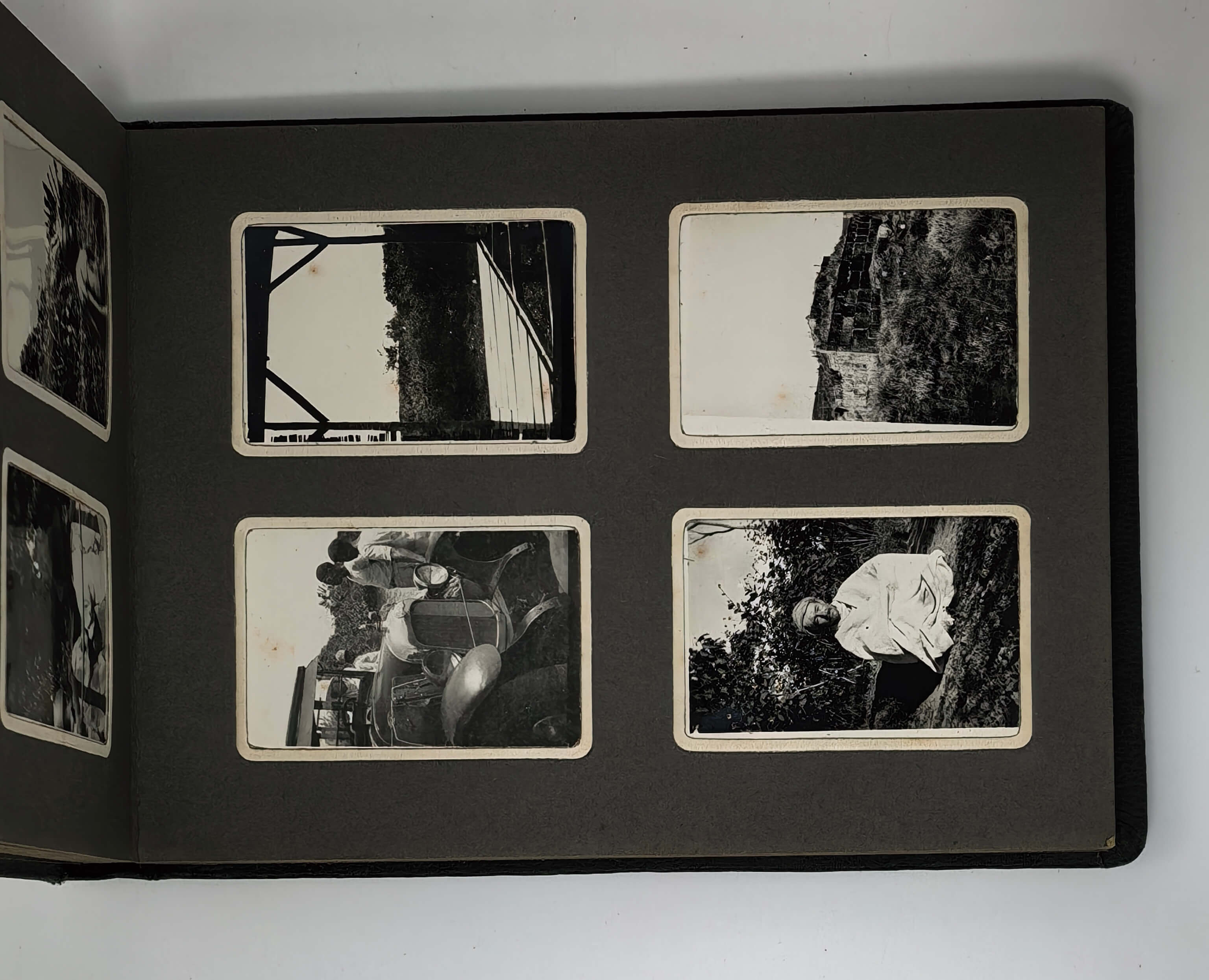 Oblong Octavo album (ca. 19x22,5 cm or 7 ¼ x 9 in). 12 card stock leaves. With 103 original mounted gelatin silver photos, mostly snapshots ca. 6,5x9 cm (2 ½ x 3 ½ in); three studio photos mounted on the inner side of the front cover are 7,5x9,5 cm (2 ¾ x 3 ¾ in). With two loosely inserted leaves of paper ca. 21x13,5 cm (8 ¼ x 5 ¼ in) with period manuscript ink captions in French to all snapshot photos; three studio photos with mounted period paper labels with manuscript ink captions. Period green full cloth album. Binding slightly rubbed on extremities, several images slightly faded, a couple of photos detached but present; overall a very good album.