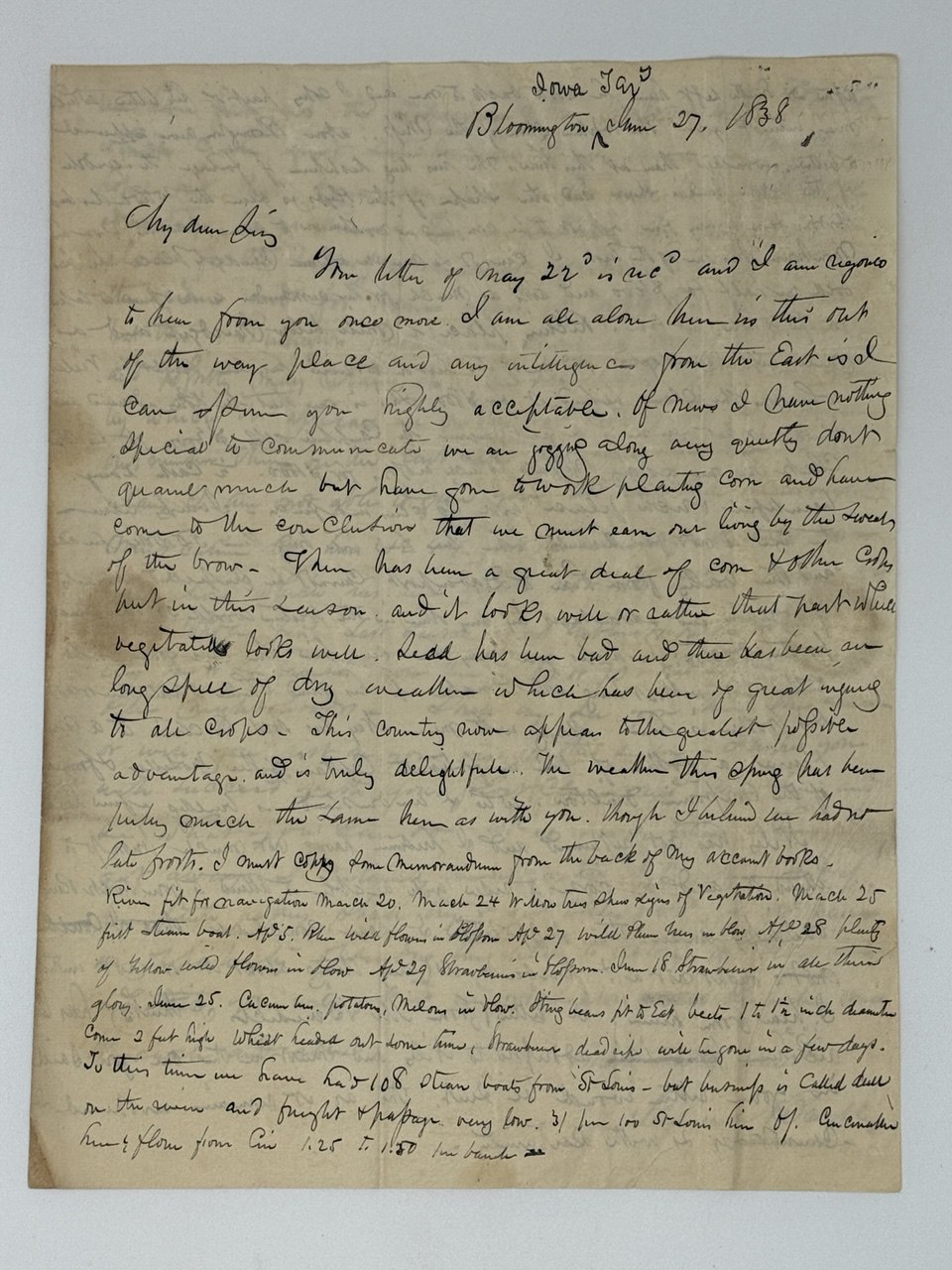Writing to his friend and possibly a brother-in-law, “Mr. Joseph Roby, Brockport, Orleans County, New York,” Breese talks about Bloomington’s climate and advantageous location on the Mississippi River bend, prices for real estate and recent sales of land plots, results of the latest census, recent intelligence “of the division of the Tarritory” (the Territory of Wisconsin, 1836-1848), mentiones his business partner “Niles” (Higginbotham) and contemplates about which town will become the seat of territorial government. Overall a historically significant original letter adding to the history of the early years of the city of Muscatine and the Territory of Iowa.