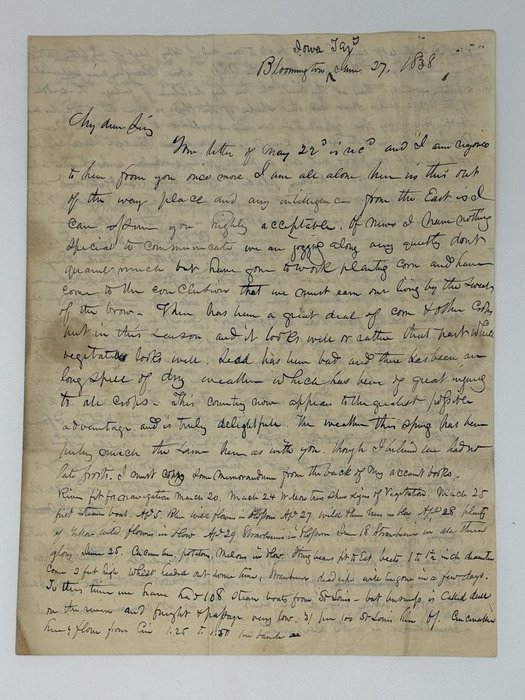 An interesting early original autograph letter, written days before the incorporation of the Territory of Iowa (July 4, 1838 – December 28, 1846) in the newly founded town of Bloomington on the west bank of the Mississippi River. The town was incorporated as Bloomington in 1839 and renamed Muscatine in the 1840s to avoid mail delivery confusion. The author was “Samuel Breese, one of the original proprietors of Muscatine. Every lawyer, law student and real estate agent doing business in our County Recorder’s Office has labored under the impression for no inconsiderable period of his life that what Breese & Higginbotham didn’t own of this town wasn’t worth mentioning, the partner <…> being the late Mr. Niles Higginbotham. Besides appropriating so much of the territory around here, the firm kept a grocery down under the bluff below the freight house, back in 1835 or 36” (Local Department// Muscatine Daily Journal. 16 June 1883, p. 2).
