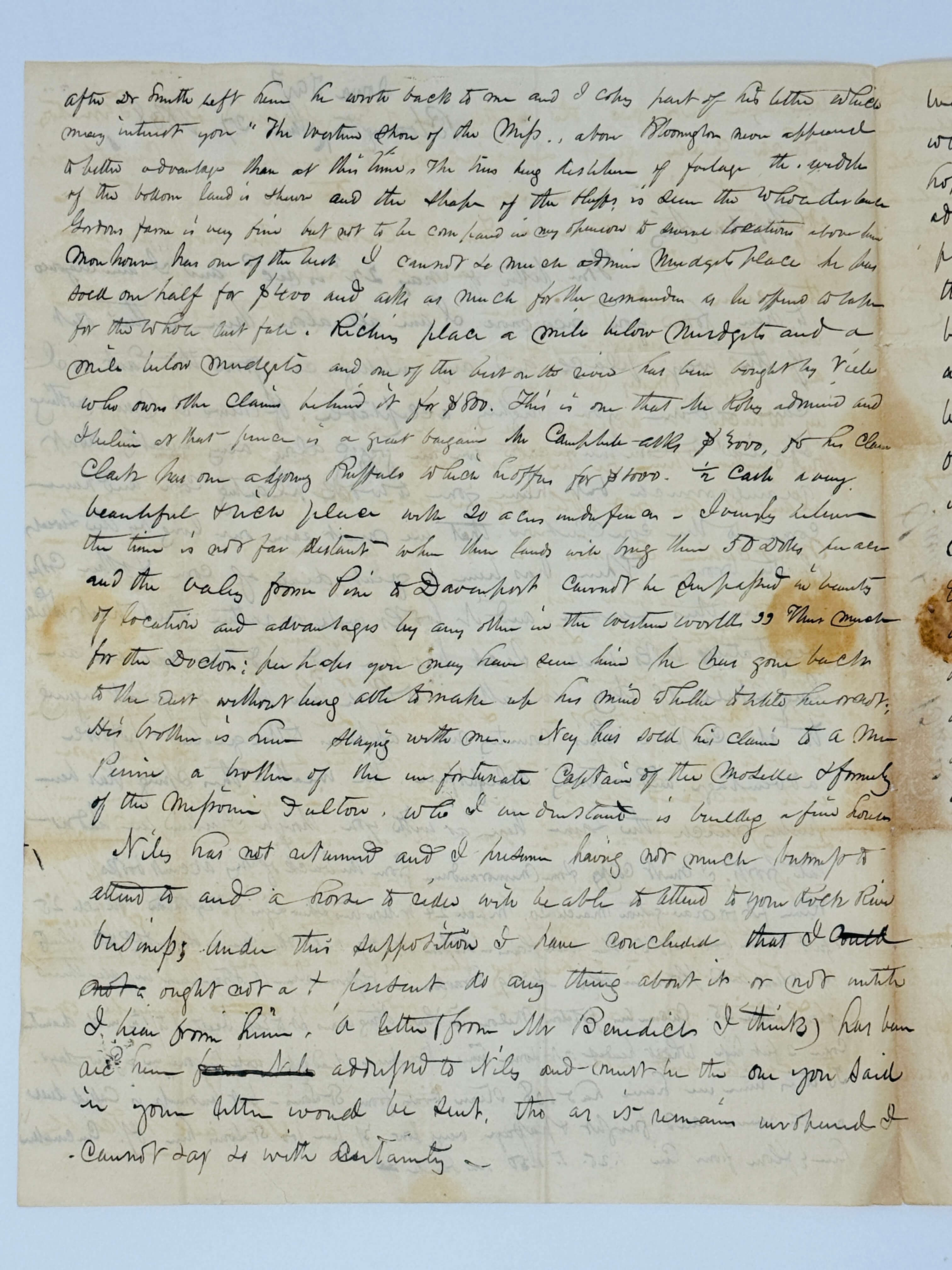 After Dr. Smith left here he wrote back to me and I copy part of his letter which may interest you: ‘The western shore of the Miss. above Bloomington now appeared a better advantage <…> the width of the bottom land is there and the shape of the bluffs is seen the whole distance. Gordon’s farm is very fine but not to be compared in my opinion to several locations above here. [Monhonn?] has one of the best. I cannot so much admire [Nurdget’s] place, he has sold one half for $400 and like as much for the remainder as he offered to take for the whole last fall. [Richie’s?] place a mile below [Nurget’s?] and a mile below […?] and one of the best on the river has been bought by [Viele?] who owns other claims behind it for $800. This is one that Mr. Roby admired and I believe at that price is a great bargain. Mr. Campbell asks $3000 for his claim. Clark has one adjoining Buffalo which he offers for $1000. <…> Beautiful & rich place which 20 acres <…> I <…> believe the time is not far distant when these lands will bring them 50 dollars per acre and the valley from Pine to Davenport cannot be compared in beauty of location and advantage by any other in the country’ <…>.