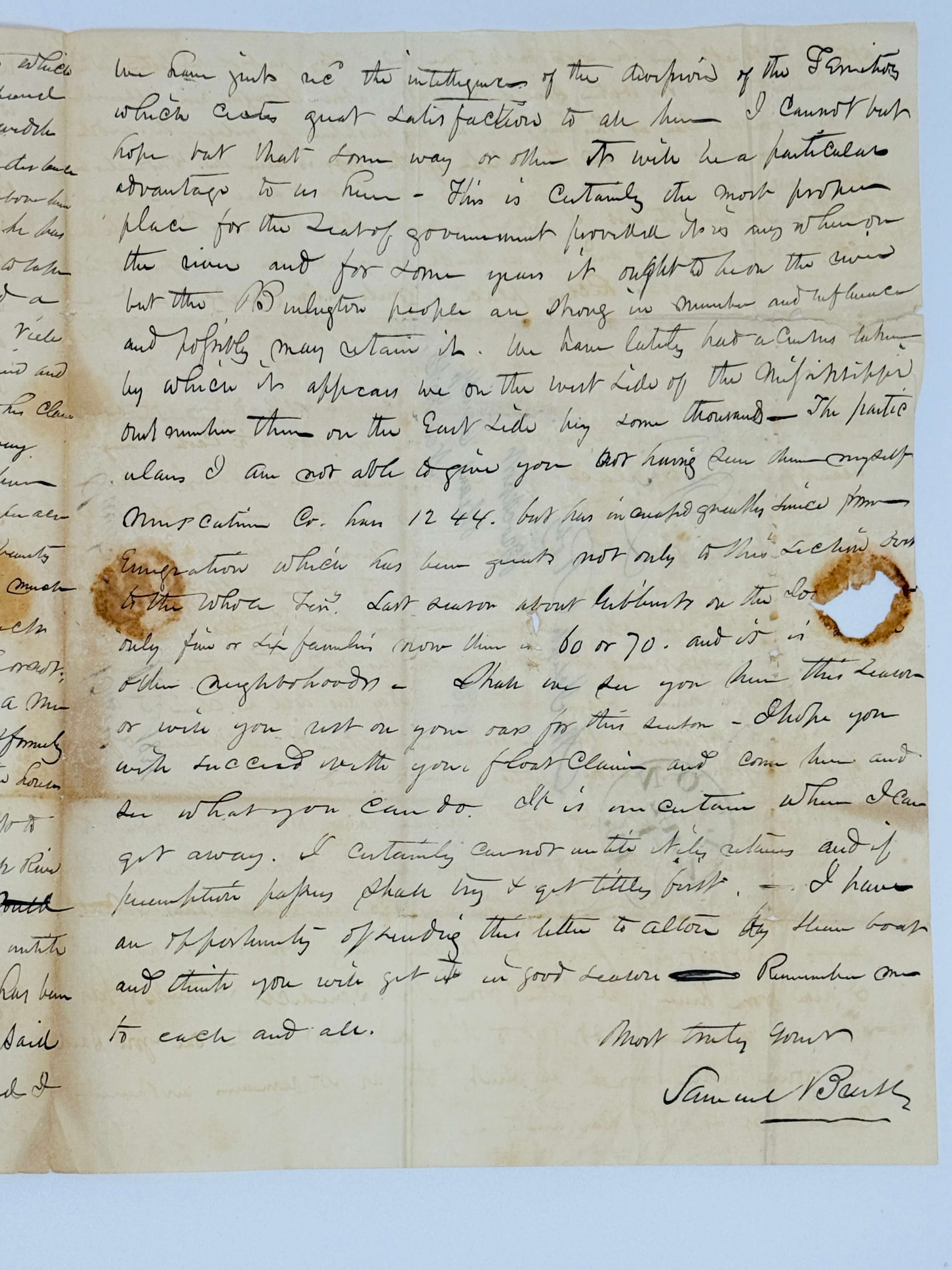 We have just received the intelligence of the division of the Tarritory which [acts?] great satisfaction to all here. I cannot but hope but that some way or the other it will be a particular advantage to us here. This is certainly the most proper place for the seat of government provided it is anywhere on the river and for some years it ought to be on the river but the Burlington people are strong in number and influence and possibly can retain it. We have lately had a census […?] by which it appears we on the west side of the Mississippi outnumbered those on the east side by some thousand. The particulars I am not able to give you not having see them myself. Muscatin Co. has 1244 but has increased greatly since from Emigration which has been great not only to this section but to the whole Tary. Last season about […?] only five or six families now there are 60 or 70 and it is […] other neighborhoods. <…>”