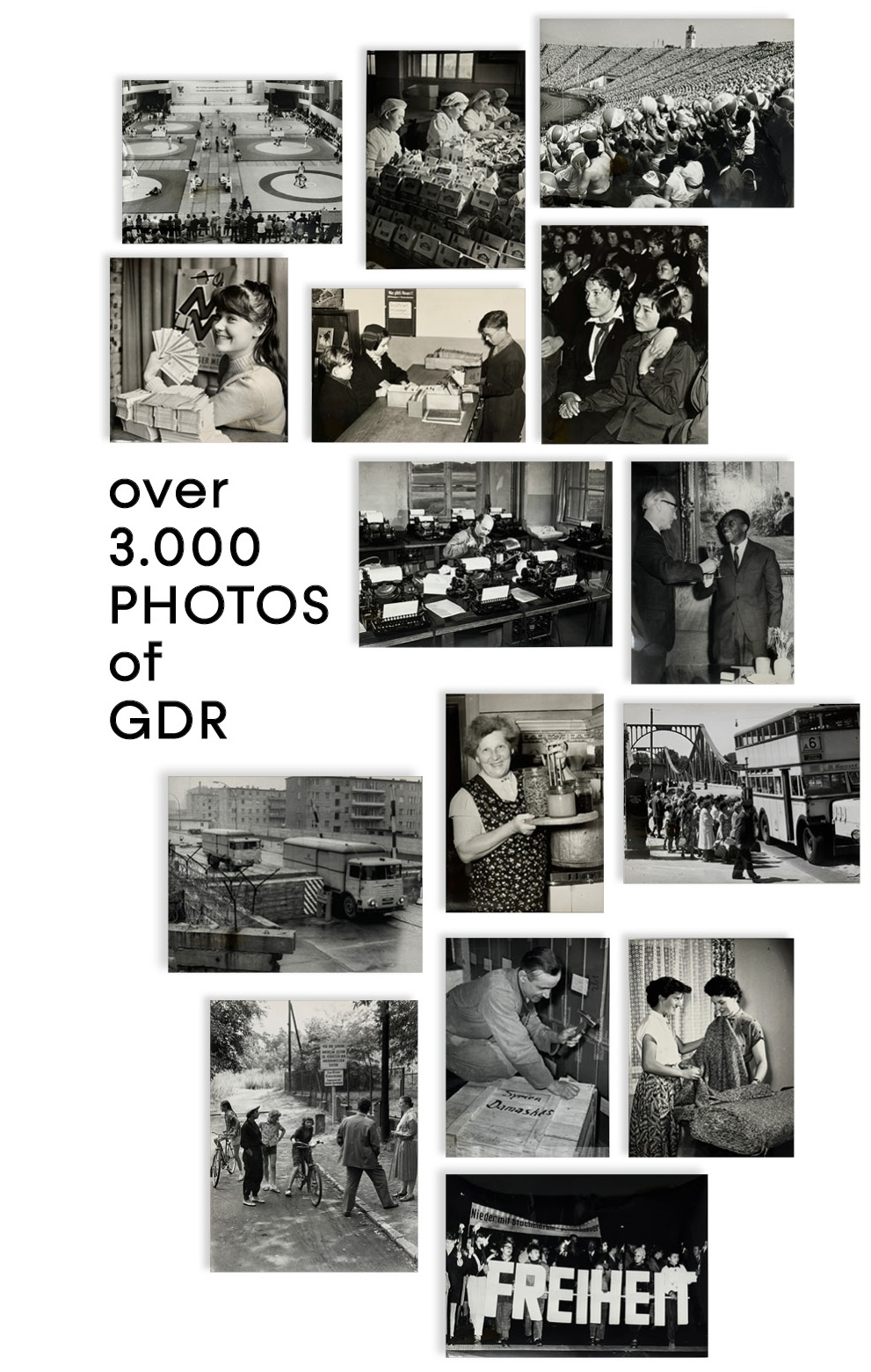 Finally, there is an extraordinary collection of ca. 2000 original press photos, comprising a comprehensive visual source on the history of the GDR and East Berlin – from the proclamation of the GDR on October 7, 1949 to the East German general election on March 18, 1990. The photos follow through the period of ideological enthusiasm and industrial boom of the 1950s, the decades of social stability and slow stagnation in the 1960s and 1970s, the beginning of religious and human rights movements in the 1980s and finish with strong images of wide-scale demonstrations for democratization and liberal reforms in East Germany. Series of photos follow the history of the Berlin Wall, the border between East and West Germany, and the political events of 1987-1990, leading to the Reunification of Germany. There are also captivating photos of everyday life, bringing forward the life and experience of ordinary East Germans.