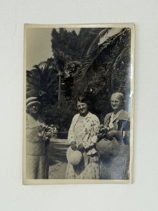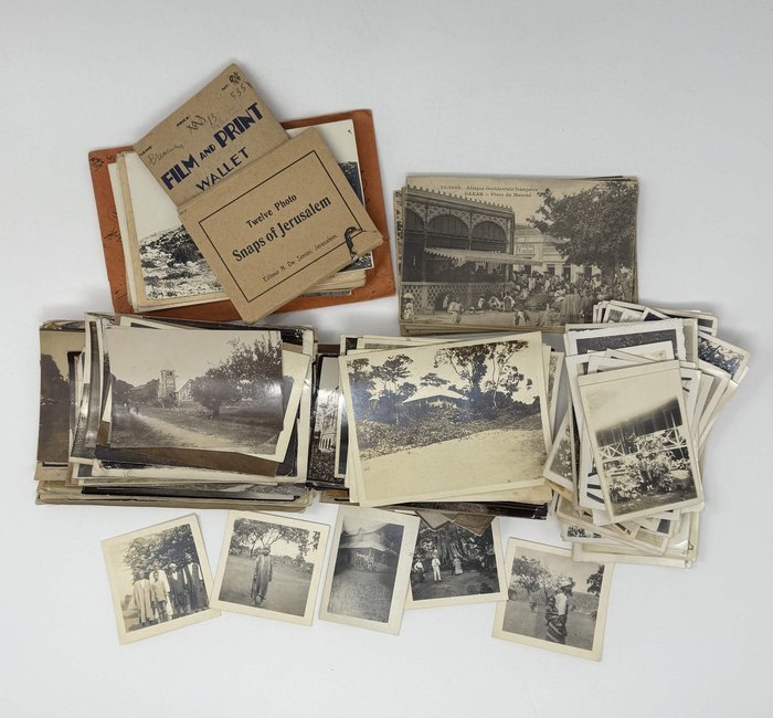 Holy Land: five real photo and 31 printed postcards (including 2 duplicates; 5 postcards are colour printed); all ca. 9x13,5 cm (3 ½ x 5 ¼ in). Two postcards with period ink notes on verso; one with an ink stamp “Evg. Karmel-Missionsheim, Haifa-Palästina” on verso. Several postcards with minor stains or slightly faded, one with a minor crease on the corner, but overall very good. WITH: 40 loose original gelatin silver photos from ca. 8,5x14,5 cm (3 ¼ x 5 ¾ in) to ca. 6x8,5 cm (2 ¼ x 3 ¼ in). Eleven photos with period ink or pencil captions on verso (five are also dated 1929, 1934 or 1935 on verso). Smaller and larger amateur photos are housed in two period paper folders with printed signs “Film and Print Wallet, Hanania Bros., Photo-Dealers, Jerusalem & Haifa” and “Zeiss Ikon, Hanania Brothers <…>;” nine studio photos are housed in the original paper folder with a printed sign “Twelve photo snaps of Jerusalem, Editeur N. de Simini, Jerusalem.”