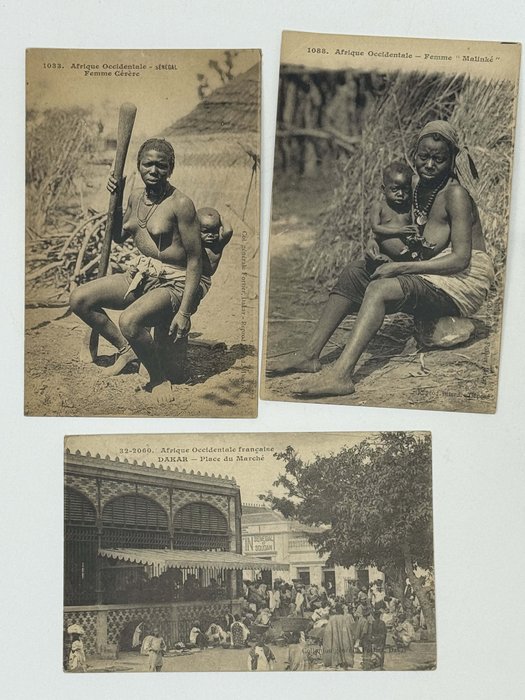 French Senegal postcards: 15 printed postcards (including six colour-printed); all ca. 8,5x13,5 cm (3 ¼ x 5 ¼ in); one postcard with a period ink note dated 1918 and signed by Alice D. Musselman; address and postal stamps on verso. Three postcards with minor scratches, but overall very good.