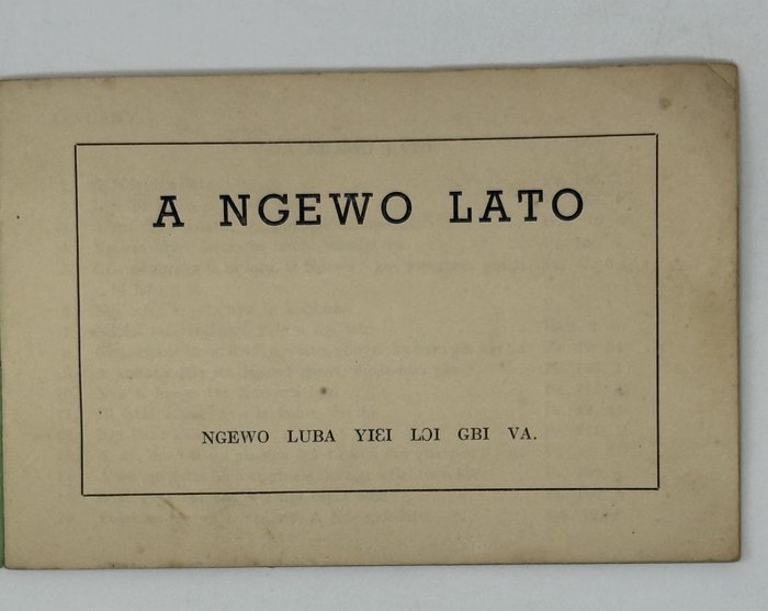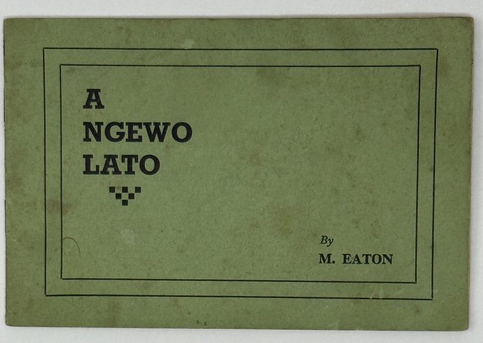 Brochure: Eaton, M. A Ngewo Lato. London: Scripture Gift Mission, n.d. Printed for Miss M. Eaton, United Brethren Mission, Sierra Leone. [28] pp. Oblong 12mo (ca. 10x15 cm or 3 ¾ x5 ¾ in). Original publisher’s wrappers.