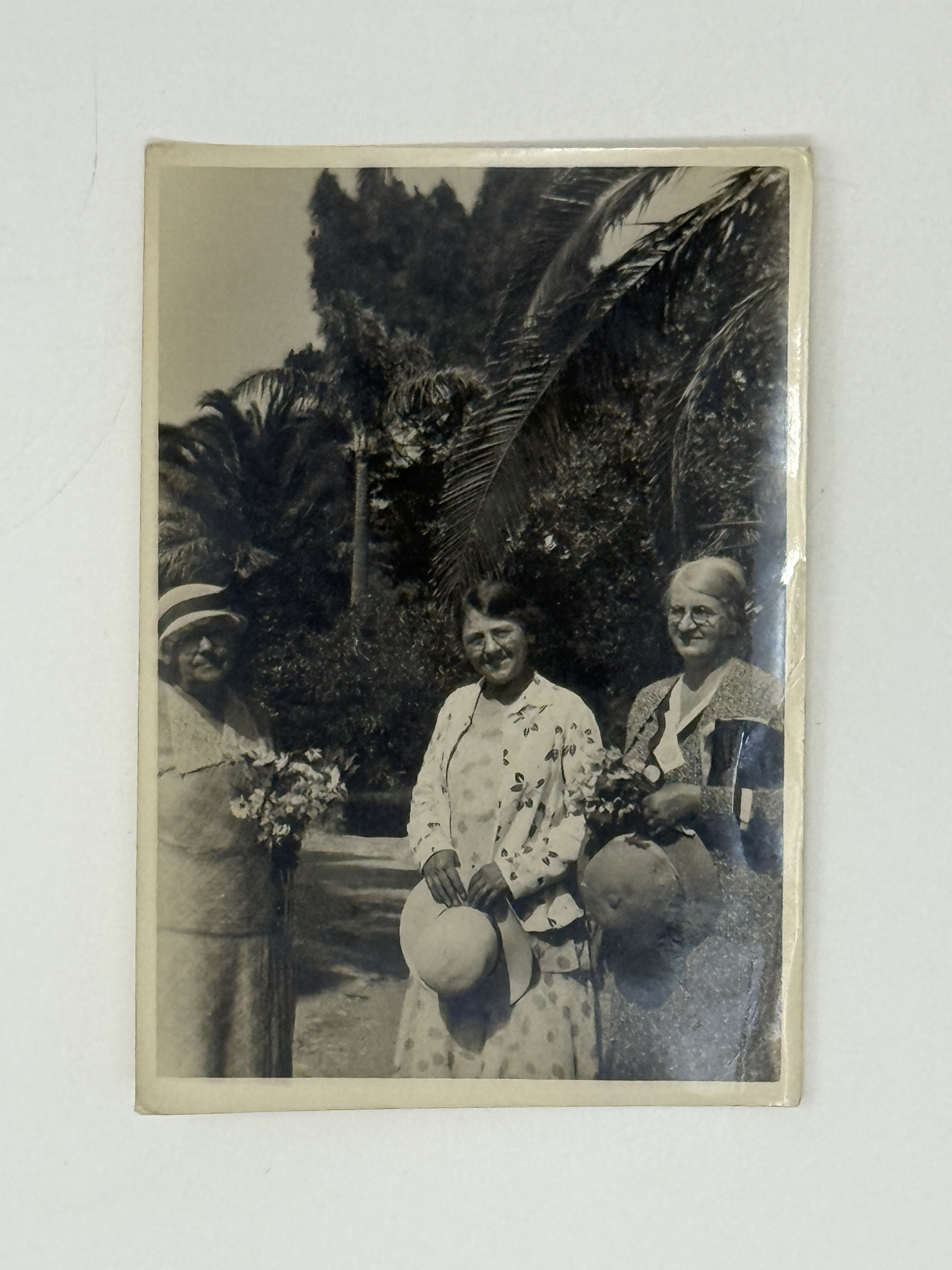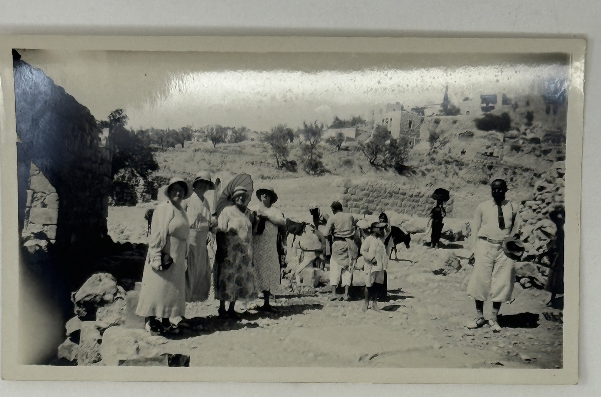 The collection of materials from the Holy Land contains classical photo and postcard views of Jerusalem, Bethlehem, Nazareth, Mount Carmel, Haifa, as well as an amateur snapshot portrait of “Miss Malick, Miss Hughes, M. Eaton, Miss Brenneman, Rev. James” posing at the “Lower Pool of Siloam, Aug. 8, 1934.”