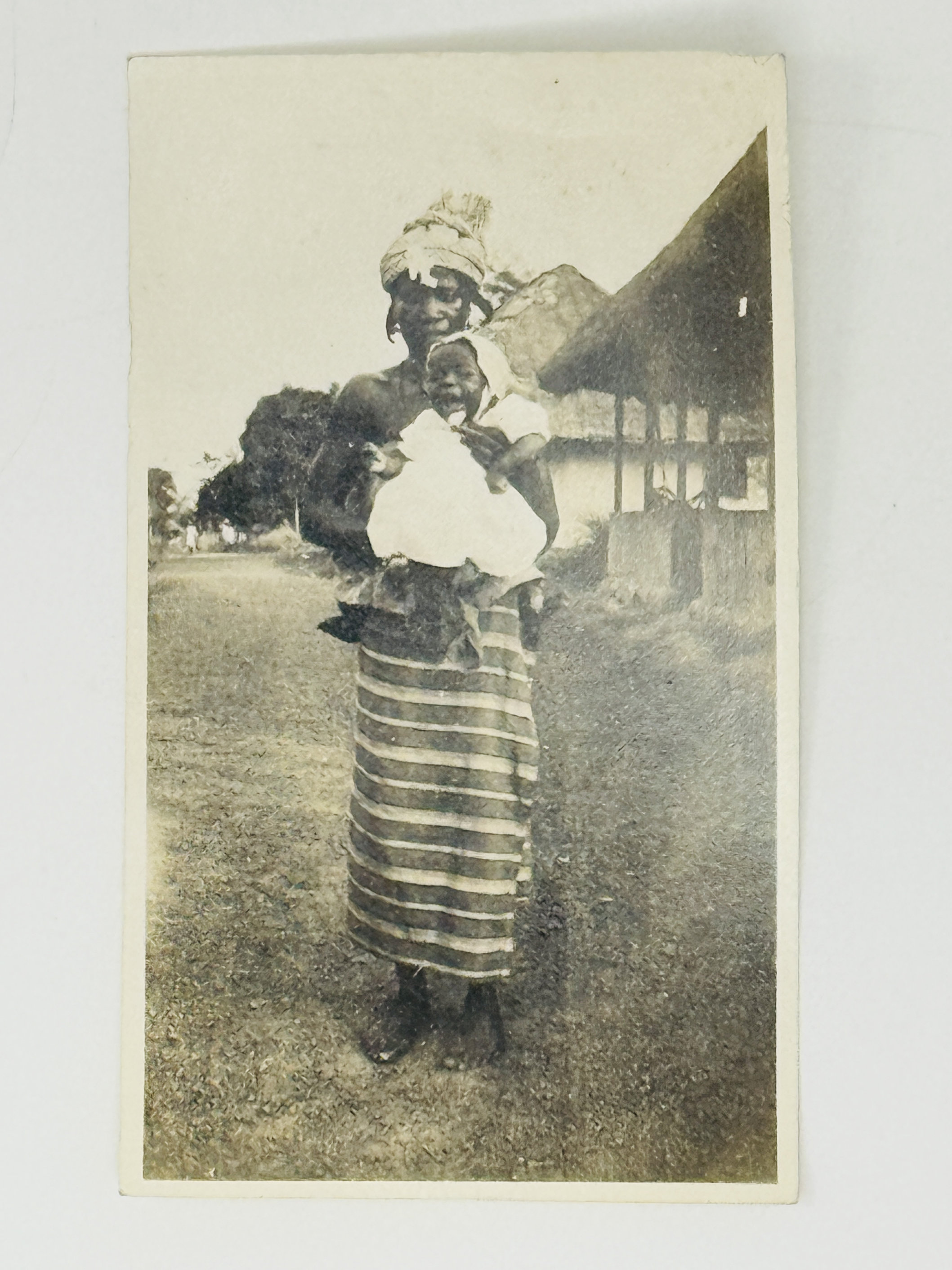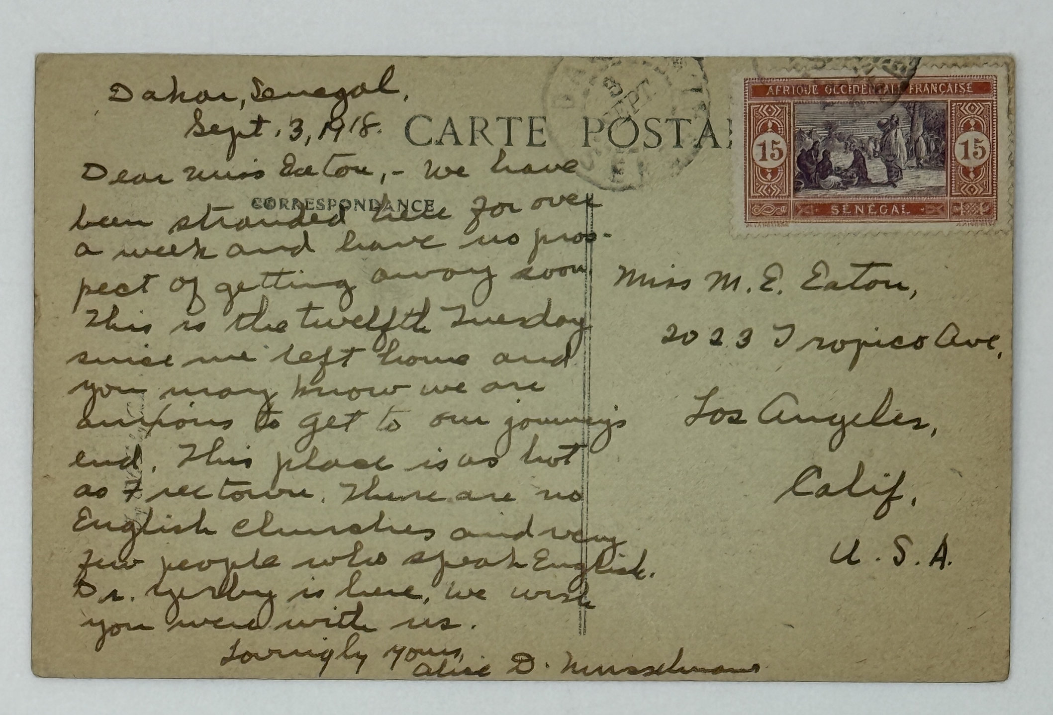 Fifteen printed postcards of French Senegal show Dakar (street views, market place, governor’s palace, railway station), Tuareg camel riders, and mothers with babies from different ethnicities. One of the postcards contains a letter to “Miss M.E. Eaton, 2023 Tropics Ave., Los Angeles, Calif.” from a noted United Brethren’s missionary Alice N. Musselman (née Dougherty, 1883-1965), who served in Sierra Leone for forty years (1907-1947). In the letter, dated September 3, 1918, she wrote that they “have been stranded here for over a week now and have no prospect of getting away soon. This is the twelfth Tuesday since we left home and you may know we are anxious to get to our journey’s end. This place is as hot as Freetown. There are no English churches and very few people who speak English…”